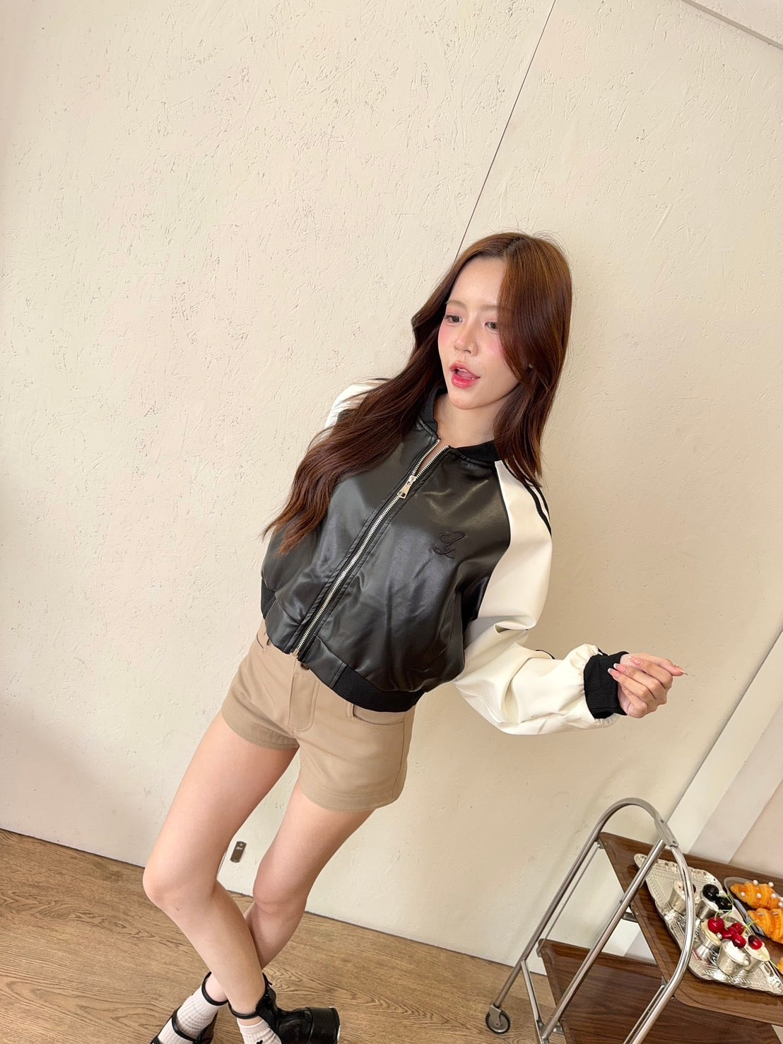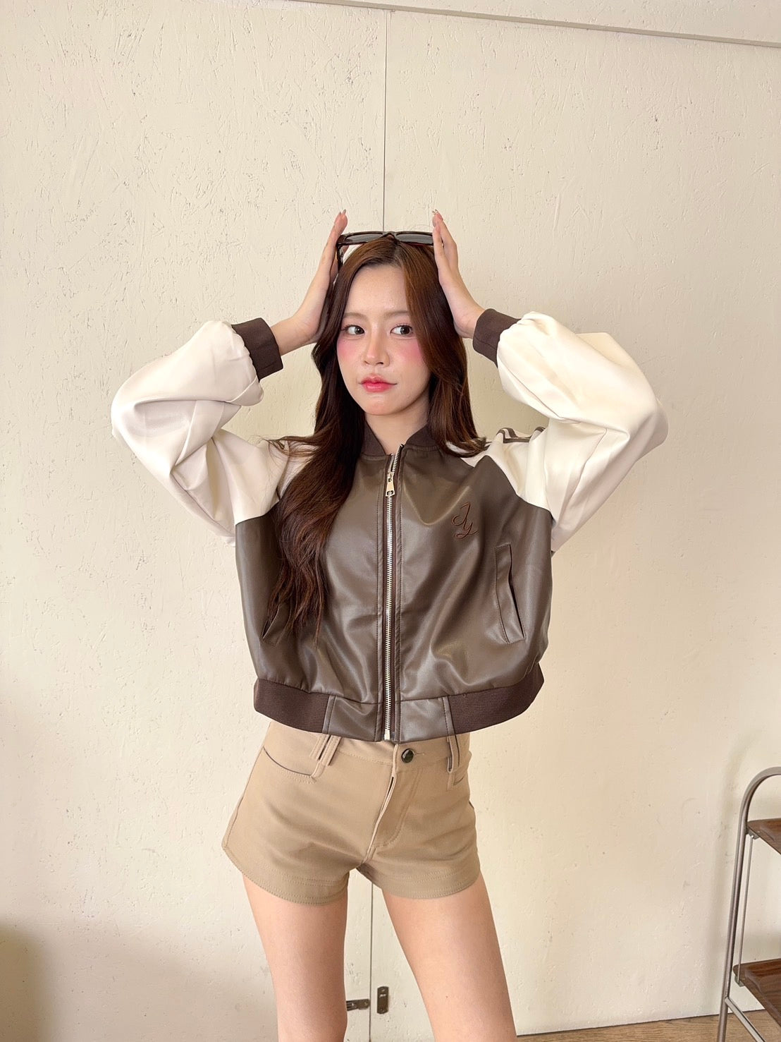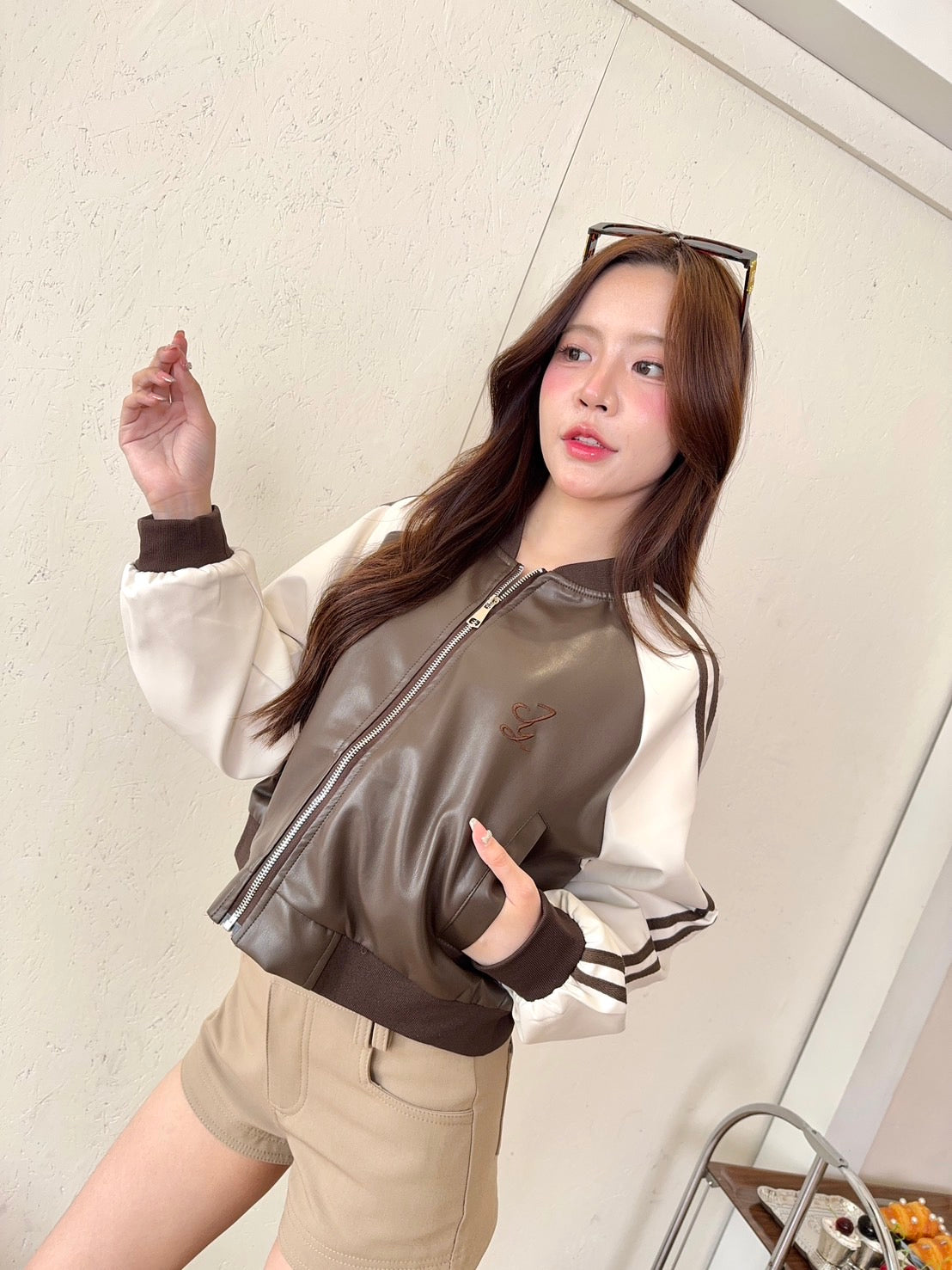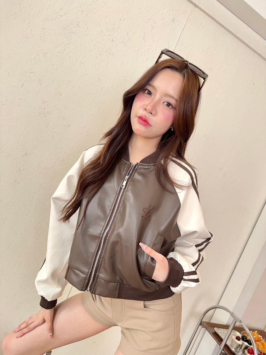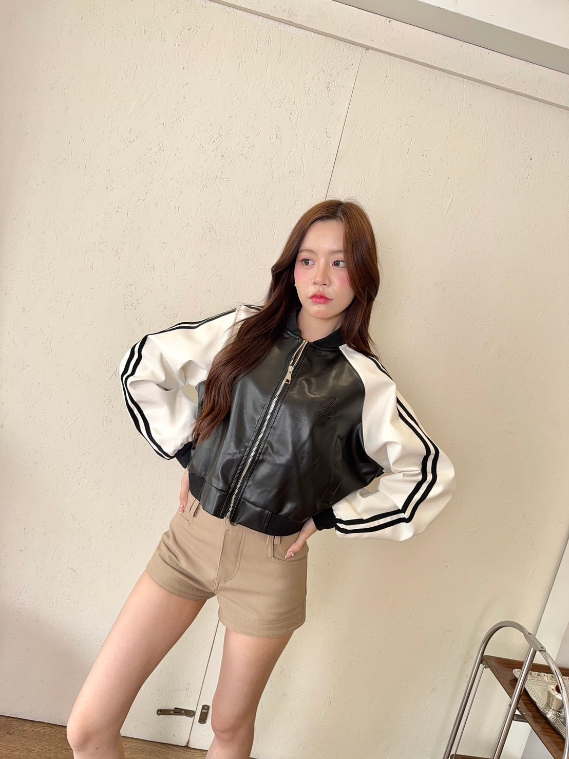 Two-tone faux leather jacket with side stripes and bold JY embroidery โ timeless style that never goes out of fashion! ๐