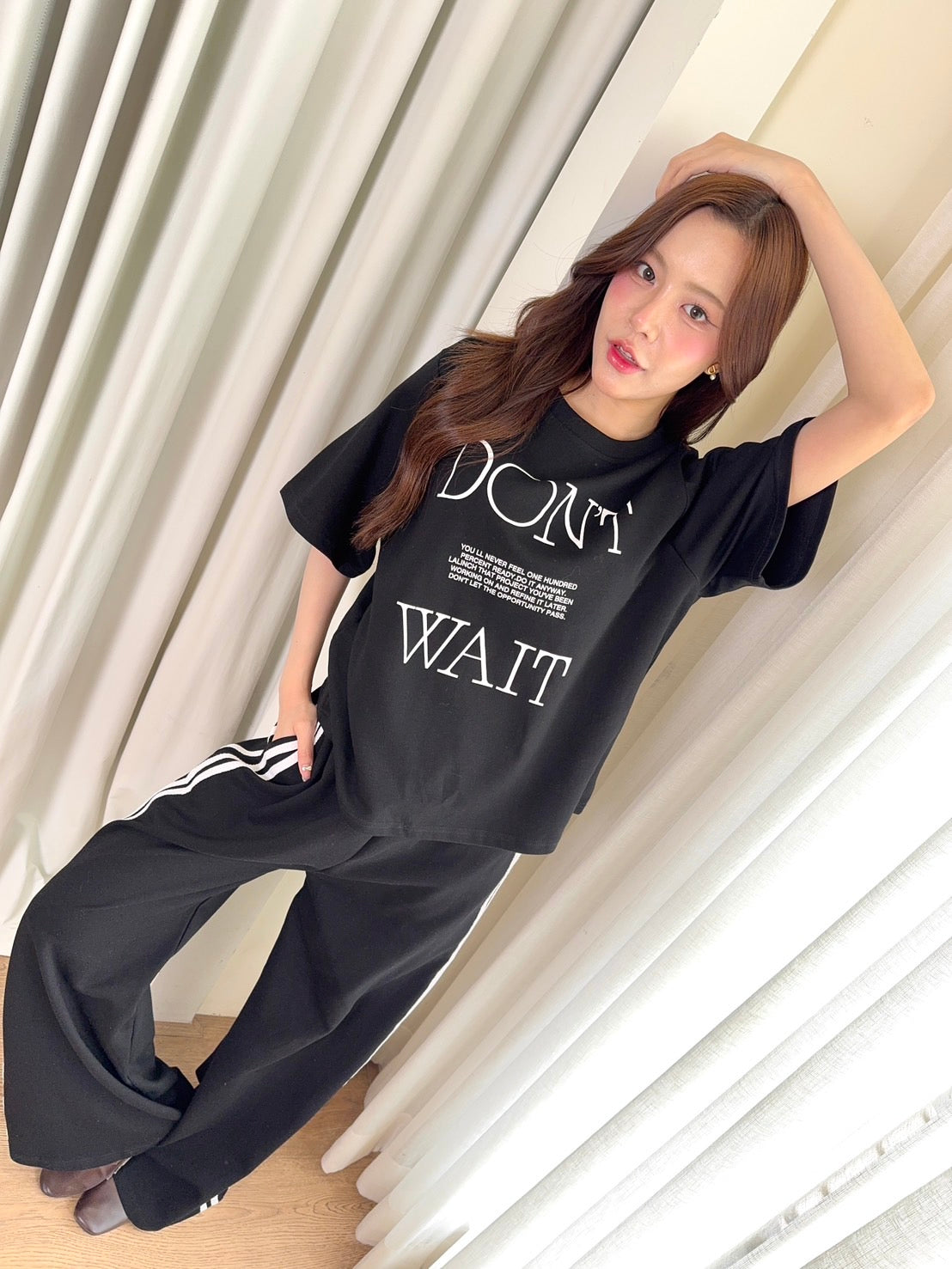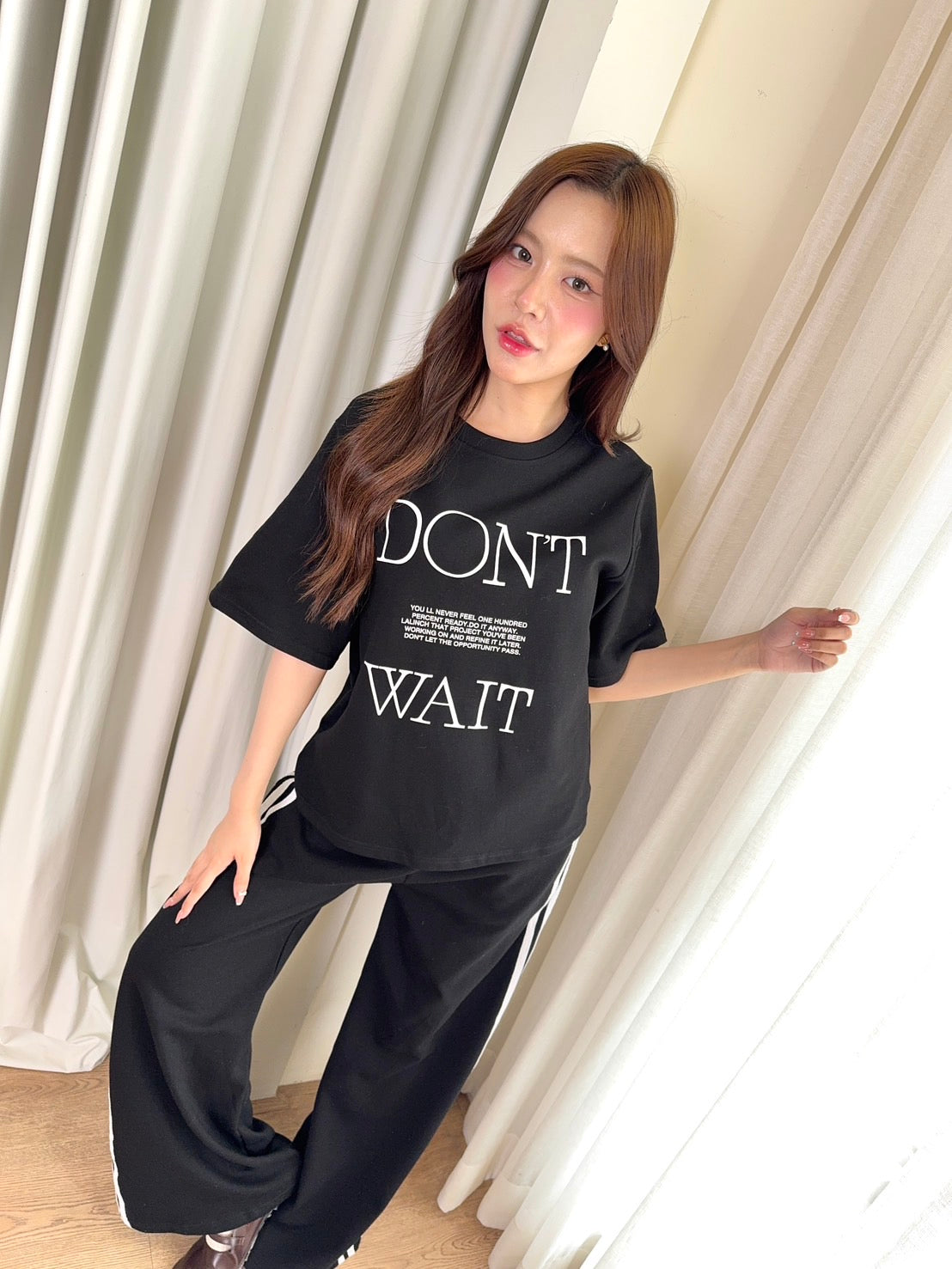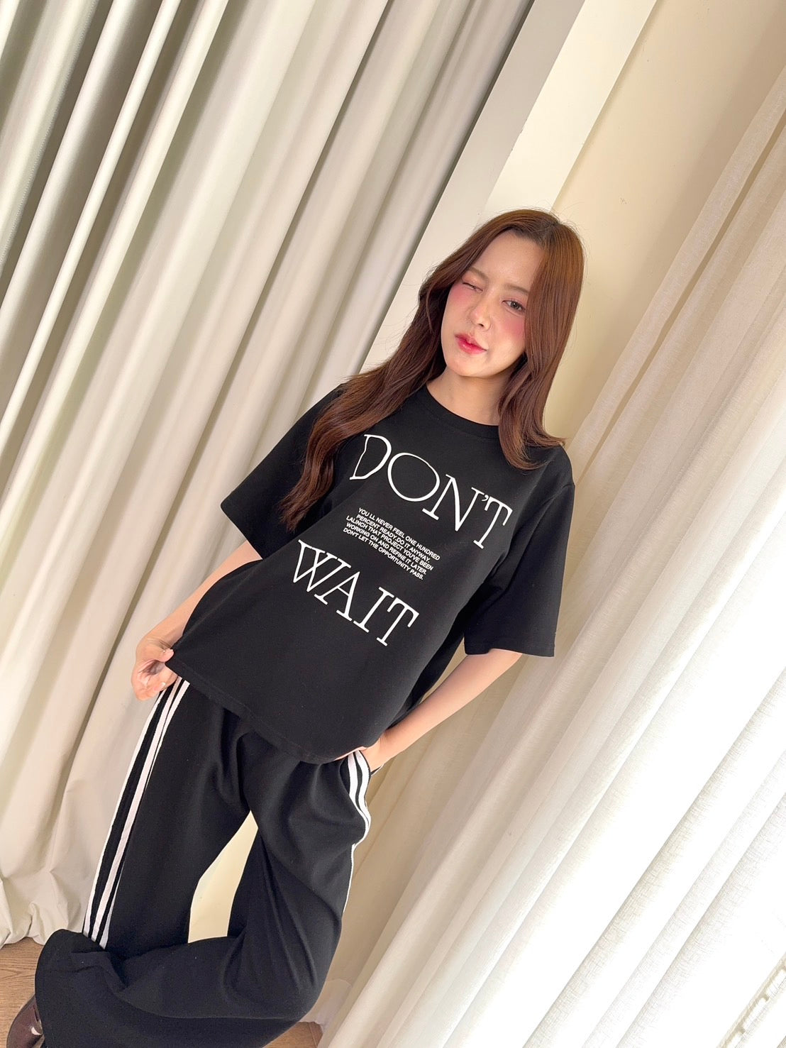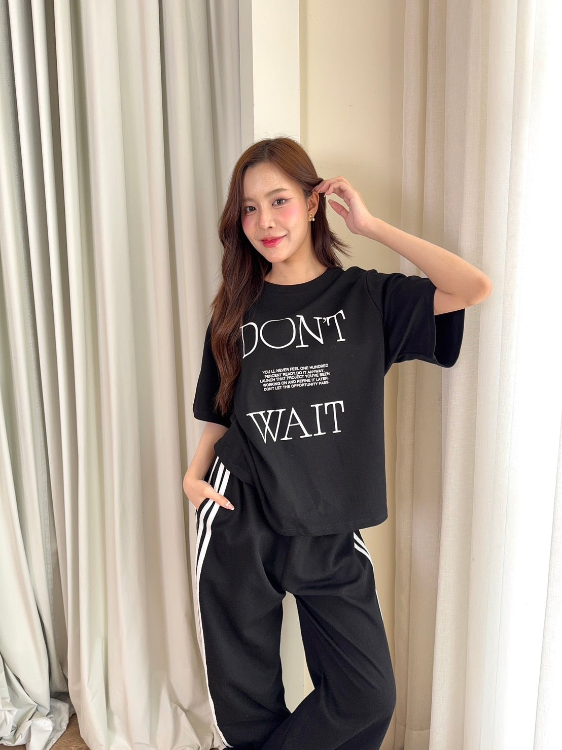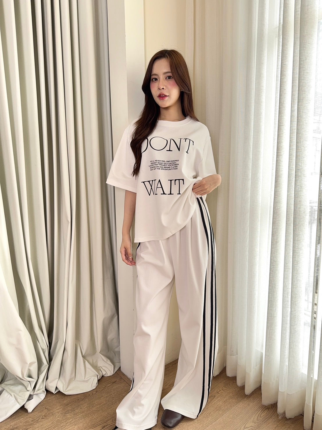 🖋️ Paired with long pants featuring side stripes & “Don’t” print