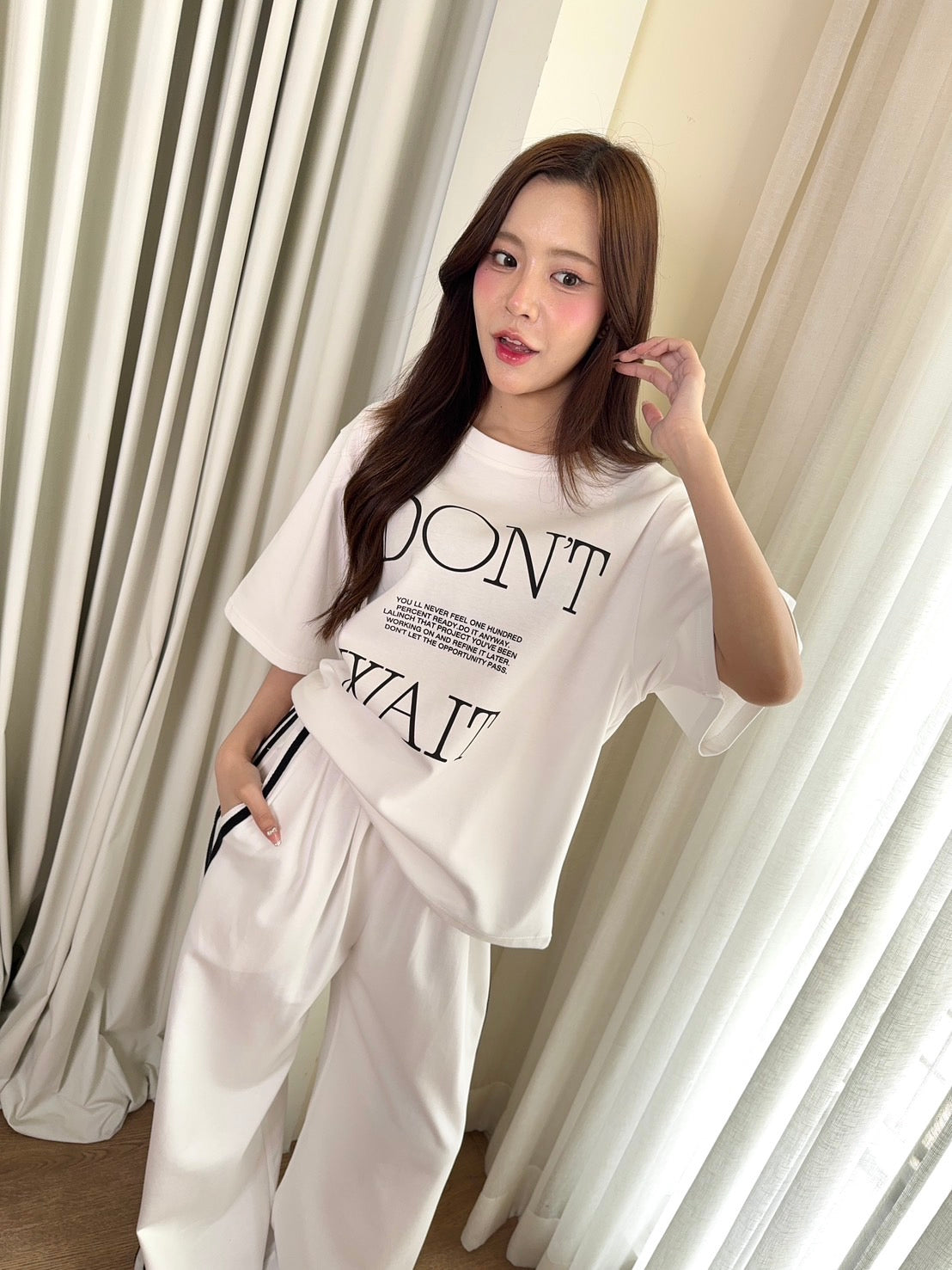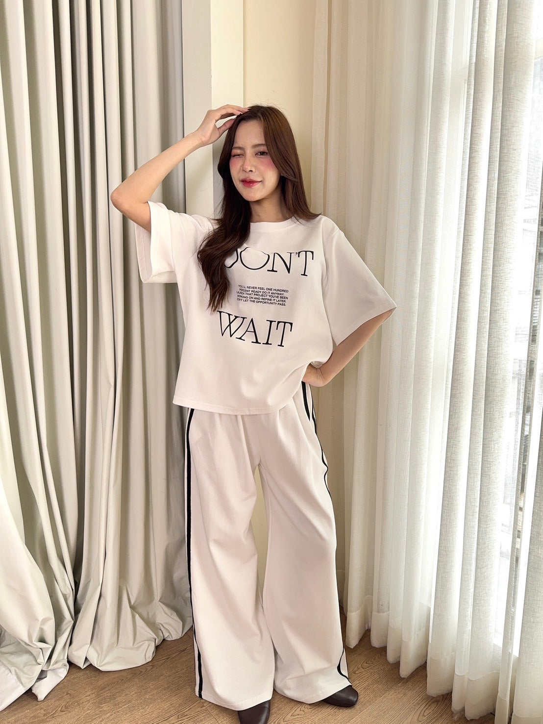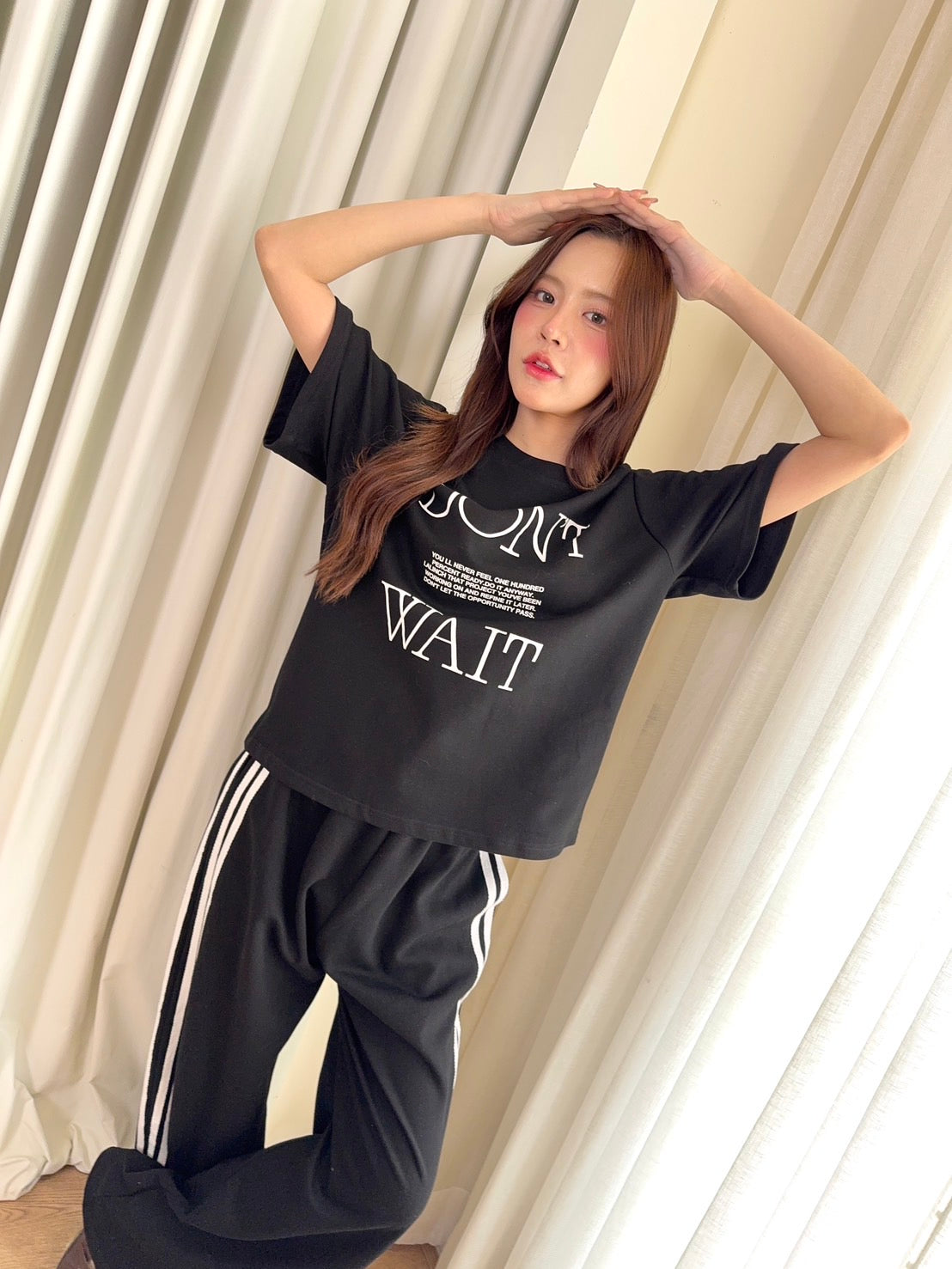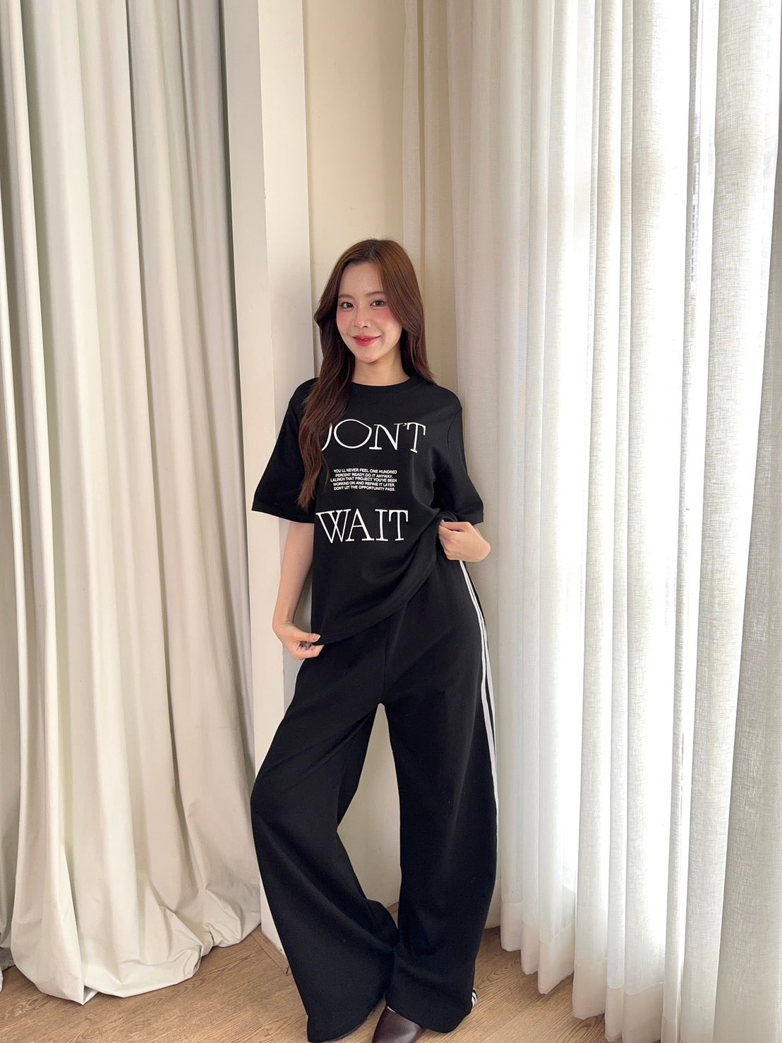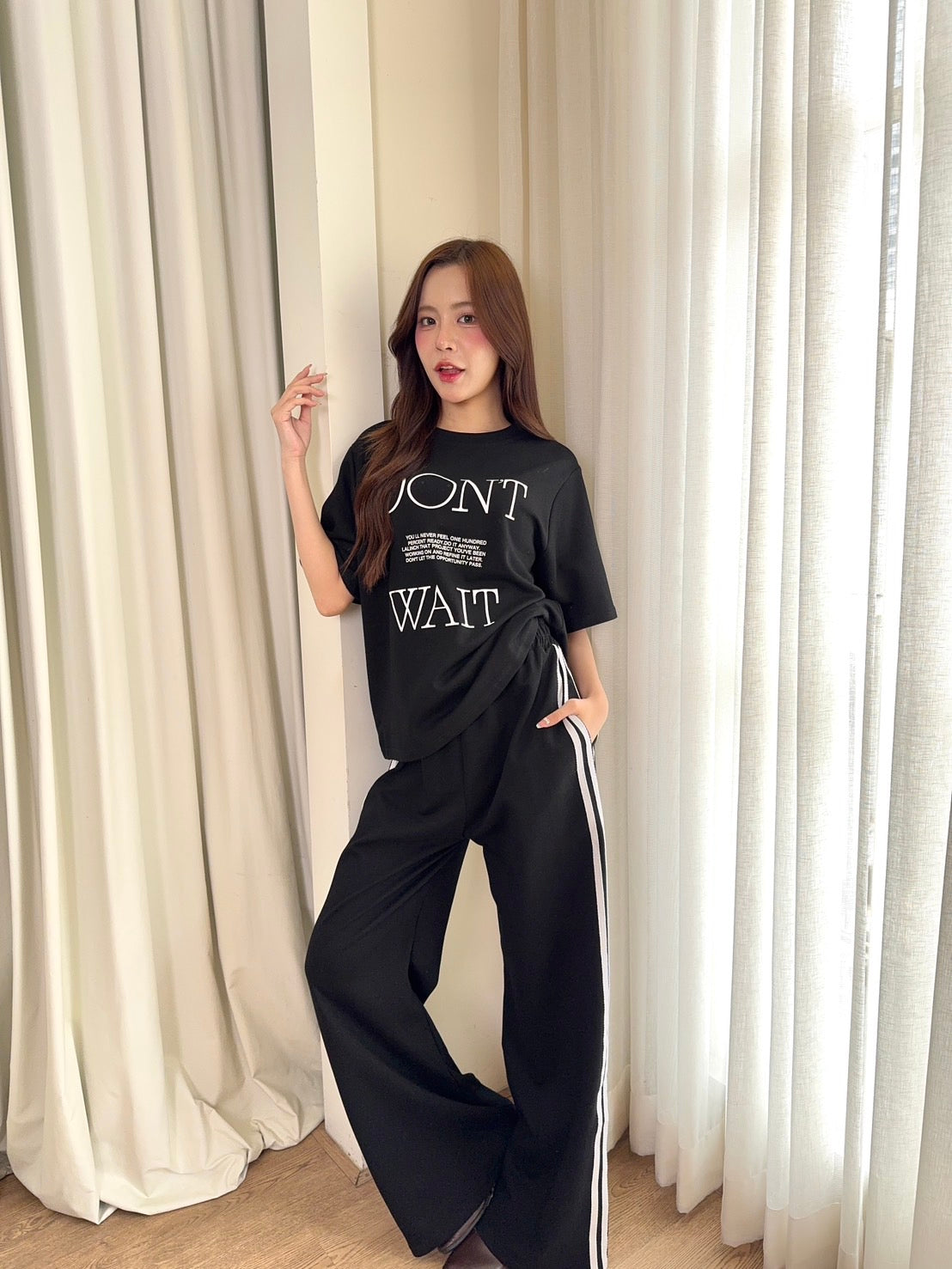 🖋️ Paired with long pants featuring side stripes & “Don’t” print