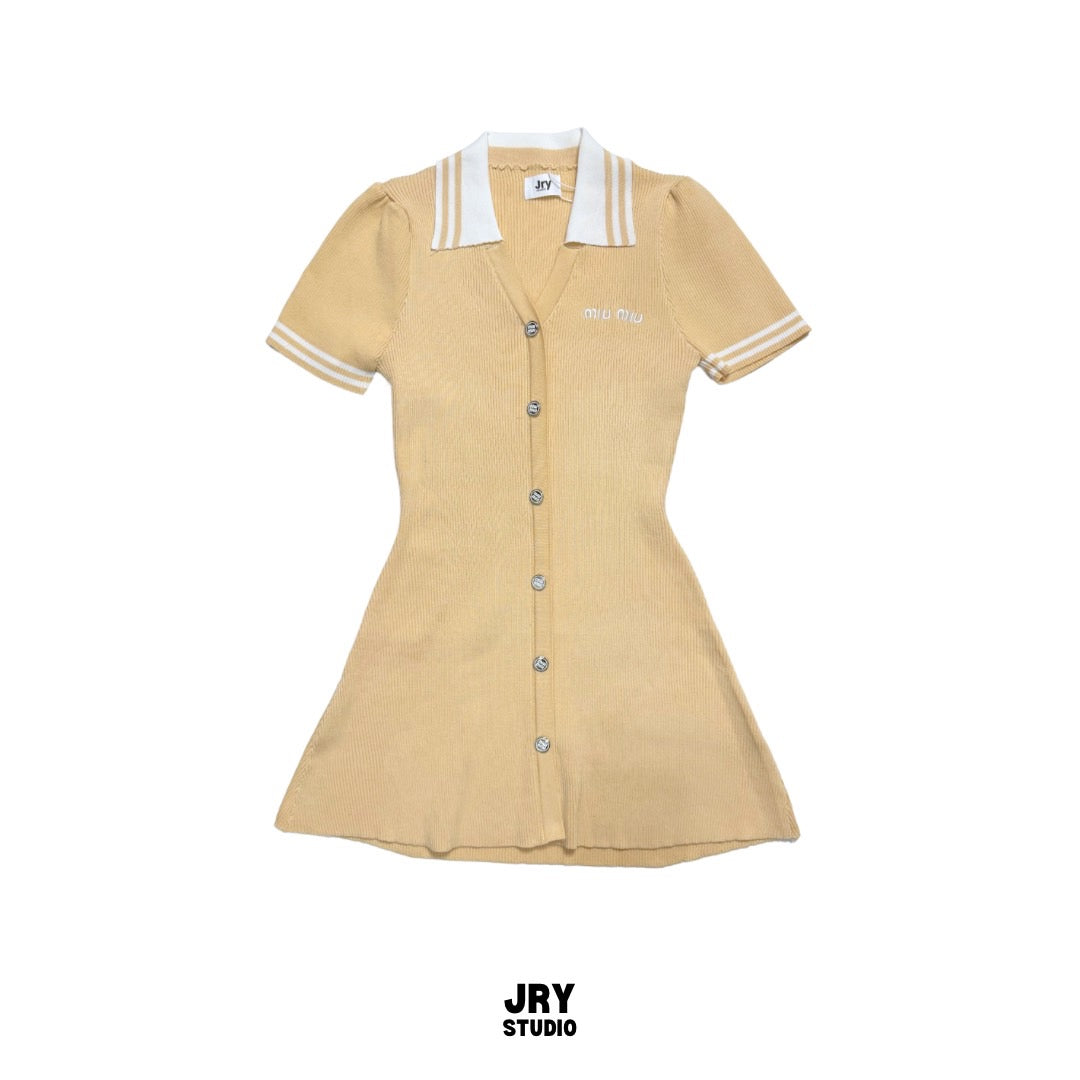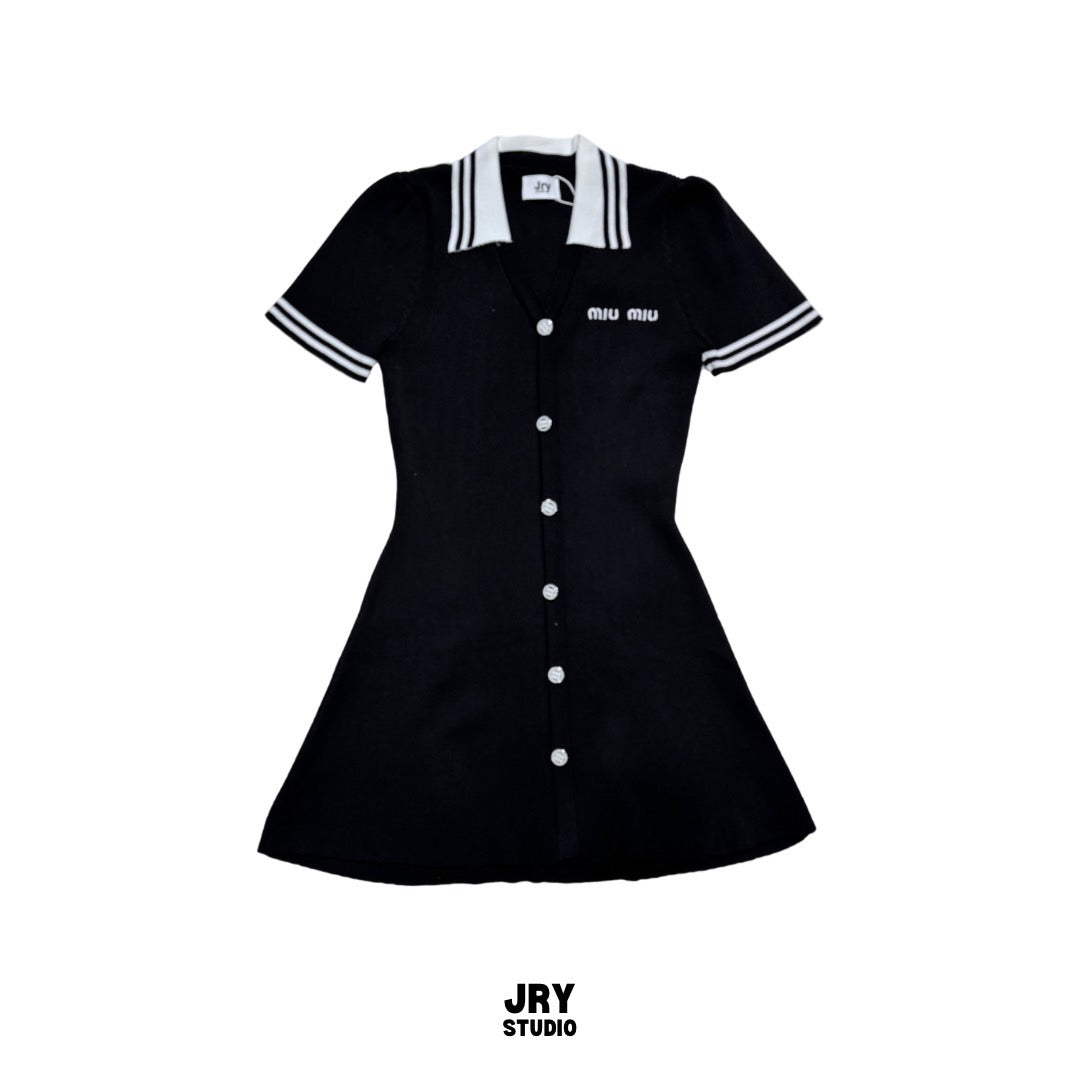 Stay stylish this season with this adorable short-sleeve knit dress featuring a collar, button details, and Miu Miu-inspired embroidery.