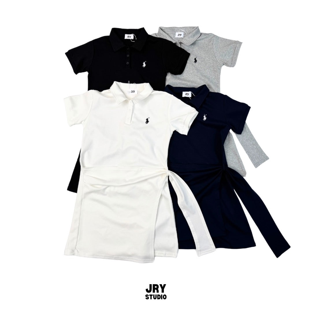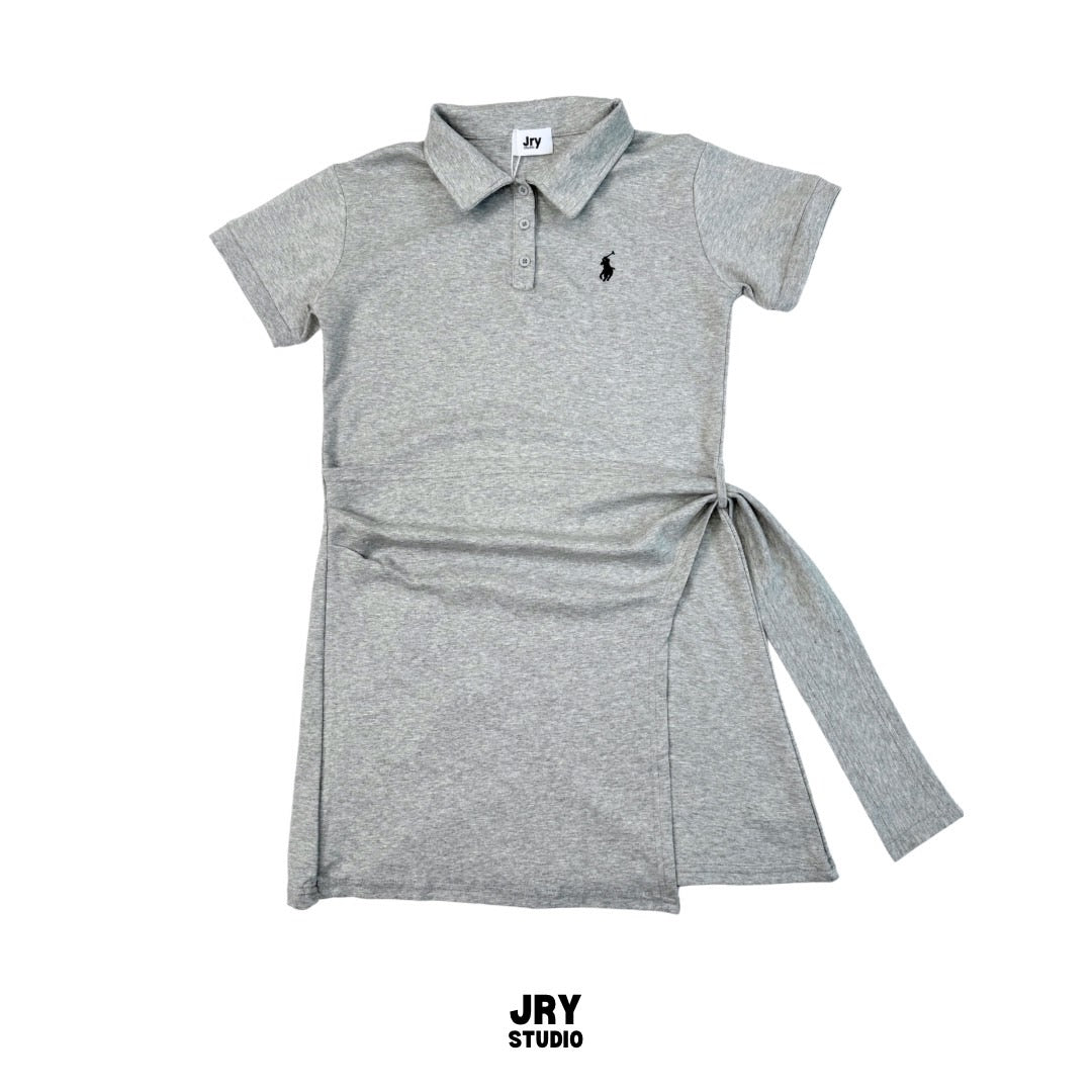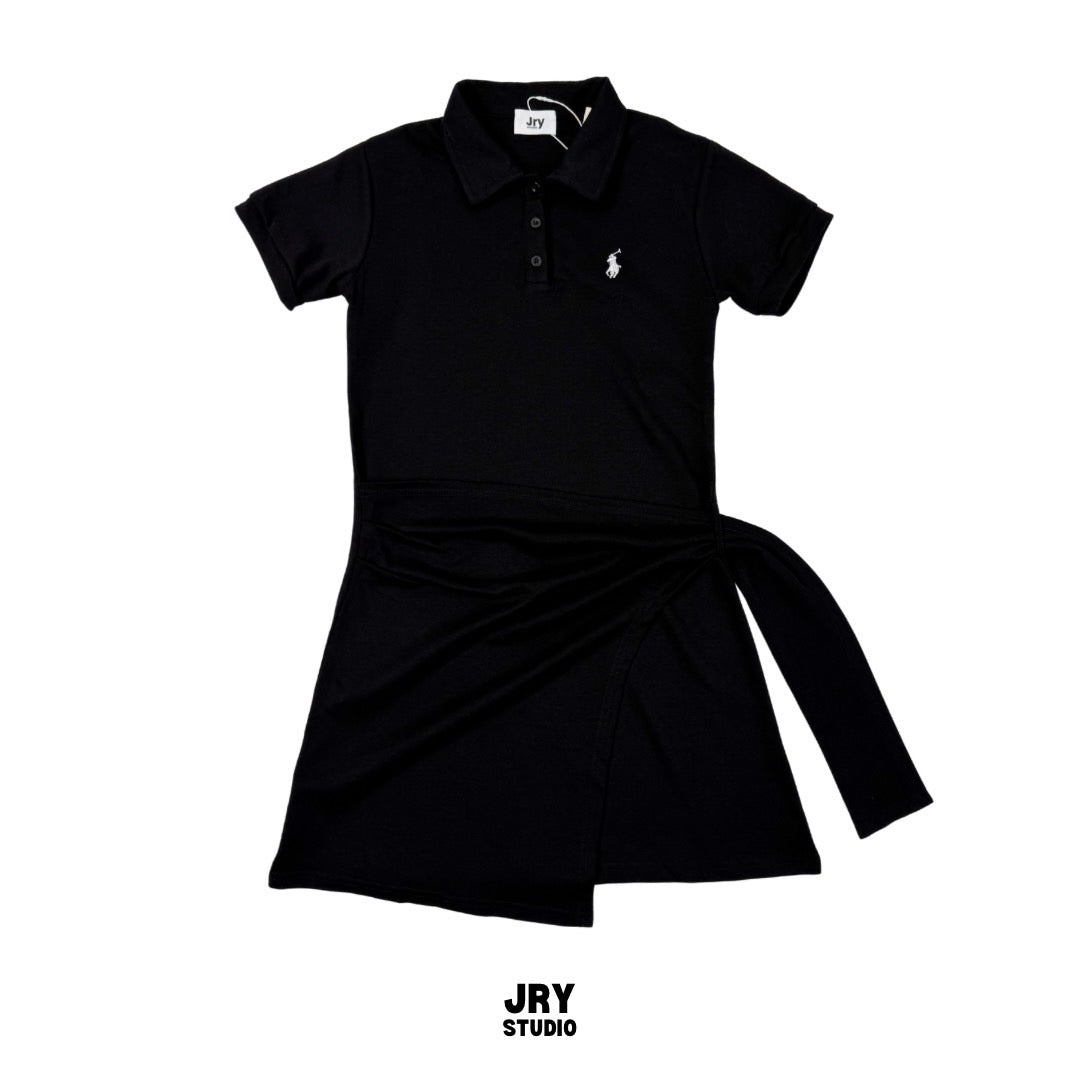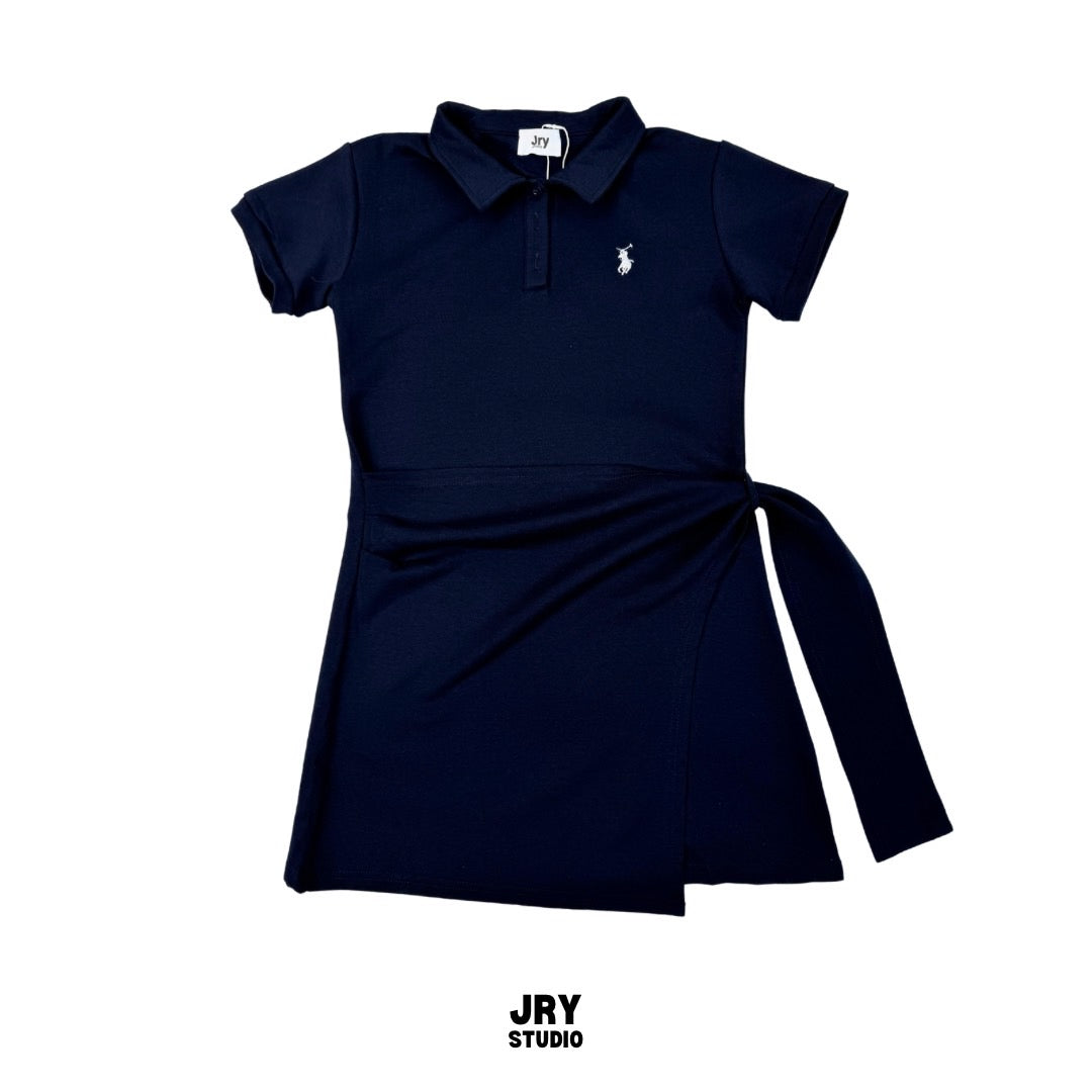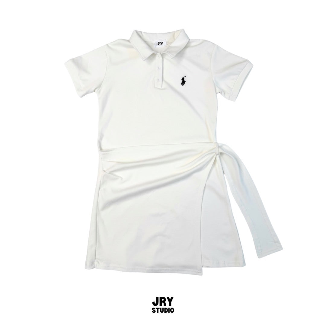 Short-sleeve polo collar dress with crossover side-tie and Polo embroidery.