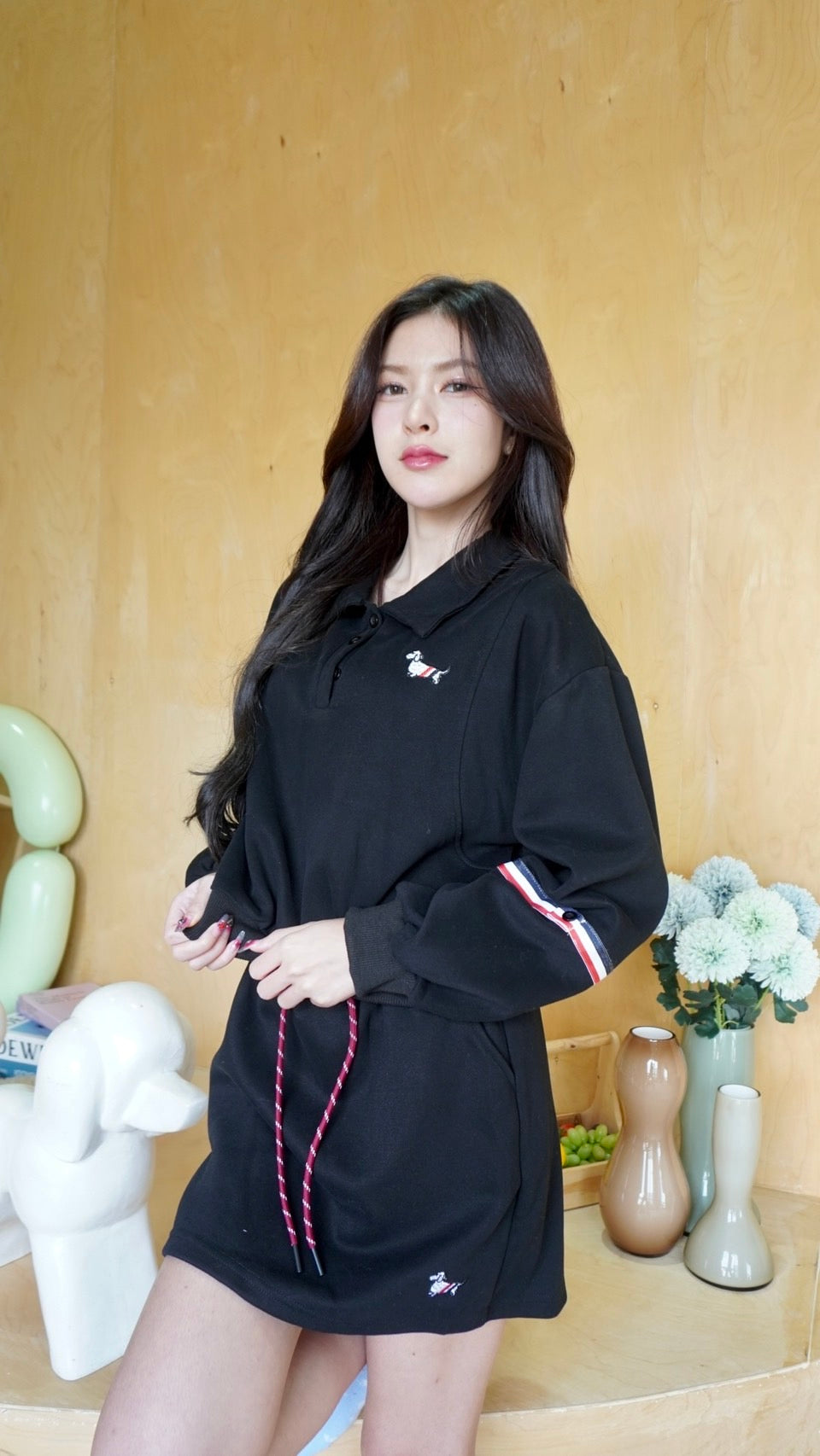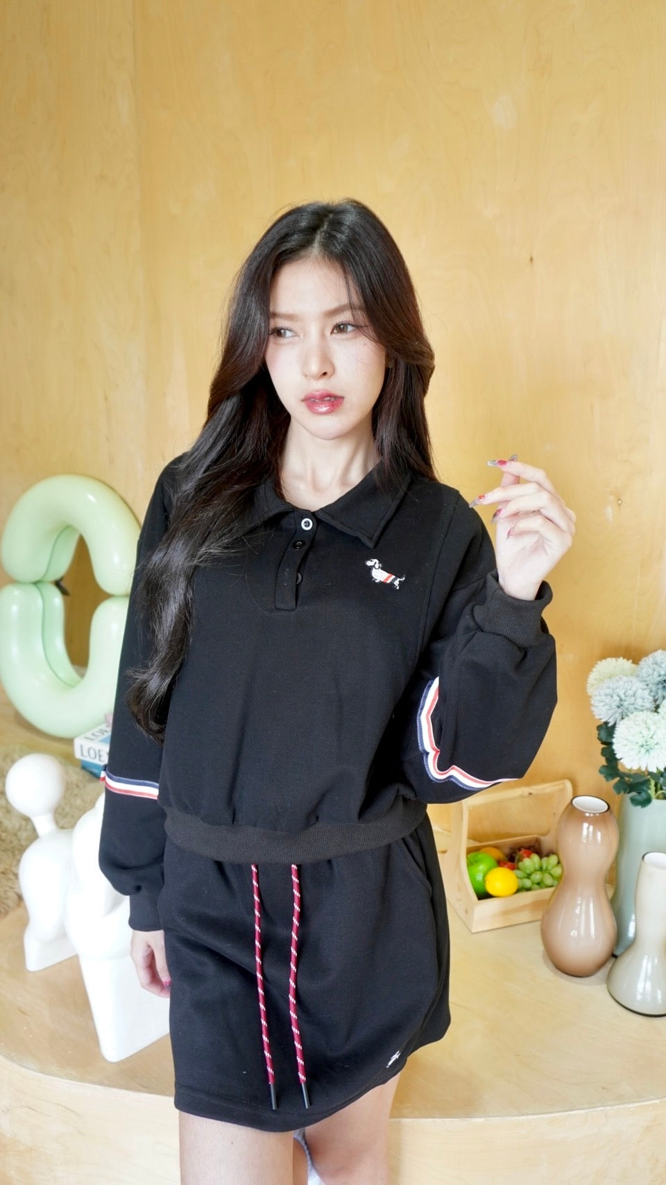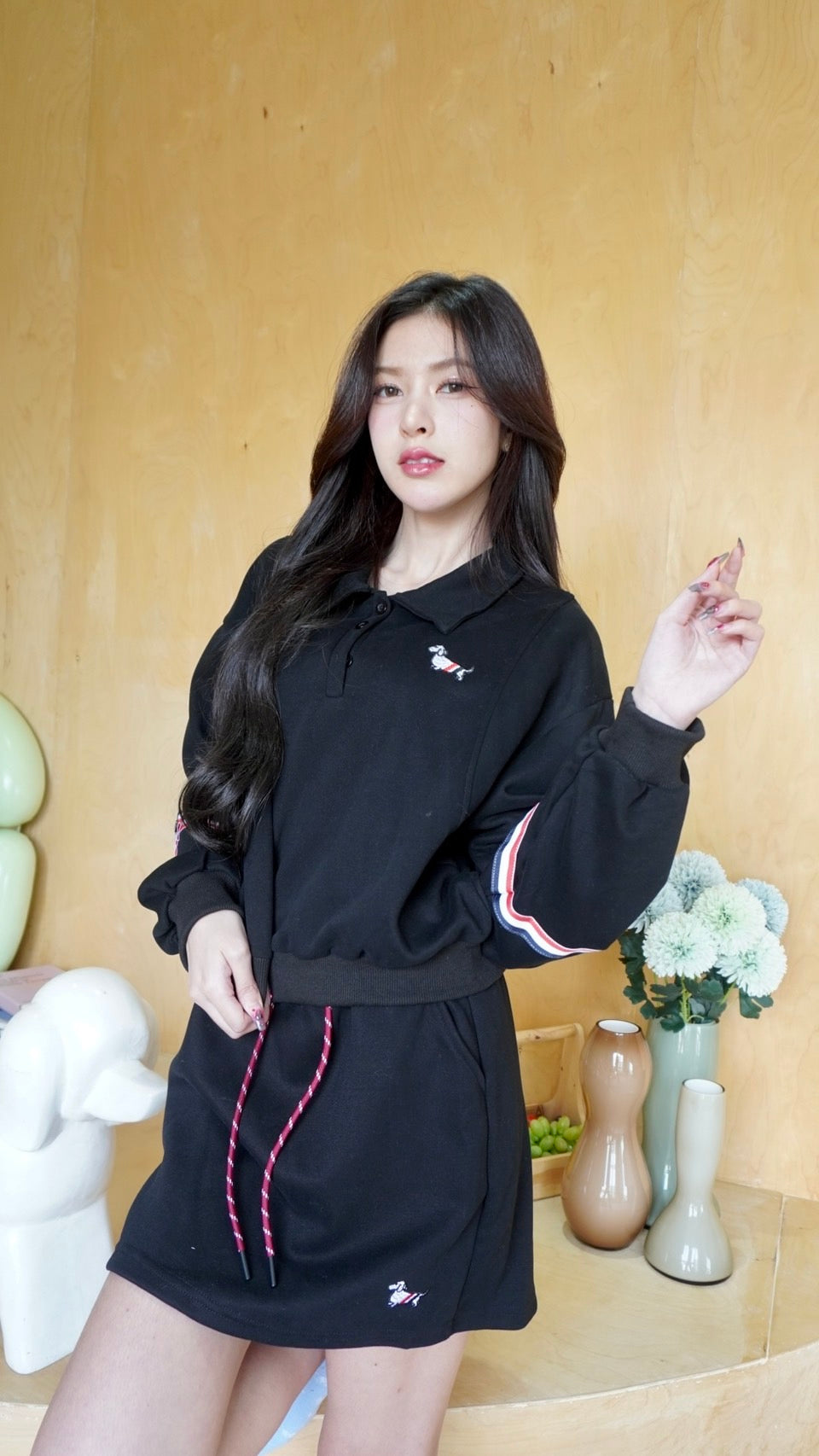 2-Piece Set: Long-sleeve top + Mini skirt with embroidered puppy design