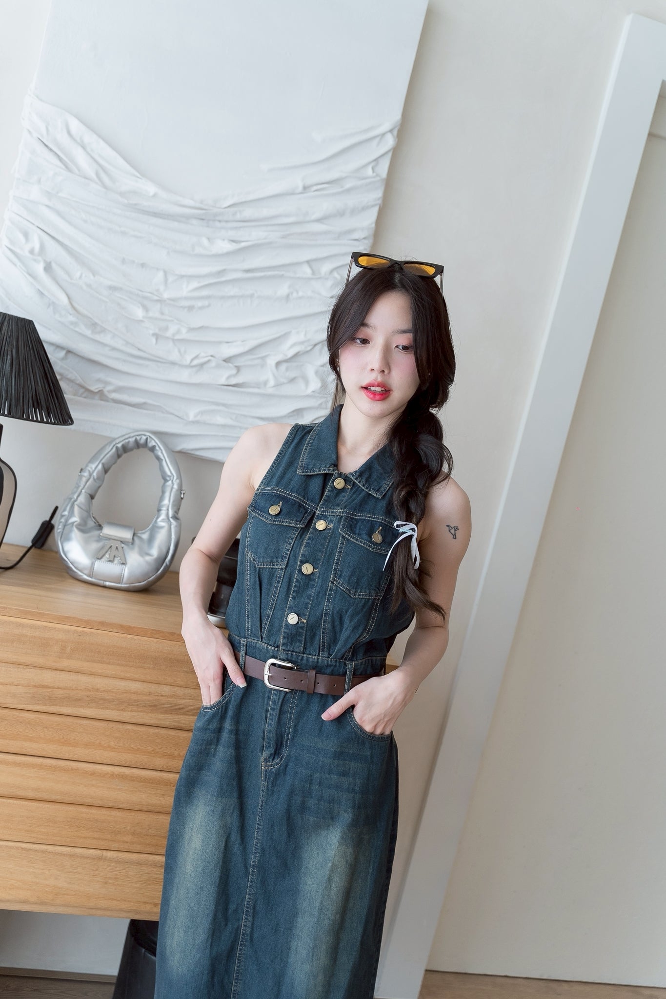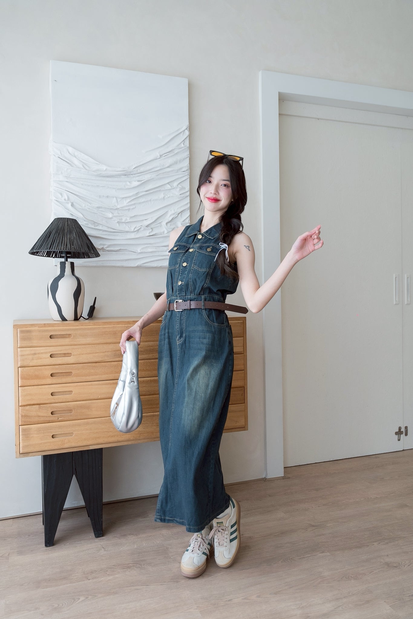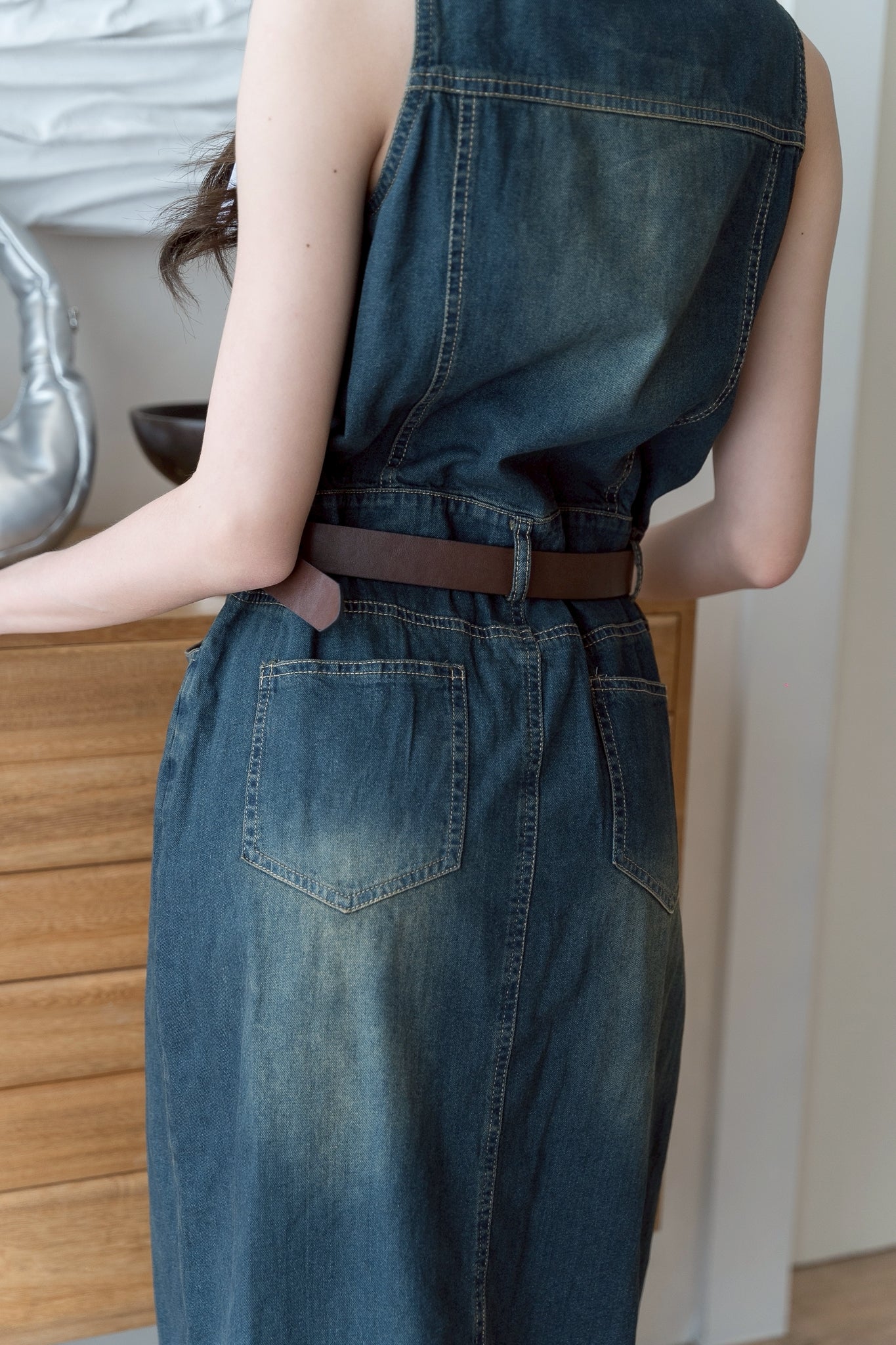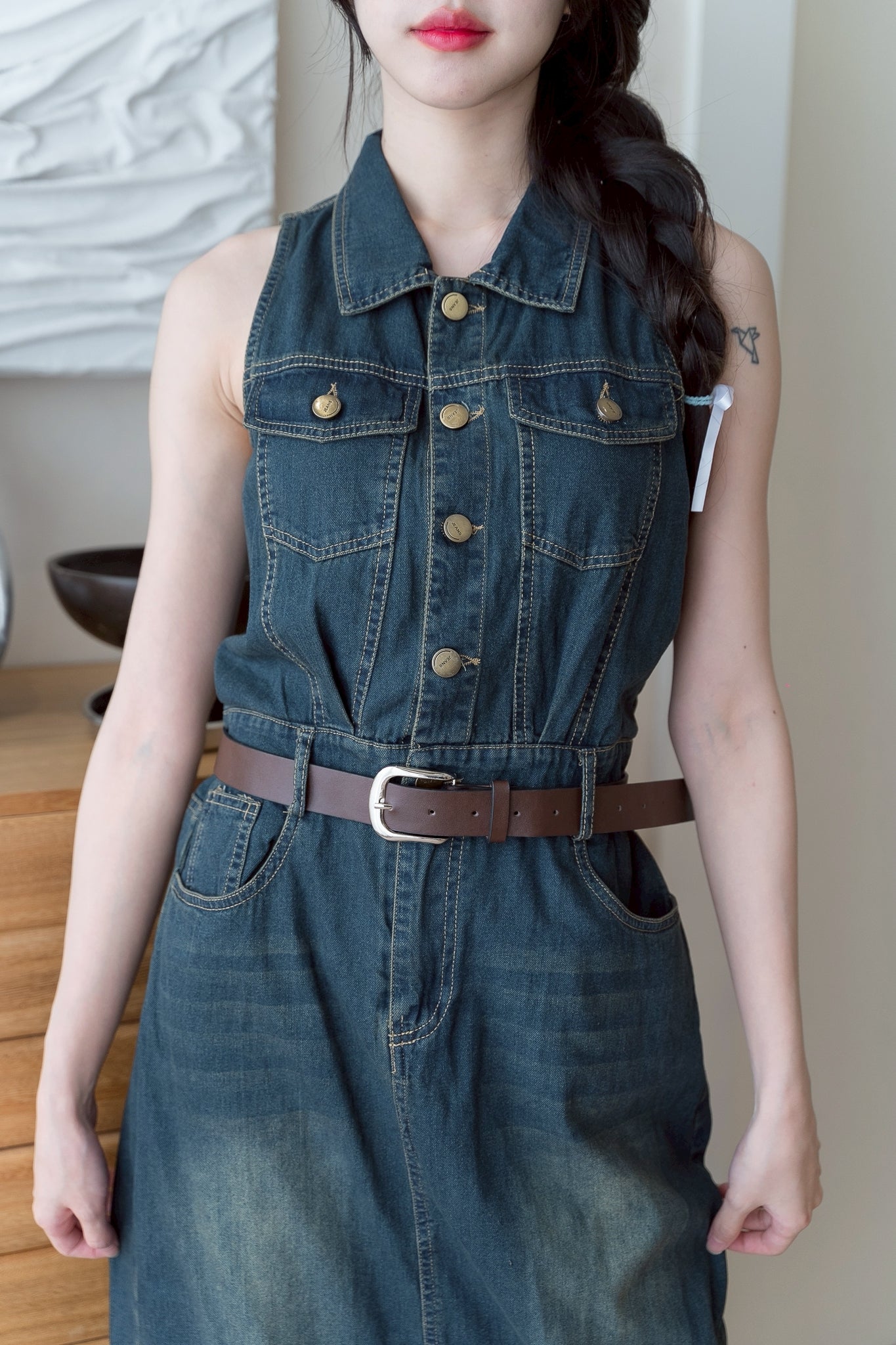 💛 Sleeveless denim dress with a collar, long length, and belt.