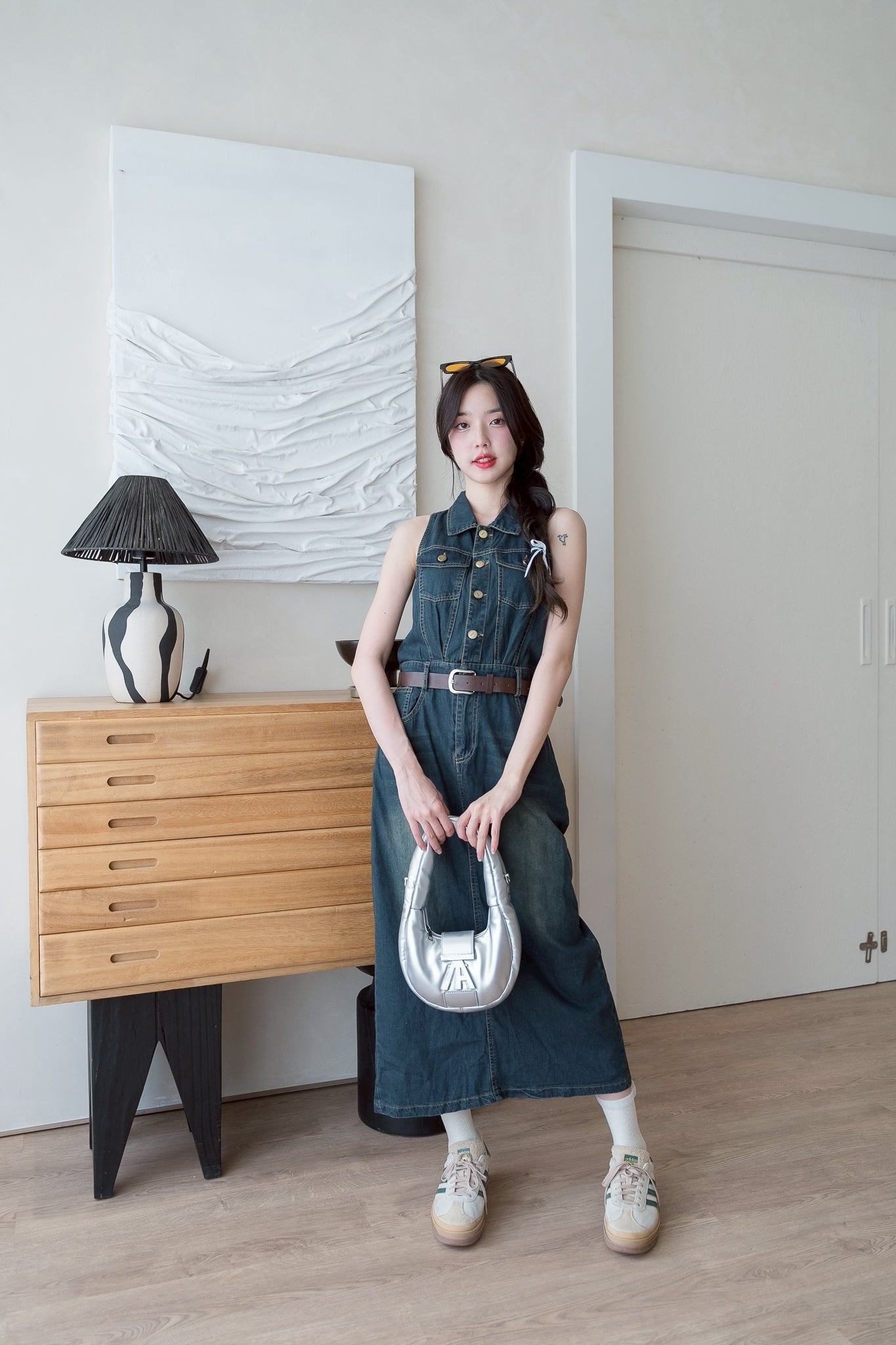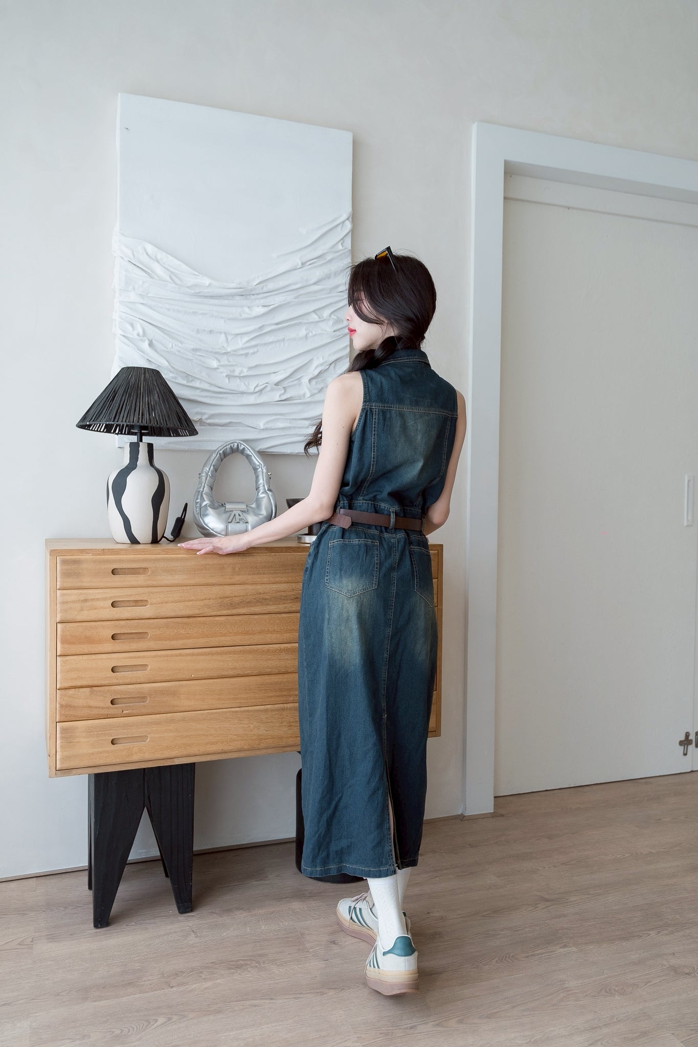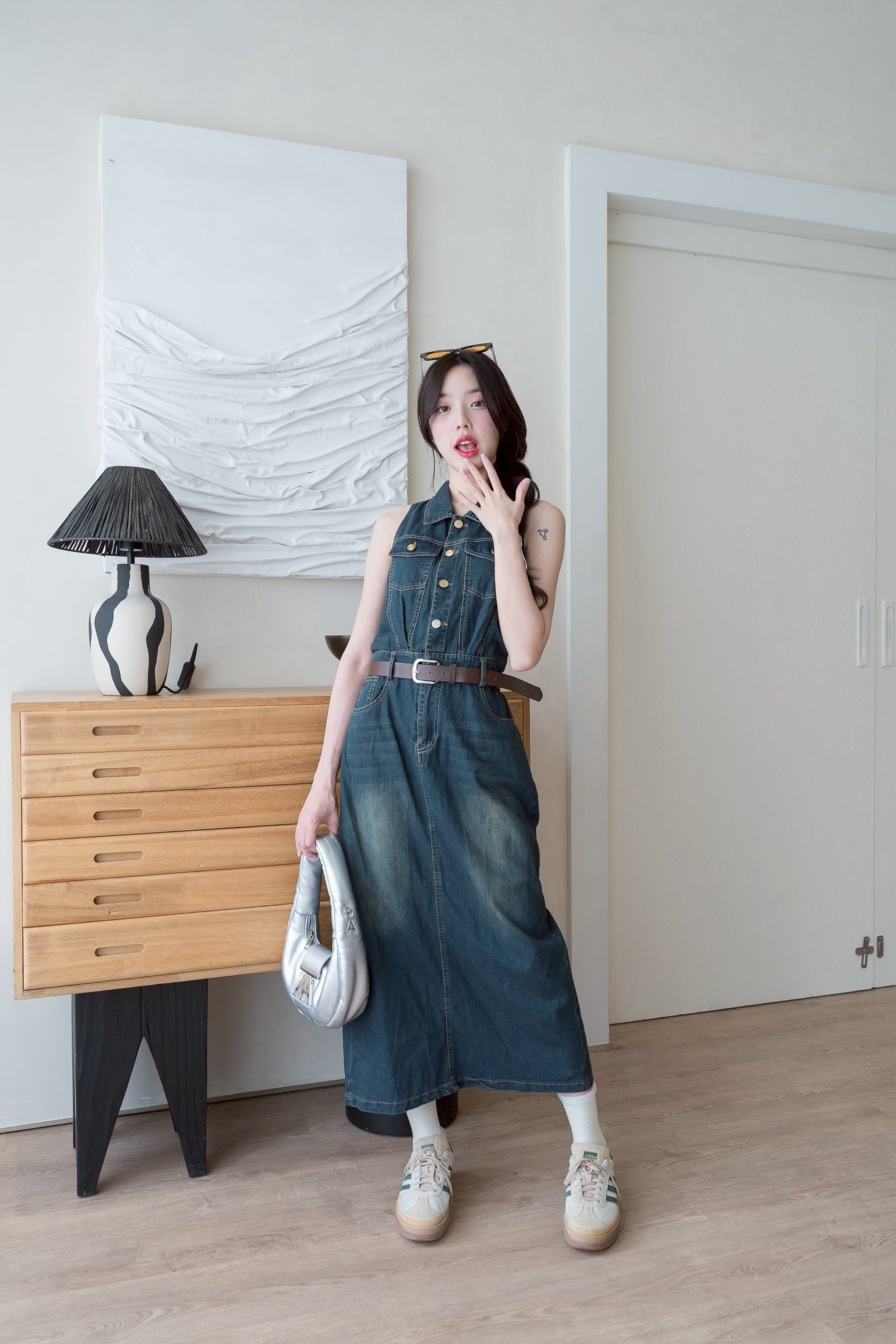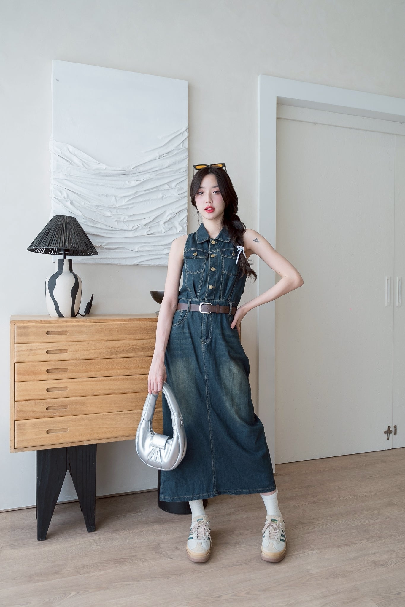 💛 Sleeveless denim dress with a collar, long length, and belt.