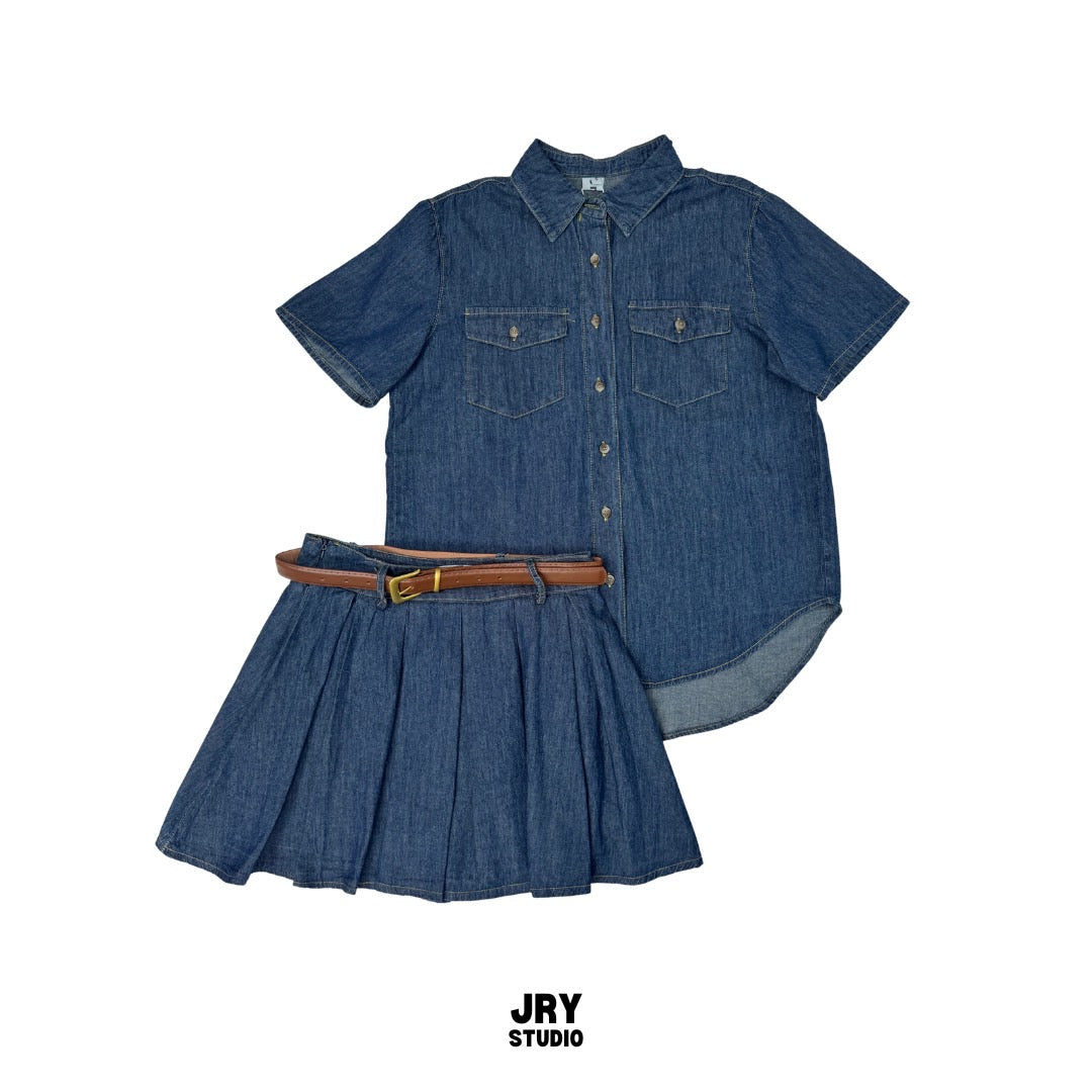 3-piece set: Short-sleeved shirt + Pleated denim skirt + Leather belt
