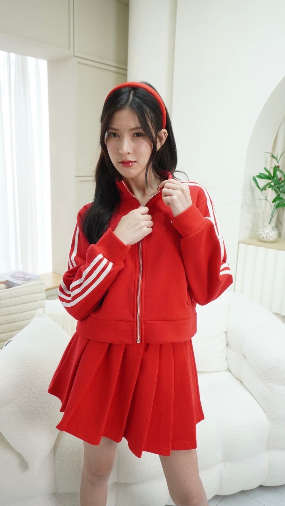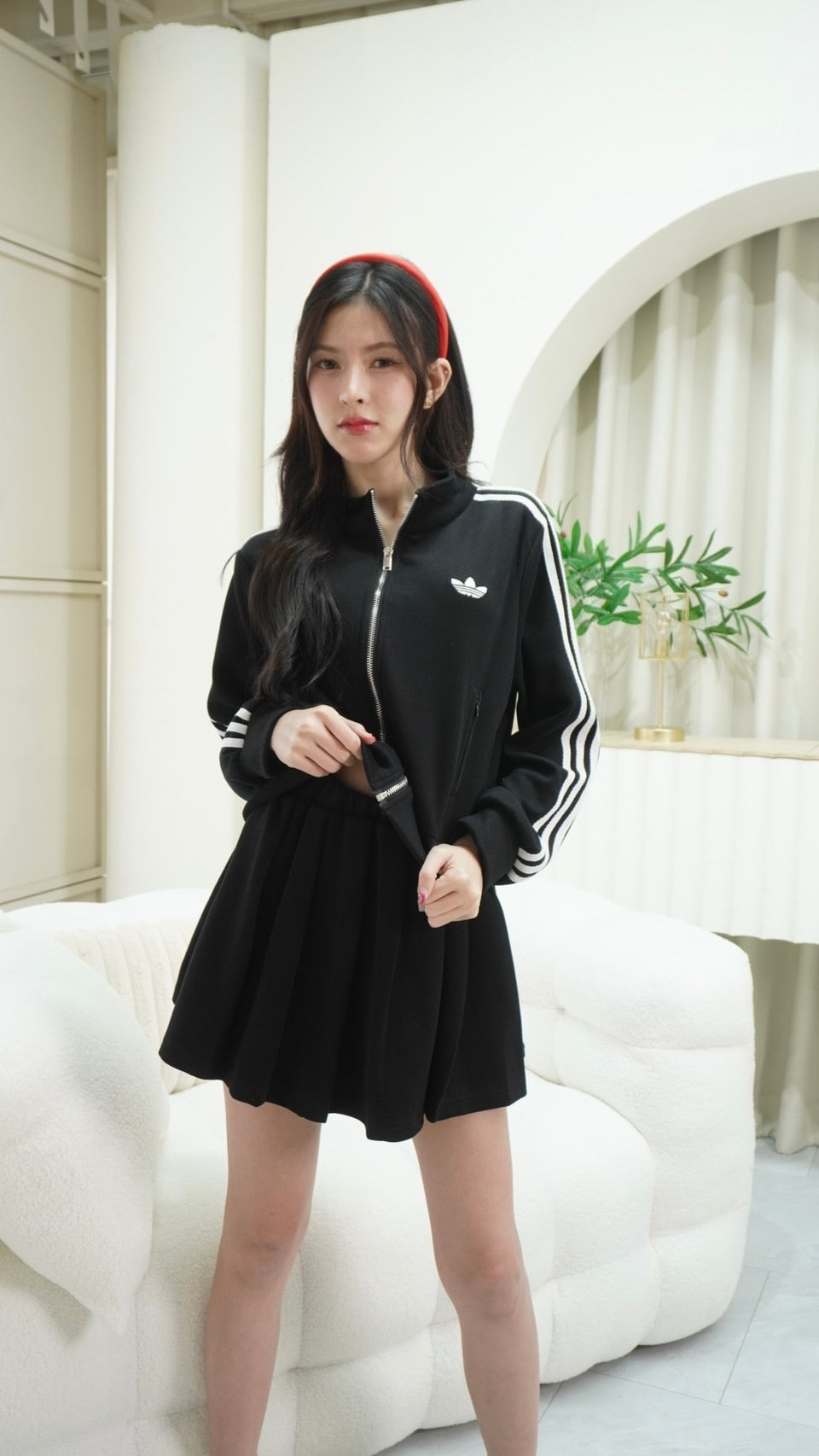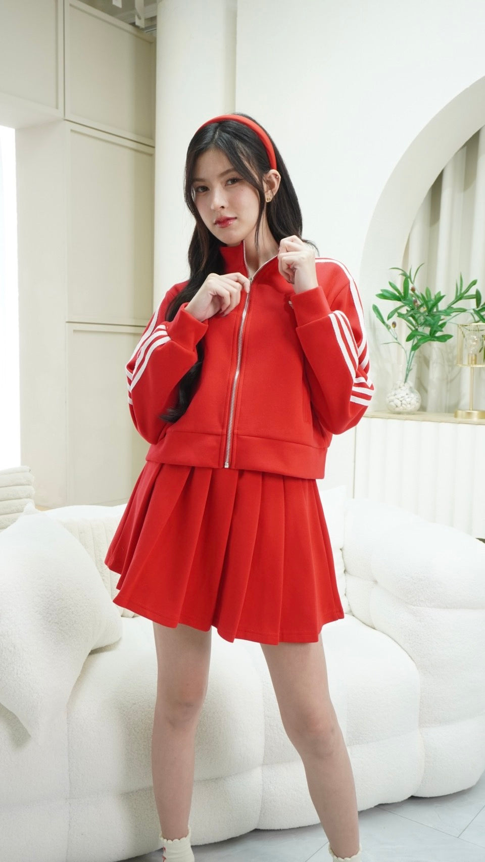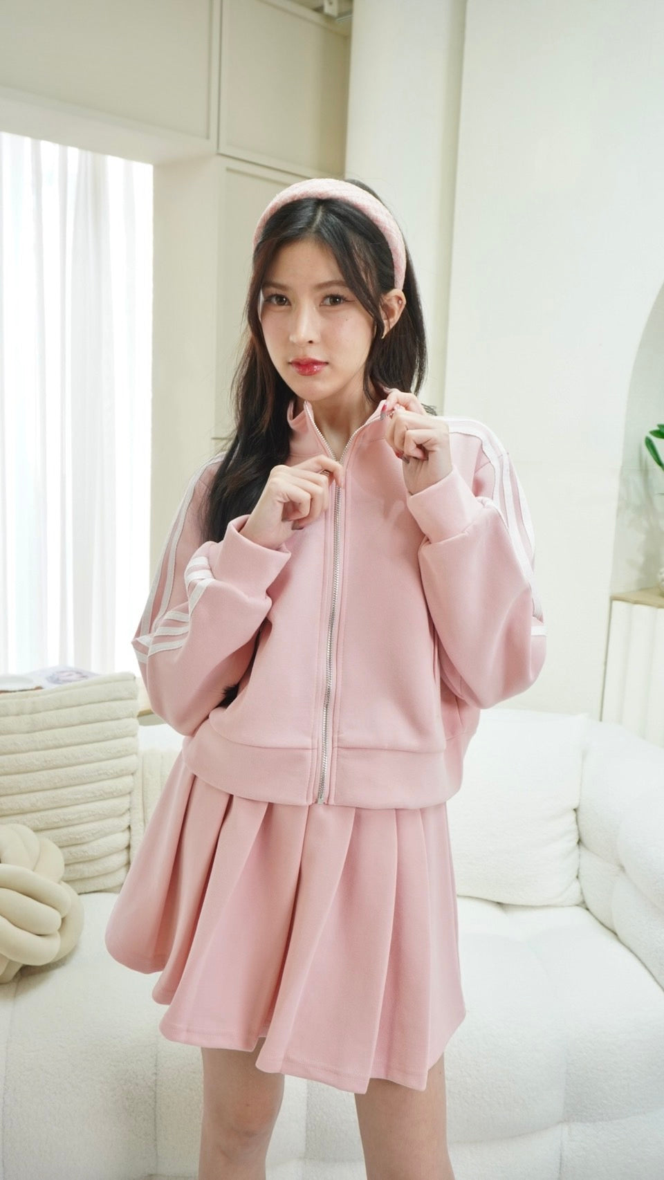 Trendy zip-up long sleeve top paired with a matching skirt, detailed with signature Adidas embroidered stripes.