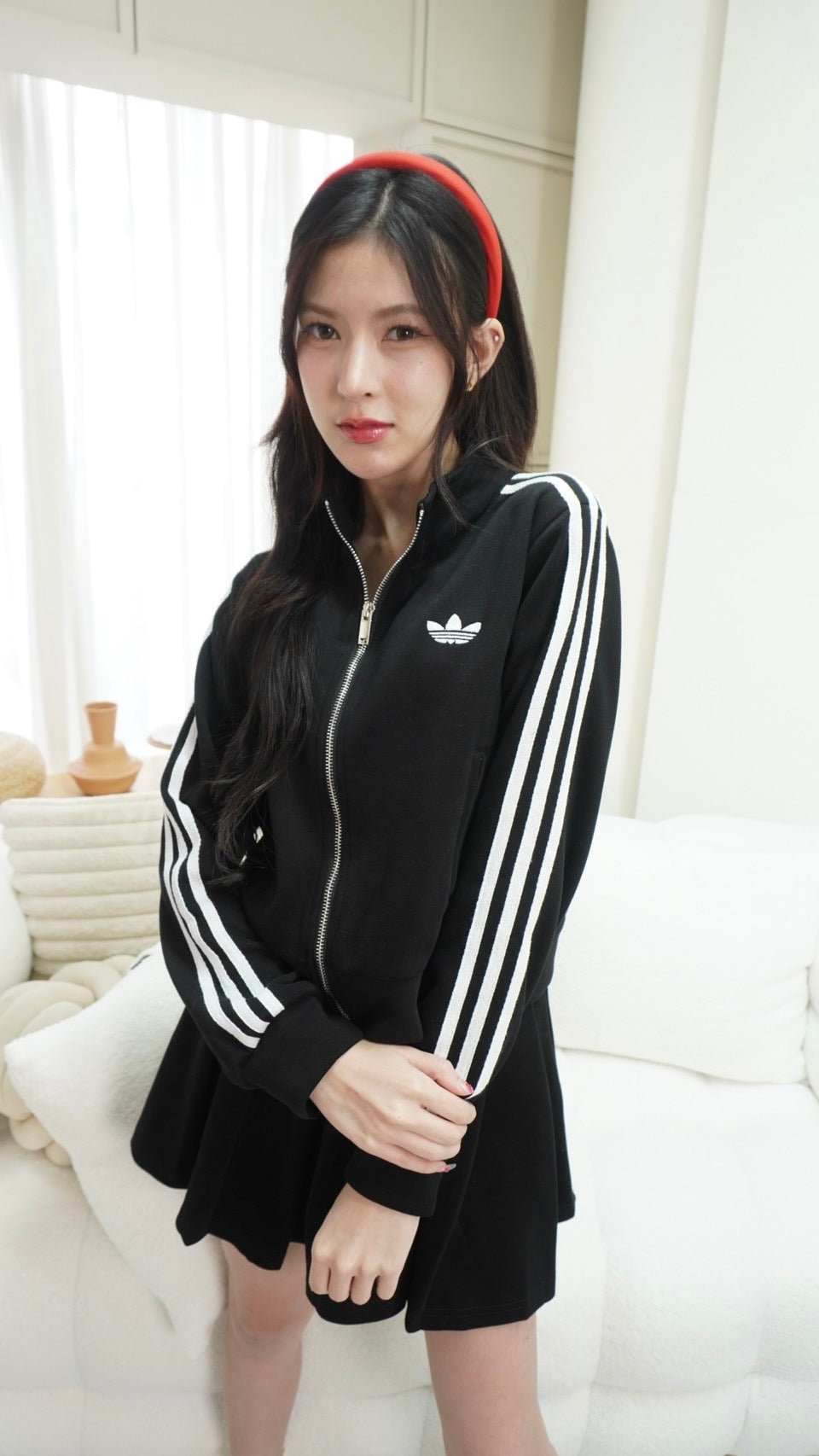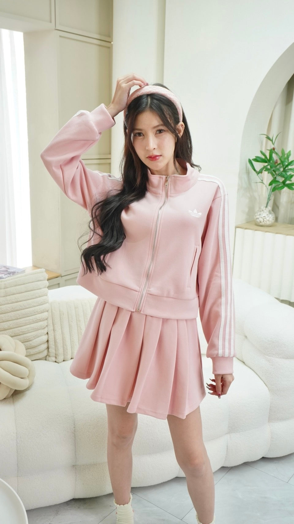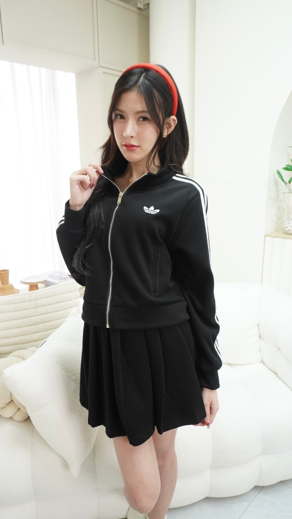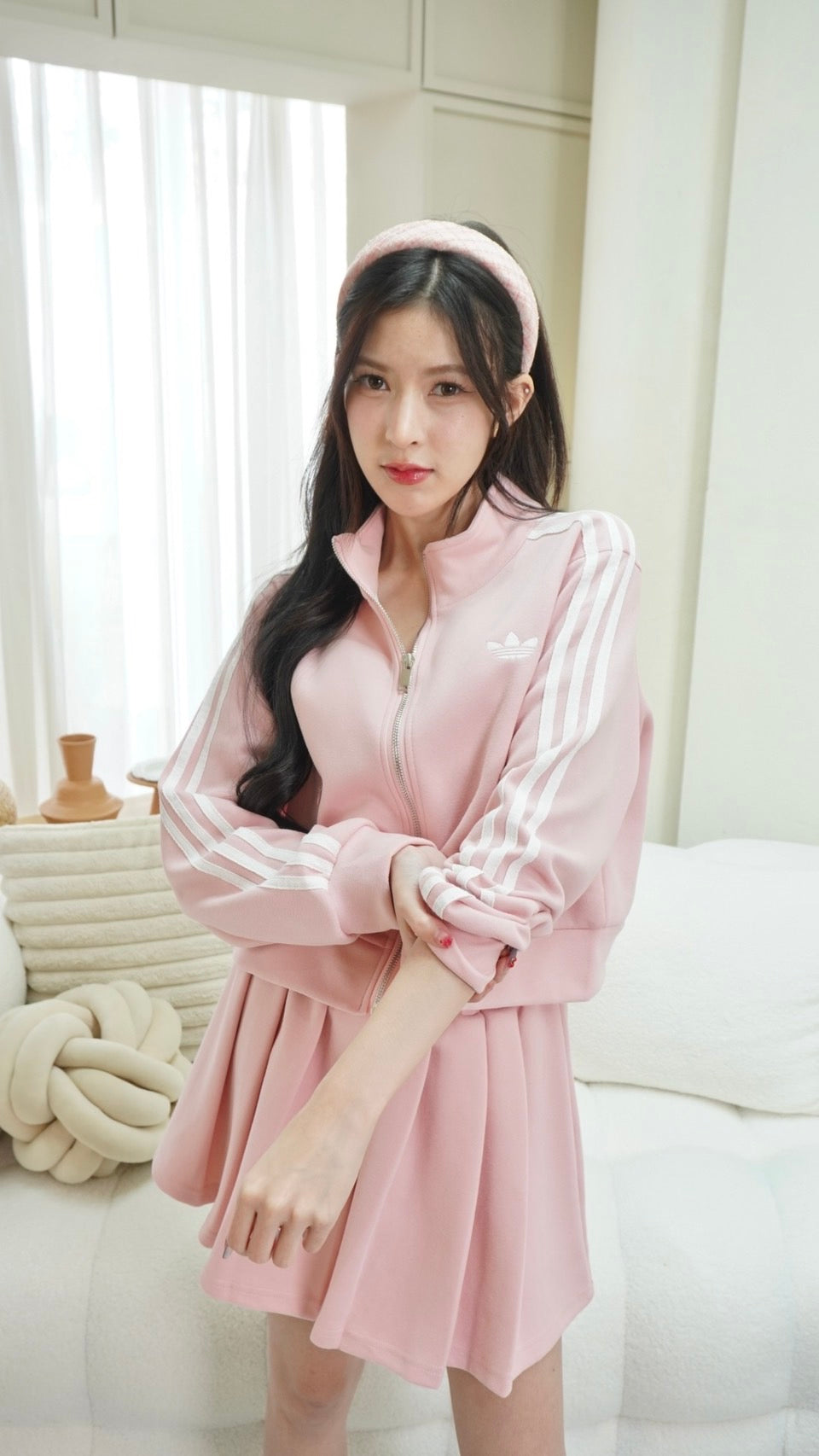 Trendy zip-up long sleeve top paired with a matching skirt, detailed with signature Adidas embroidered stripes.