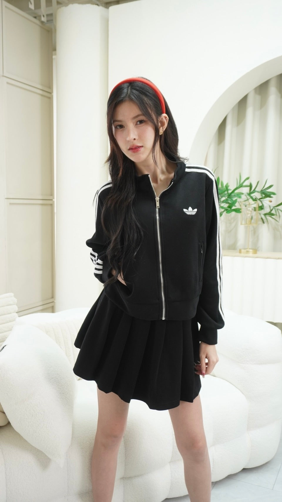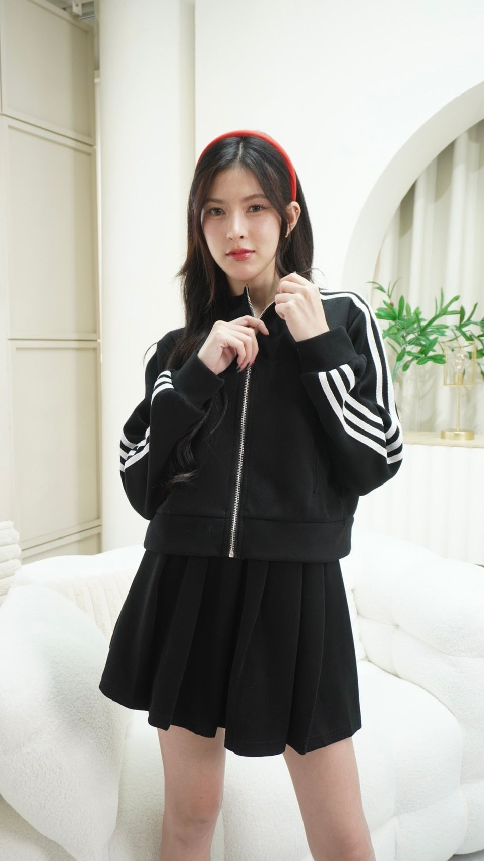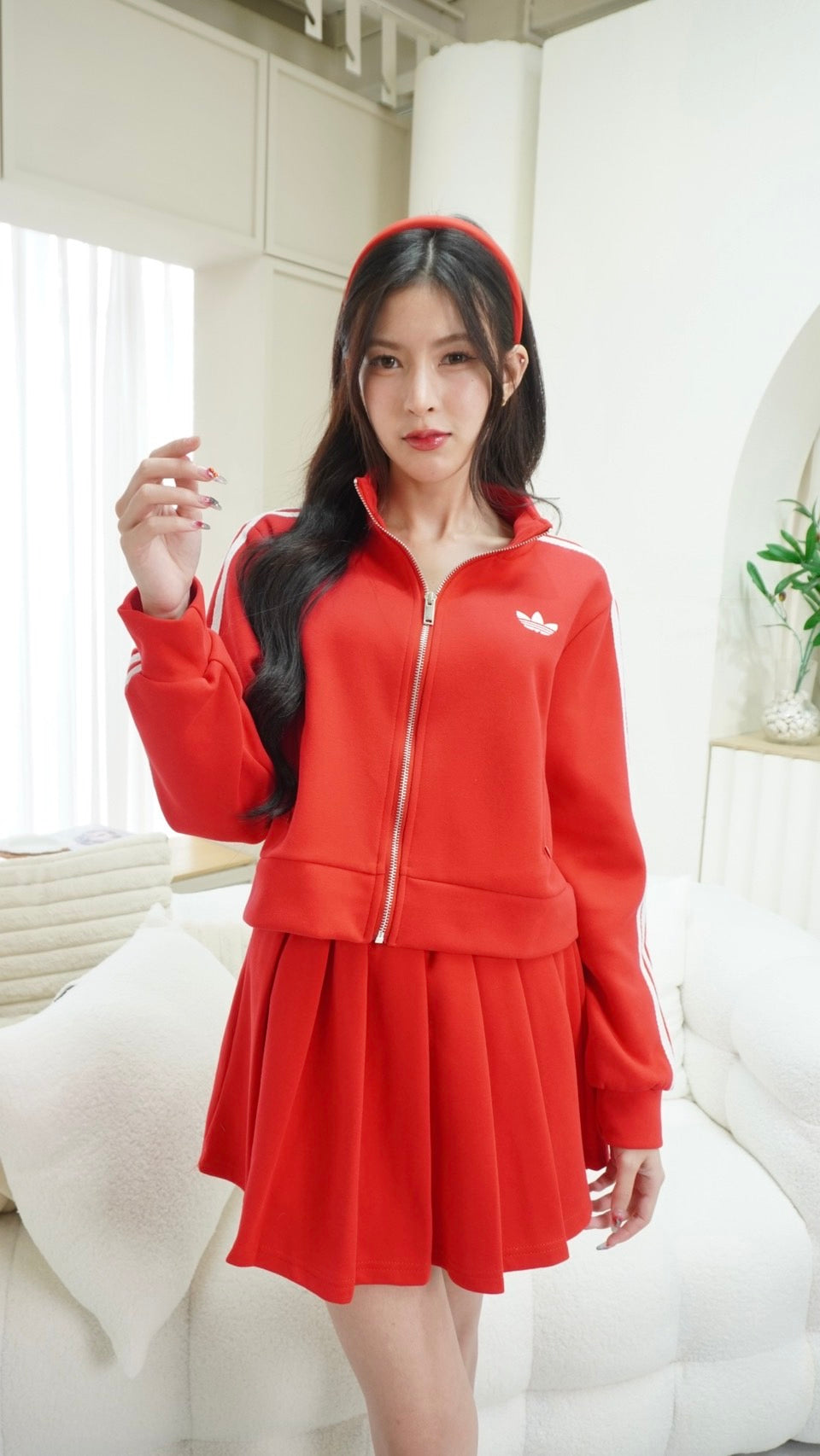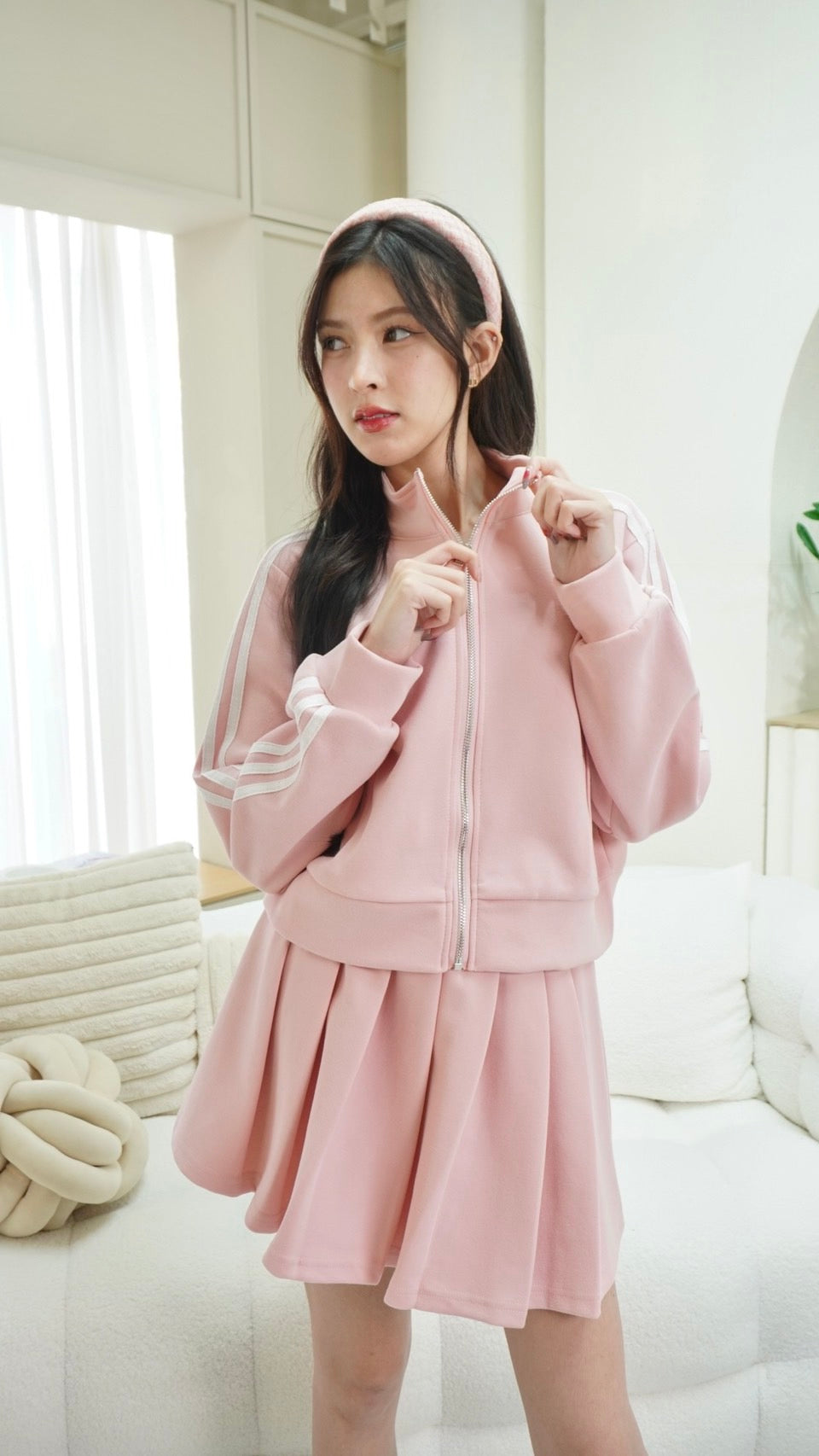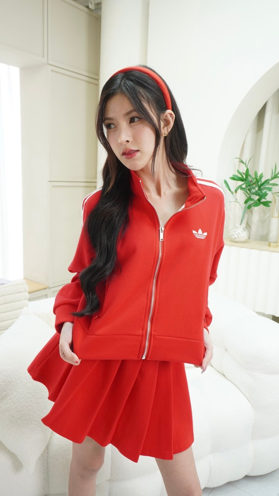 Trendy zip-up long sleeve top paired with a matching skirt, detailed with signature Adidas embroidered stripes.