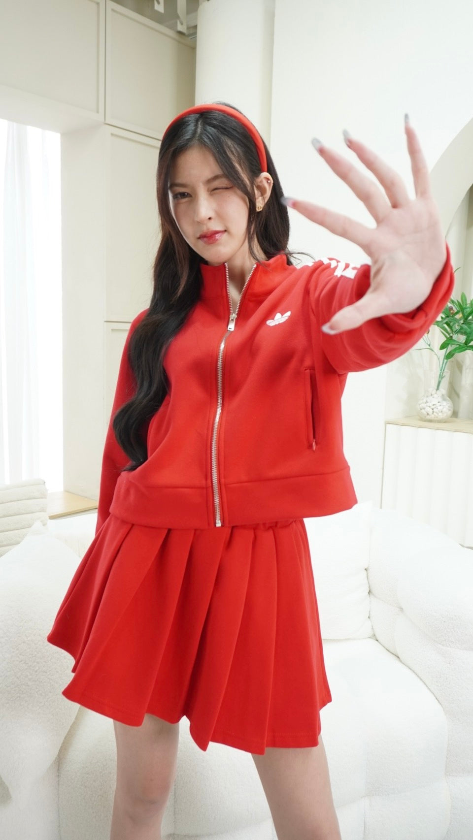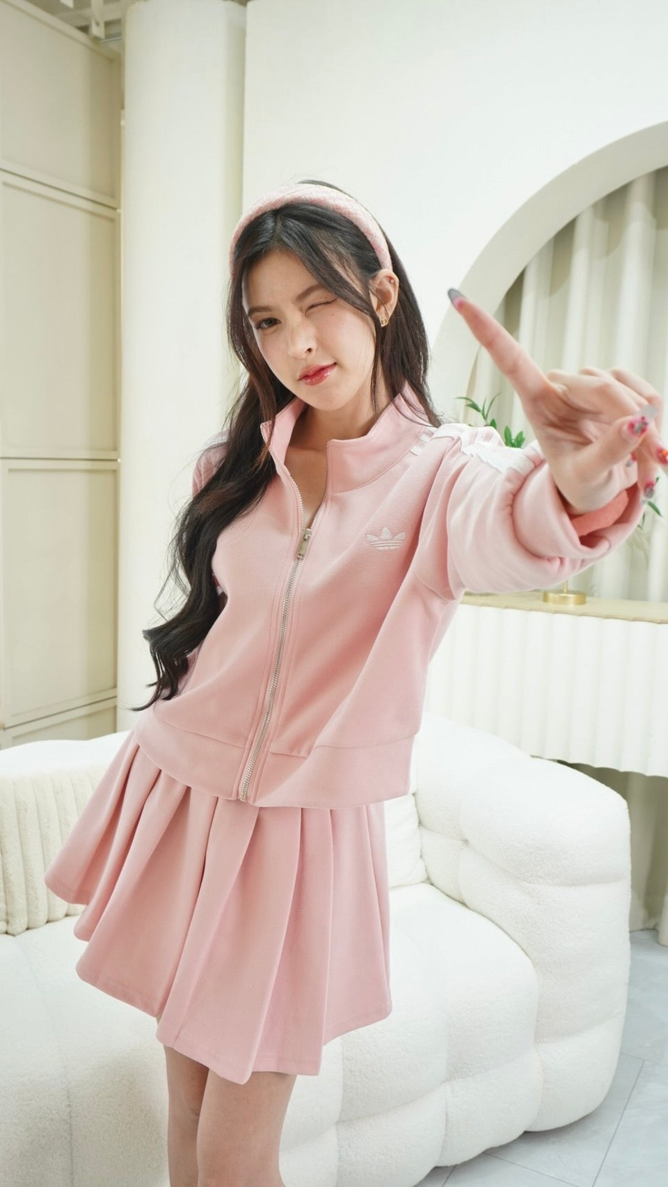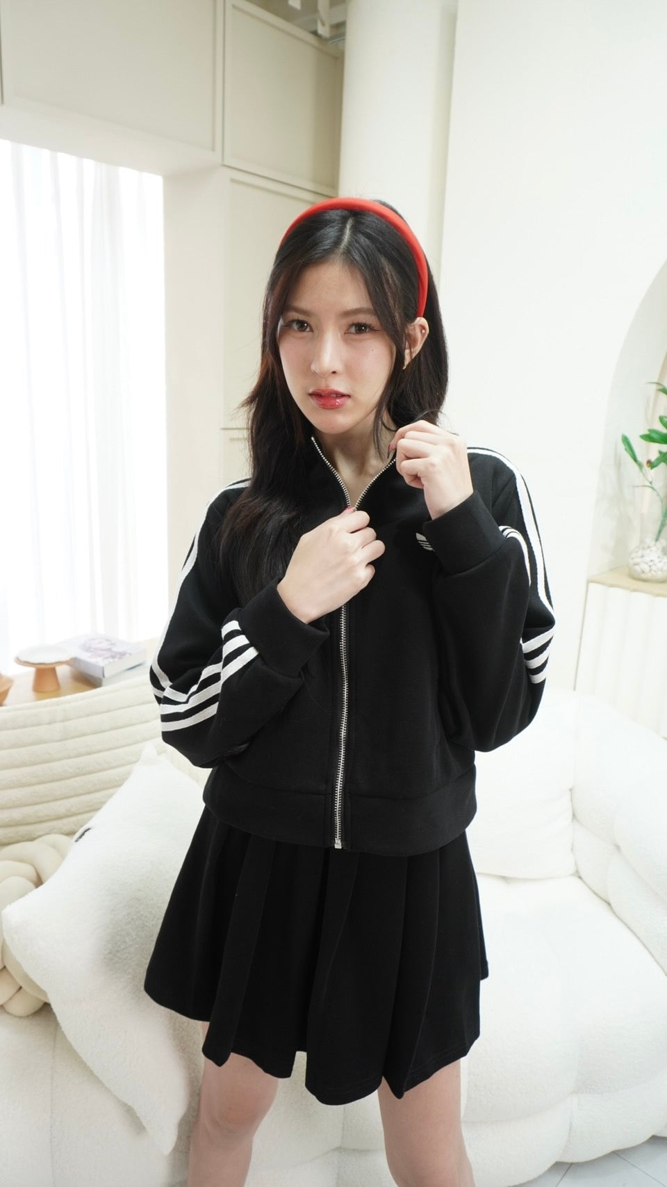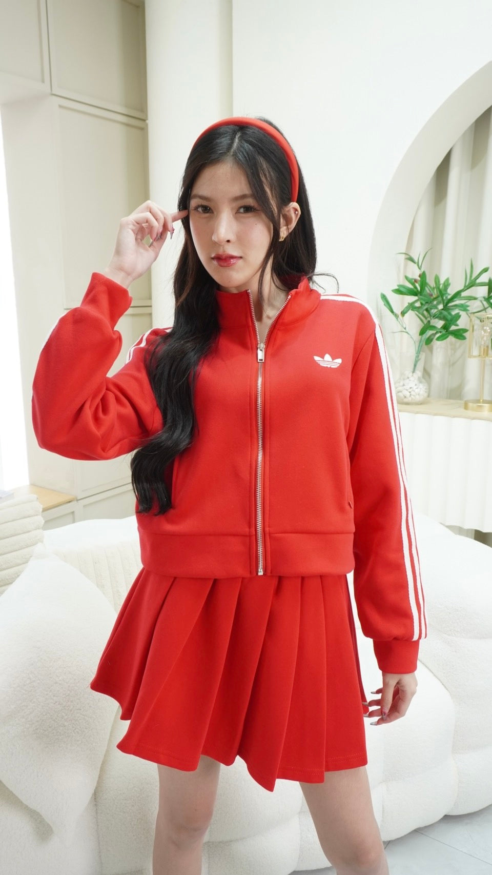 Trendy zip-up long sleeve top paired with a matching skirt, detailed with signature Adidas embroidered stripes.