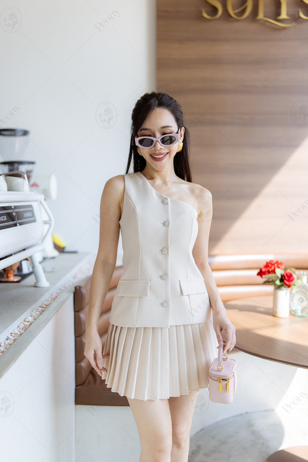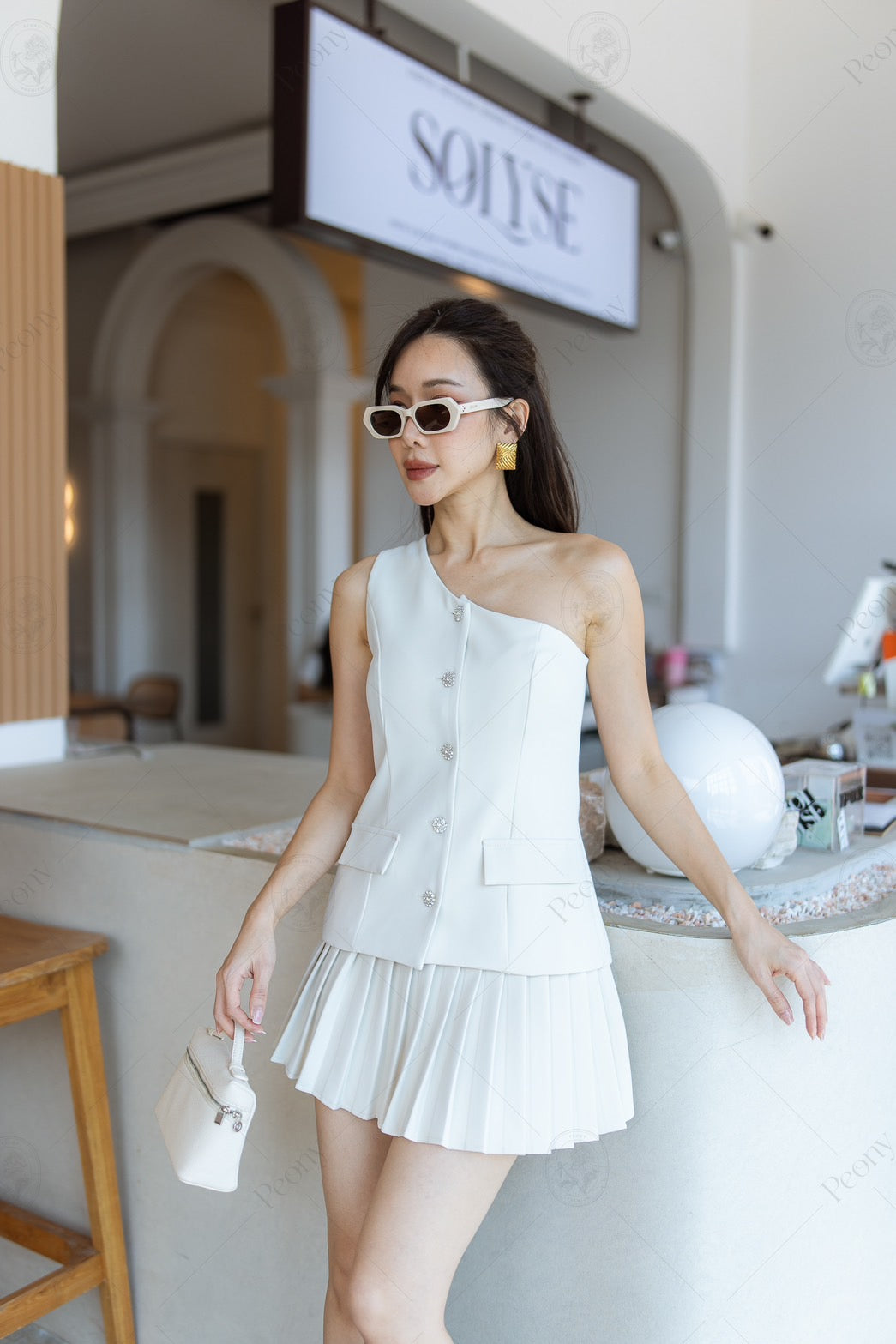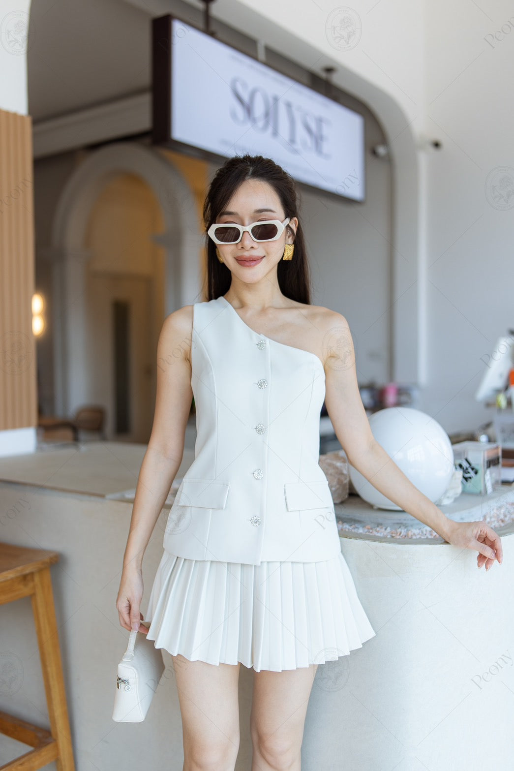 The top features a chic one-shoulder design with front buttons, built-in padding, and full lining. It pairs perfectly with a pleated skirt that comes with inner shorts for extra comfort and coverage. Wear it together for a full glam look, or mix and match with your favorite pieces!