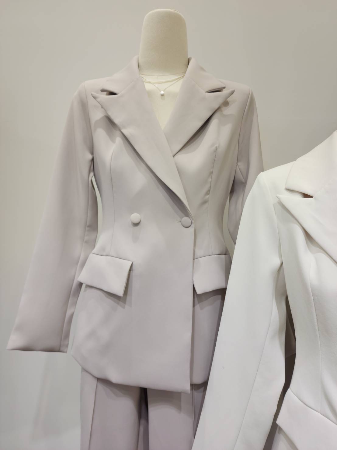 Two-piece set made from tightly woven suiting fabric with a refined, structured texture. Features a beautifully tailored silhouette with padded shoulders for a sharp look. Paired with pleated front trousers and fully lined for comfort and elegance. A smart, sophisticated outfit perfect for any occasion!