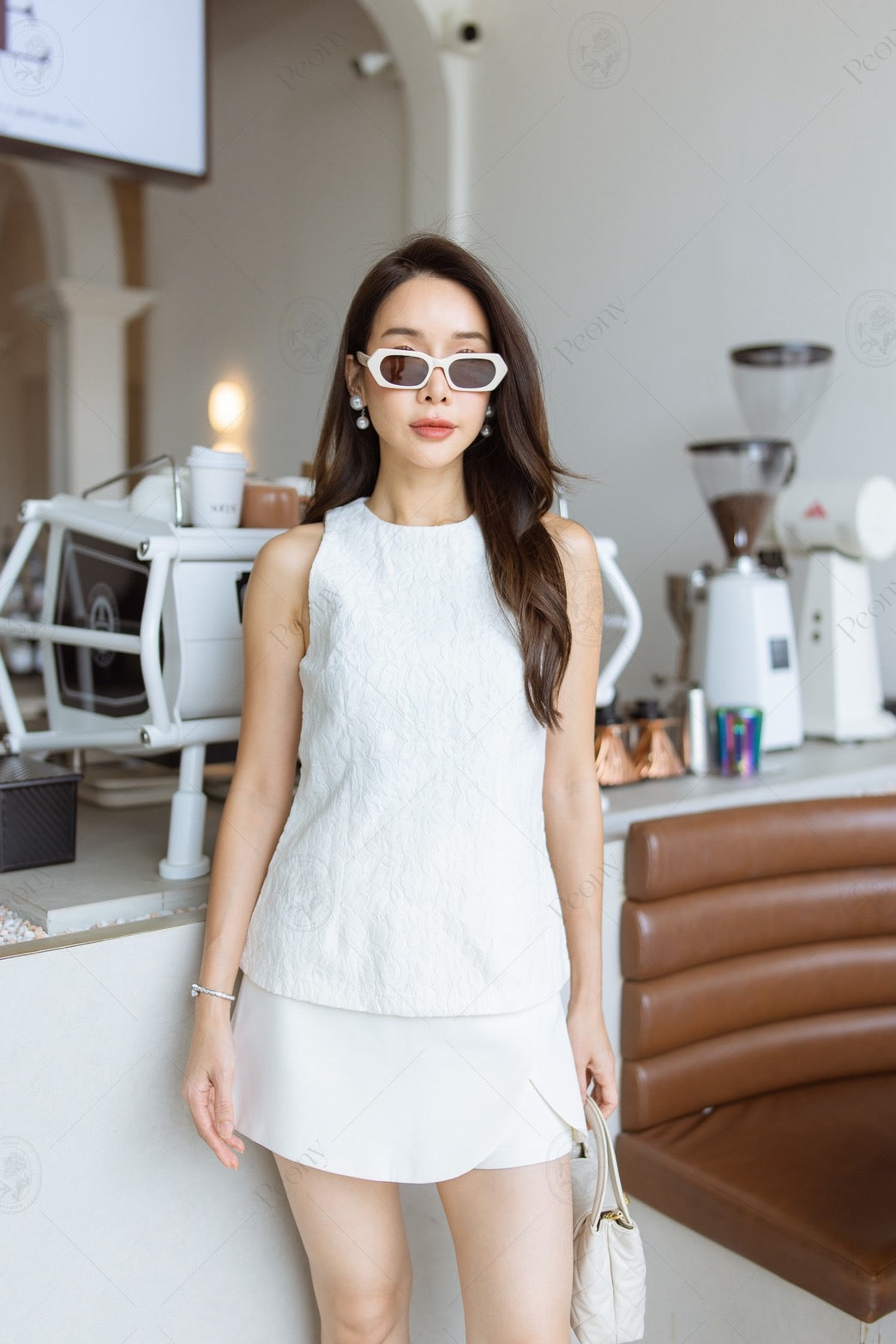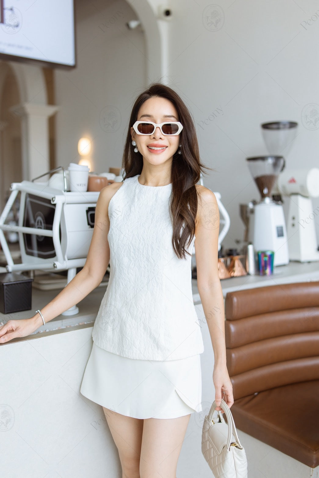 Paired with a matching skirt featuring a curved hem, this outfit completes a refined, elegant “lady-like” look.