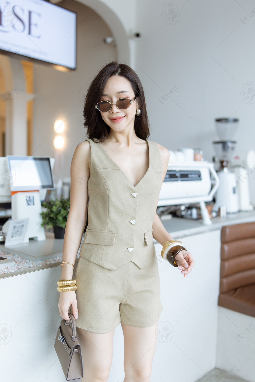 The top features a V-neckline with front buttons, perfectly paired with tailored shorts.