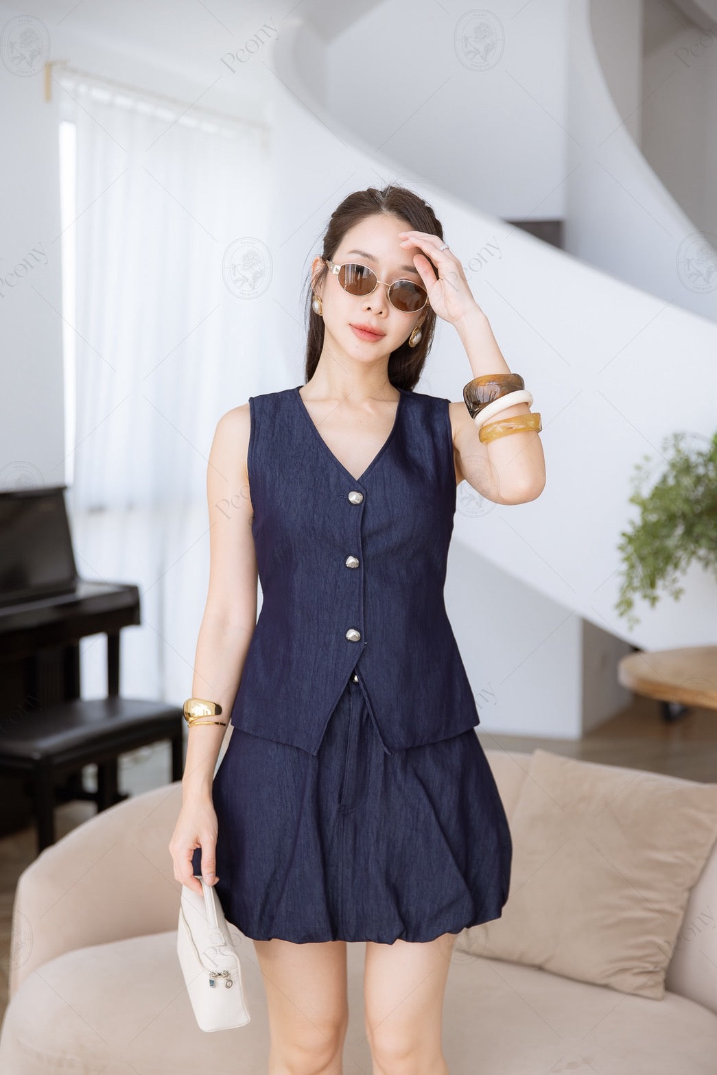 This charming set is made from beautifully textured fabric with a subtle woven pattern. The V-neck top features front buttons and a wrap-around tie at the back for a feminine bow detail. Paired with a balloon-style skirt for a playful, soft, and effortlessly cute look—perfect for any occasion!