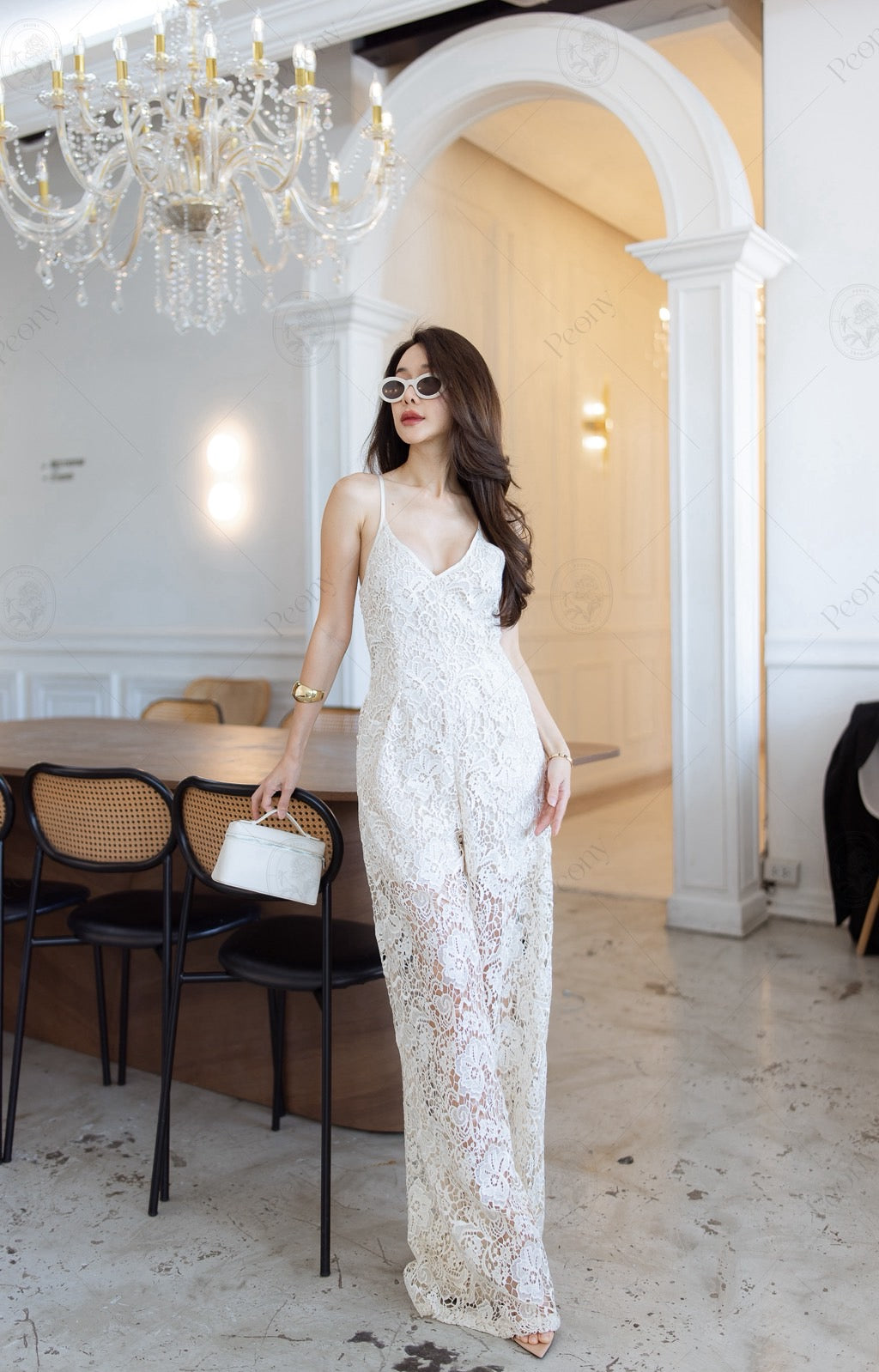 Details: Elegant lace jumpsuit with intricate pattern and tight weave. Fabric reflects light beautifully. Features a V-neck front and back, adjustable straps, and comes with a lining. Perfect for a complete, chic, and luxurious look for any occasion.