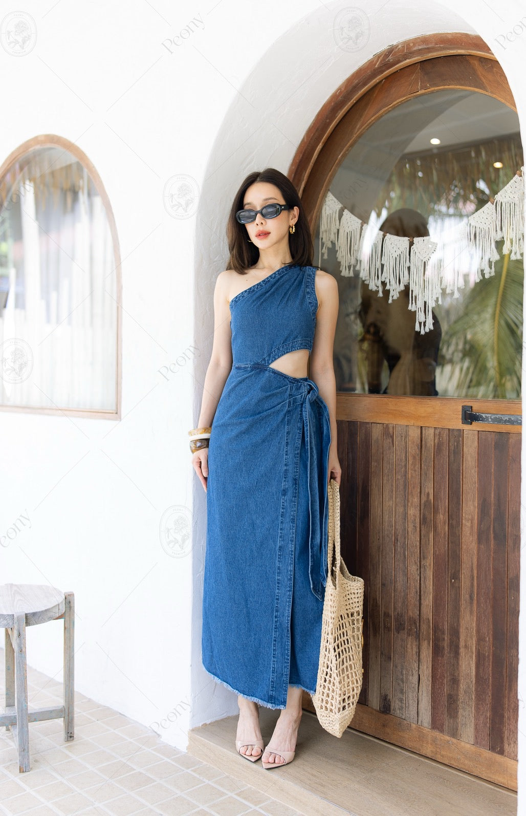 đ¤ Off-shoulder one-sleeve denim midi dress featuring a waist cut-out and A-line skirt with a slit. Made from authentic denim in a beautiful wash. Effortlessly completes a chic, fashion-forward look.