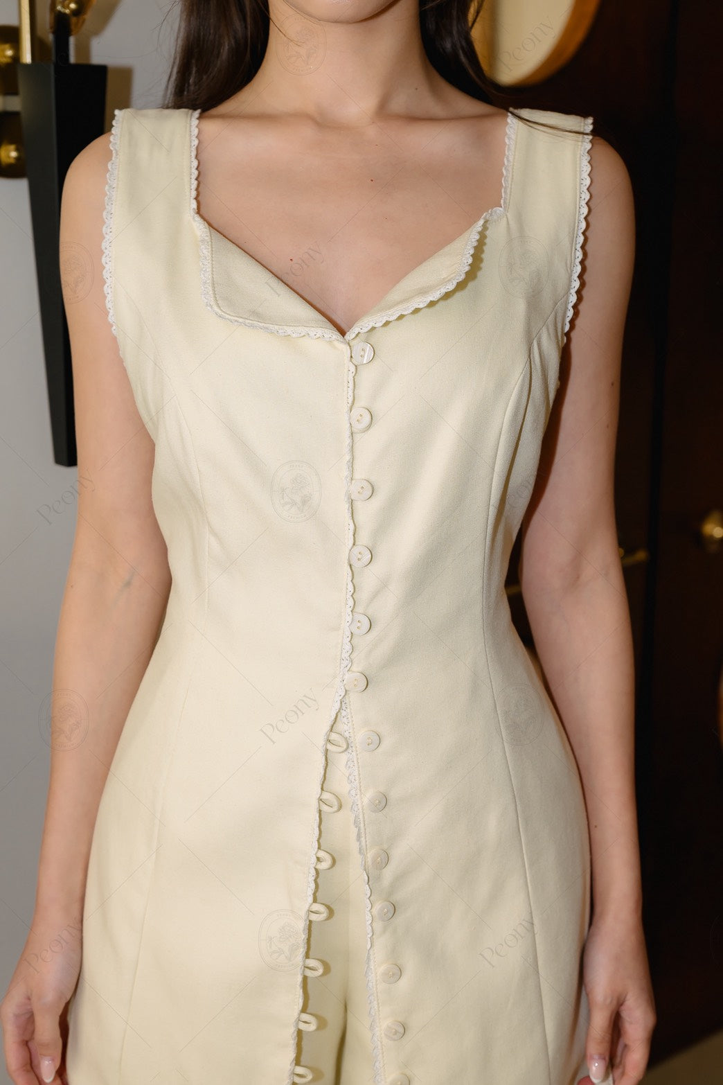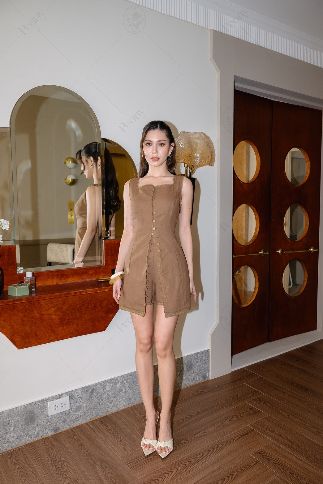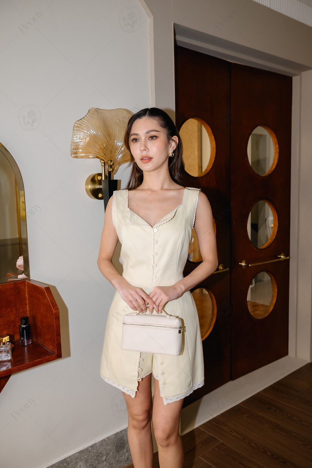 The long top features front buttons with delicate lace trim and a side zipper for easy wear,