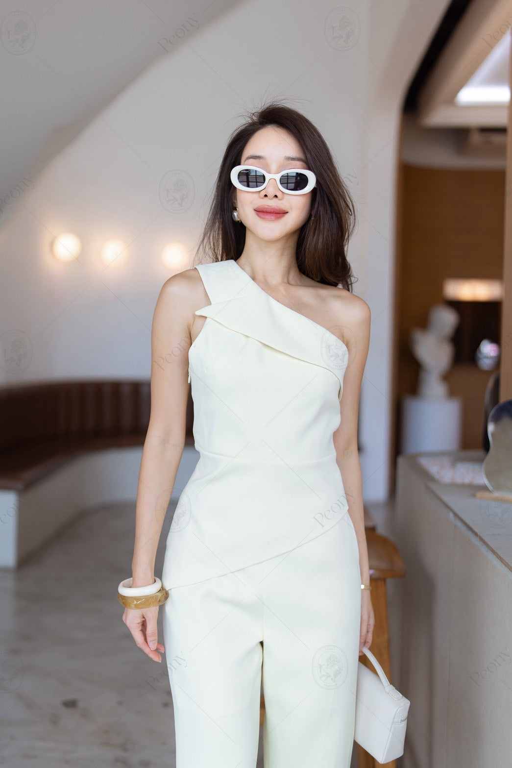 Made from tightly woven fabric, this stylish set features a one-shoulder asymmetrical top with a unique cut.