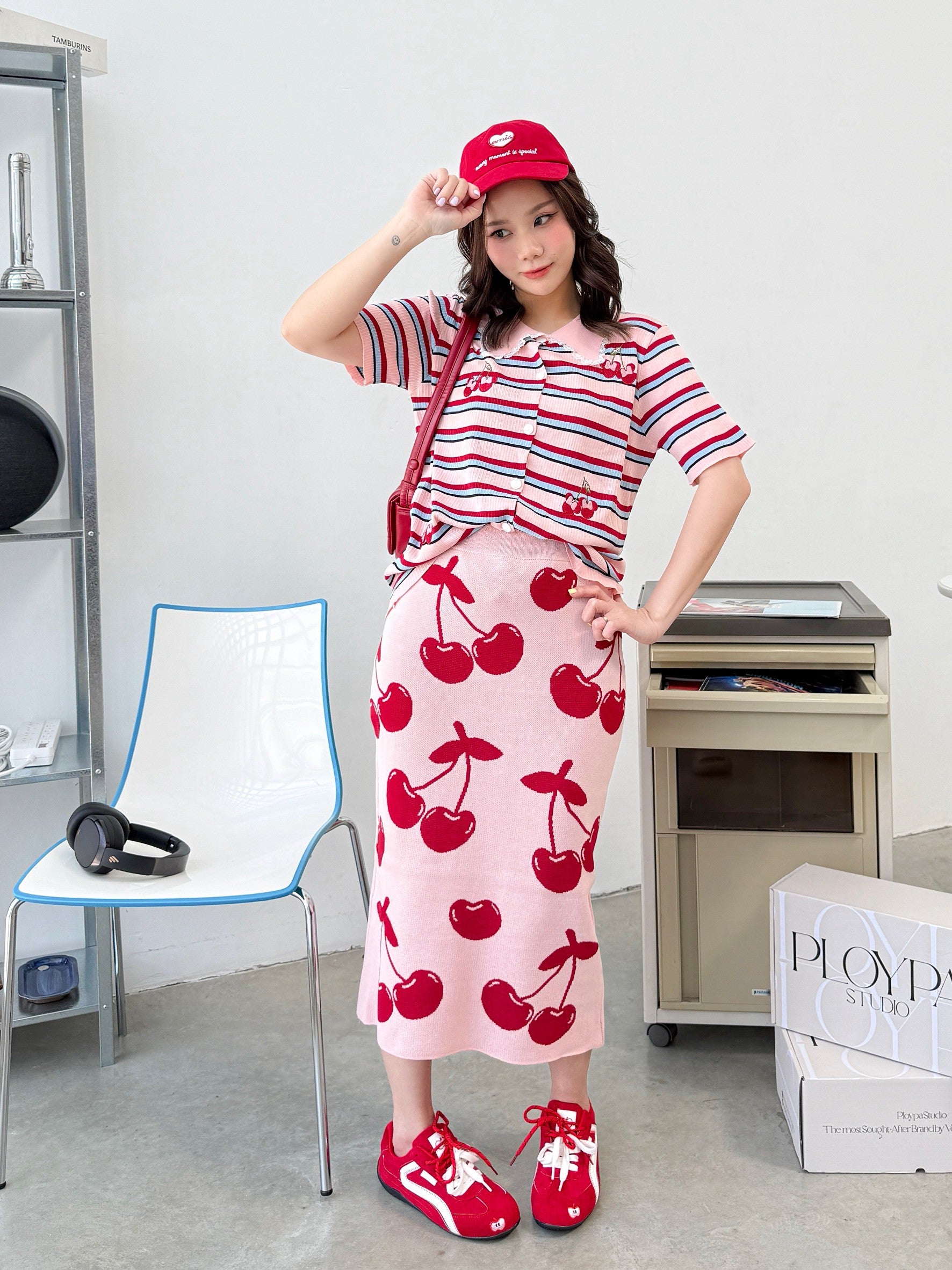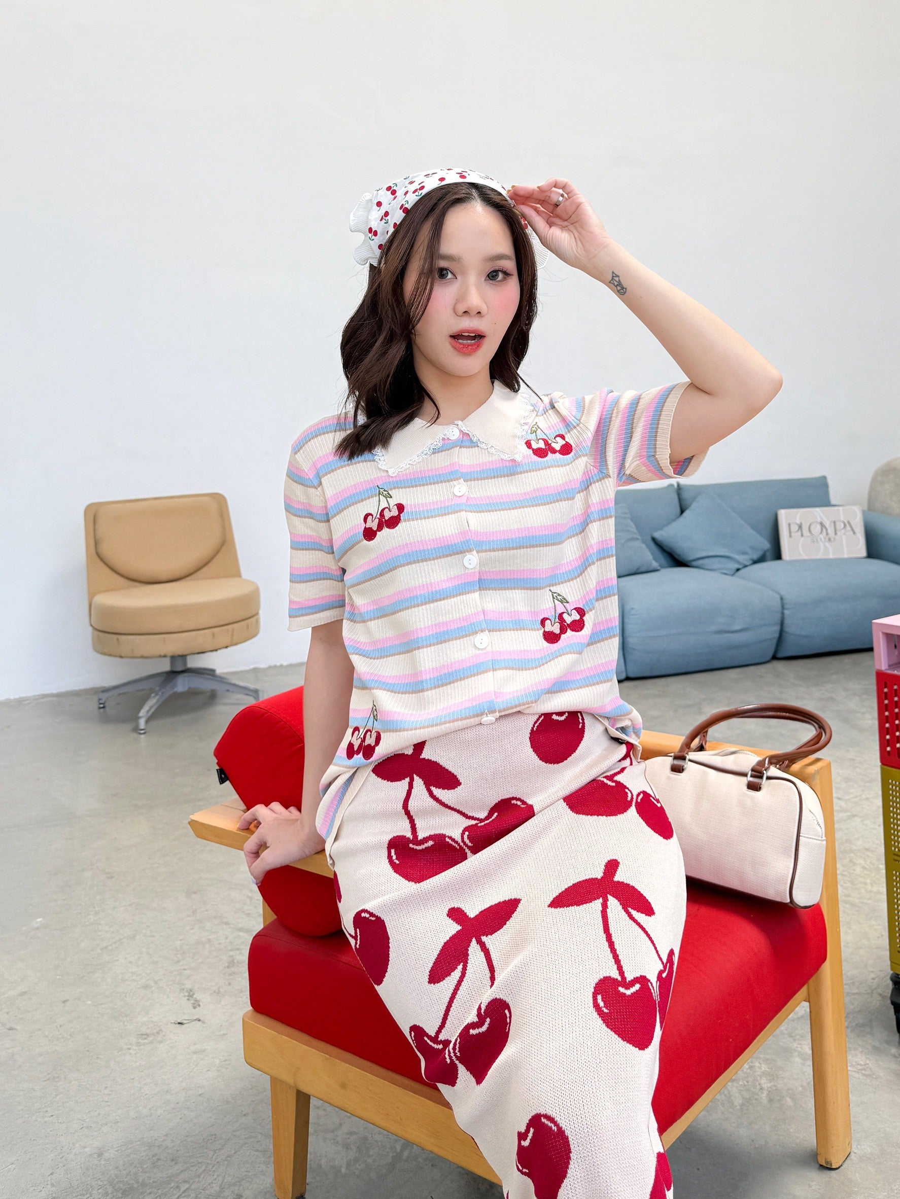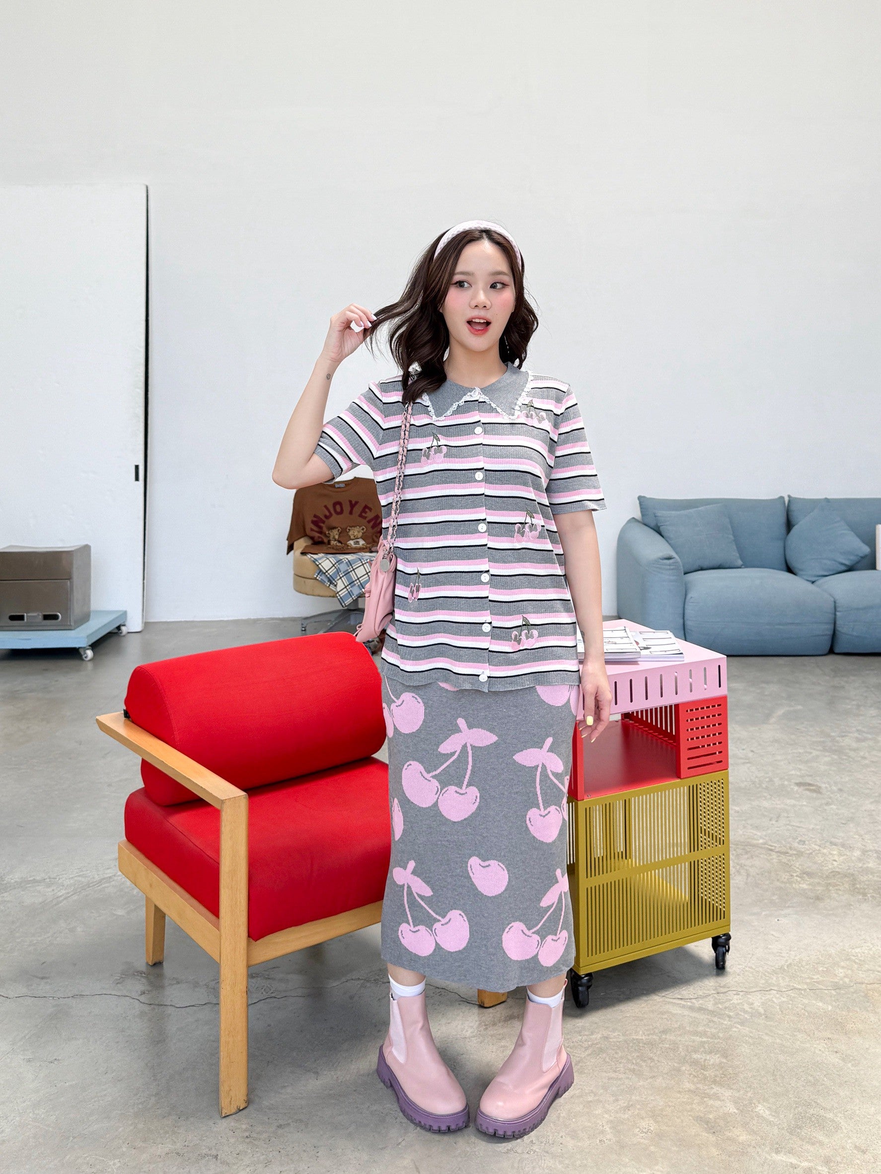 A charming Korean-style set featuring a collared button-down top with delicate lace trim for a sweet, feminine touch. Made from a striped tweed fabric and embroidered with an adorable Minnie cherry motif as a playful accent. Paired with a high-waisted pencil skirt in a matching cherry pattern β subtle yet cute! The soft, muted tones make this outfit perfect for any season.