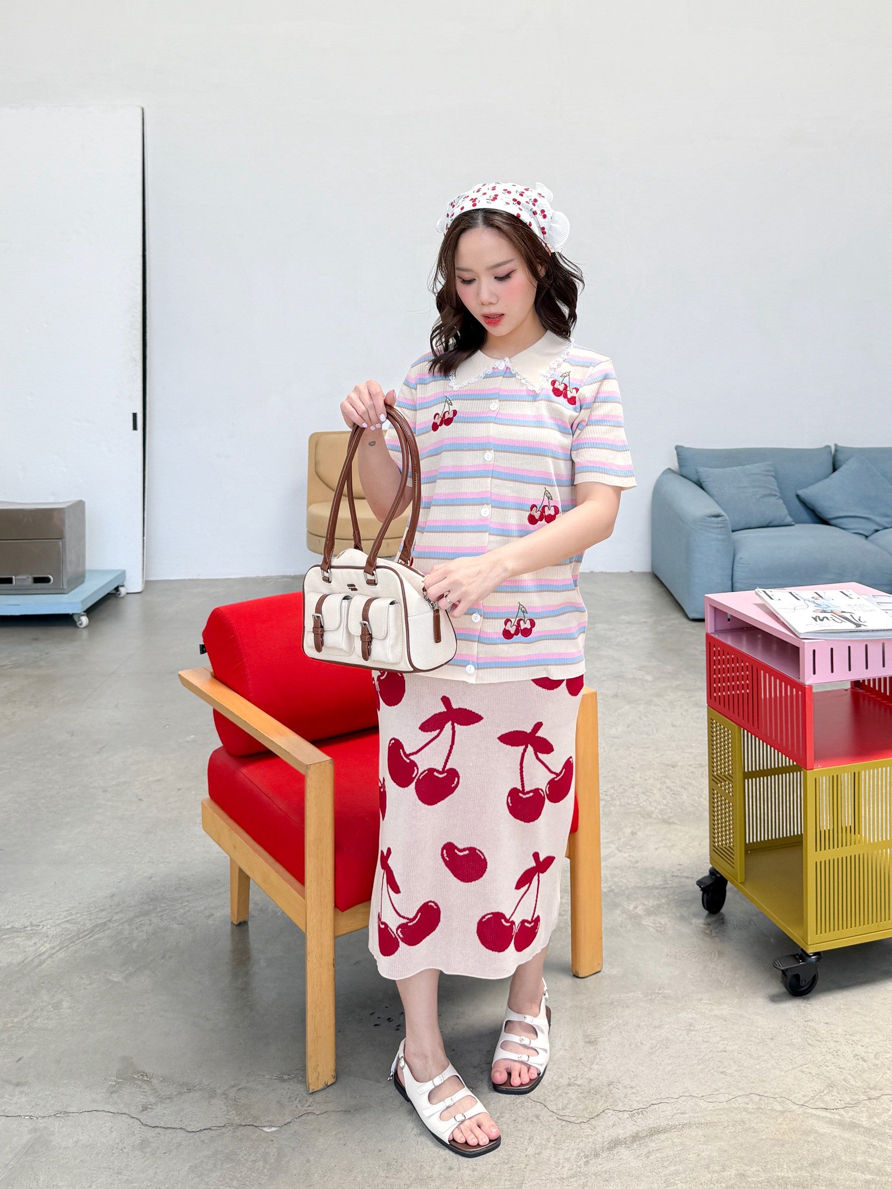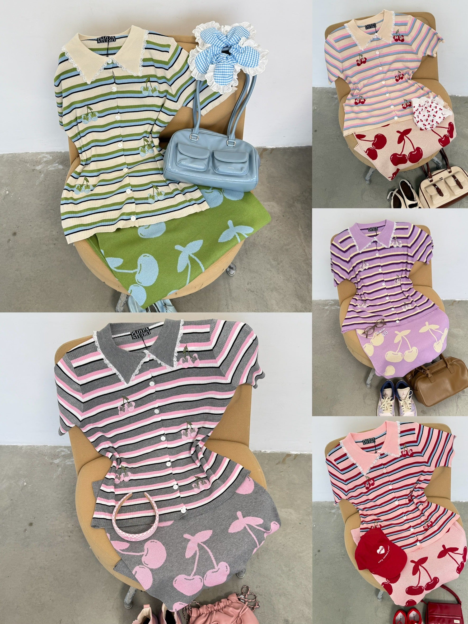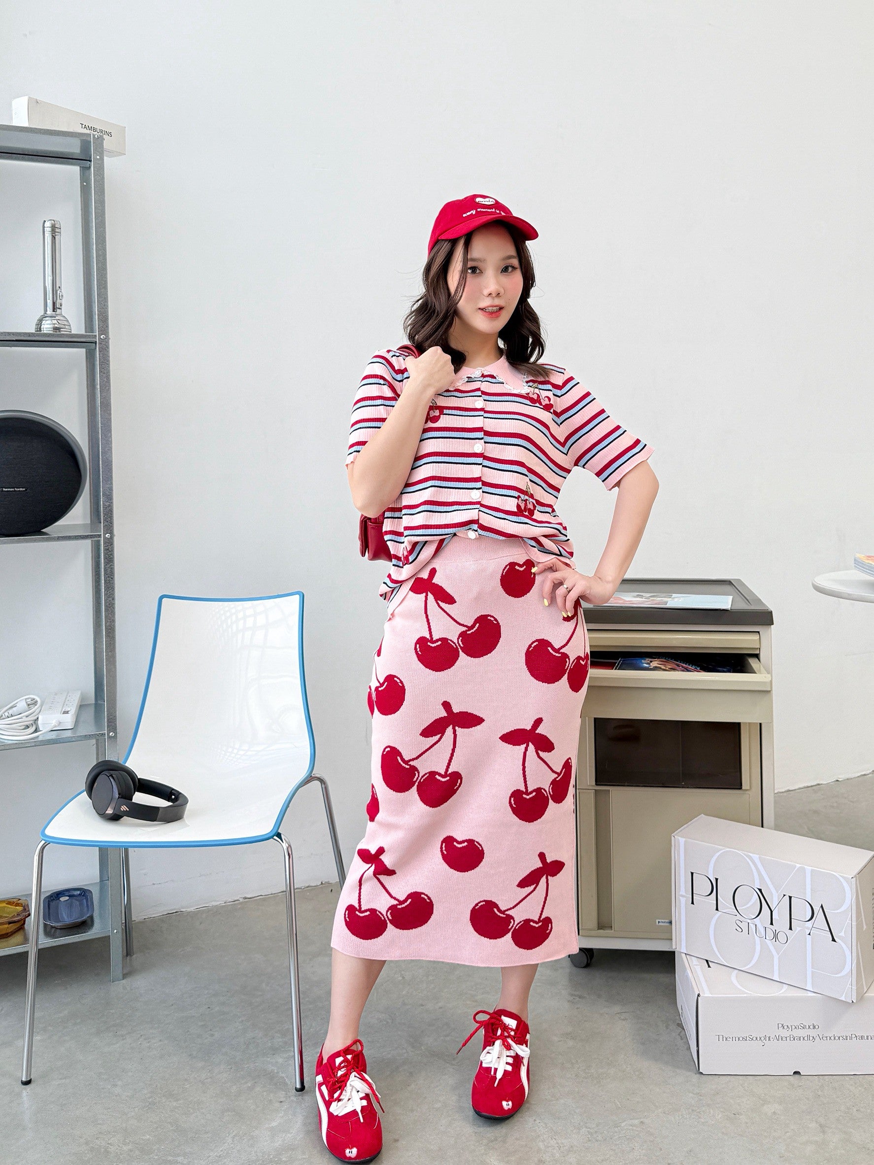 A charming Korean-style set featuring a collared button-down top with delicate lace trim for a sweet, feminine touch. Made from a striped tweed fabric and embroidered with an adorable Minnie cherry motif as a playful accent. Paired with a high-waisted pencil skirt in a matching cherry pattern β subtle yet cute! The soft, muted tones make this outfit perfect for any season.