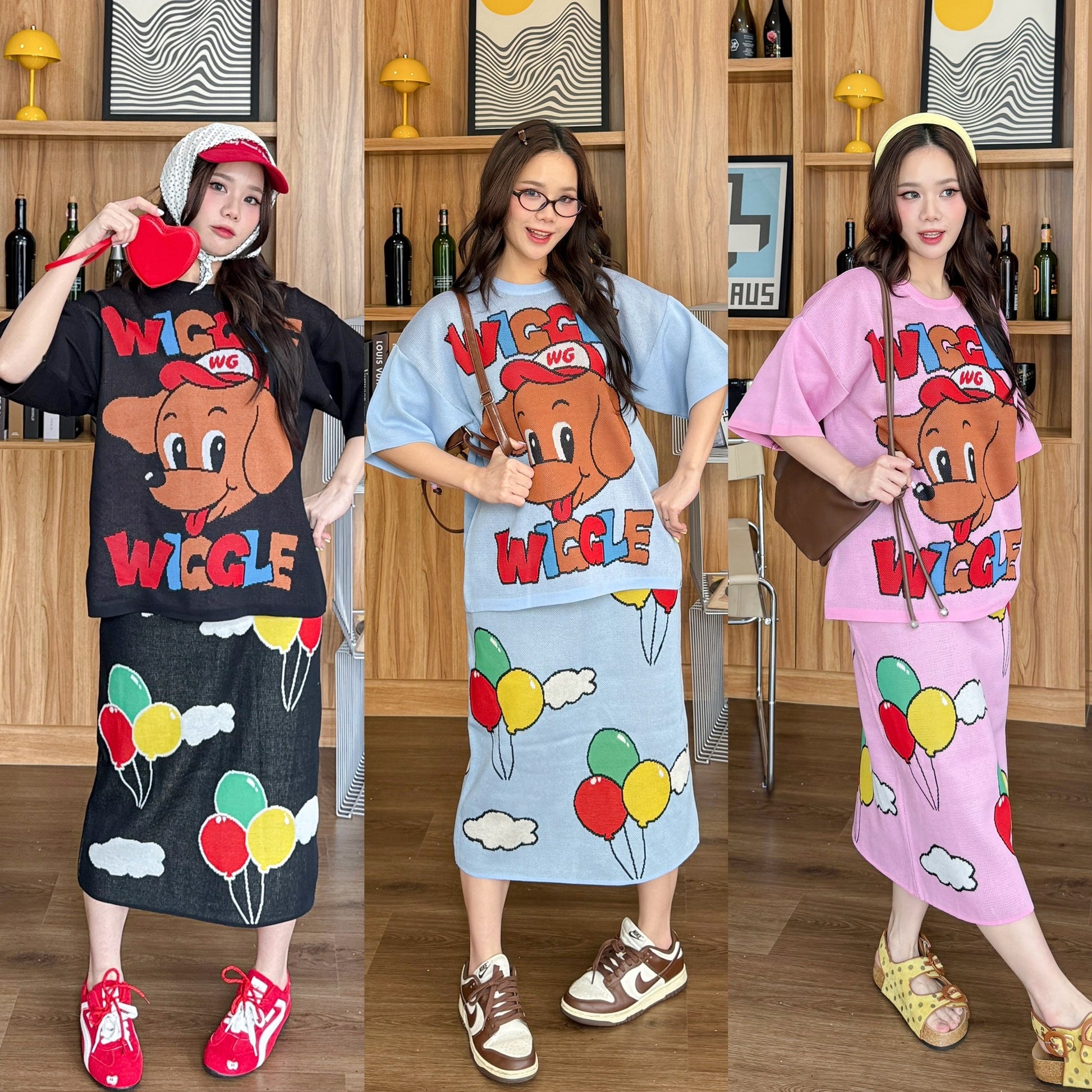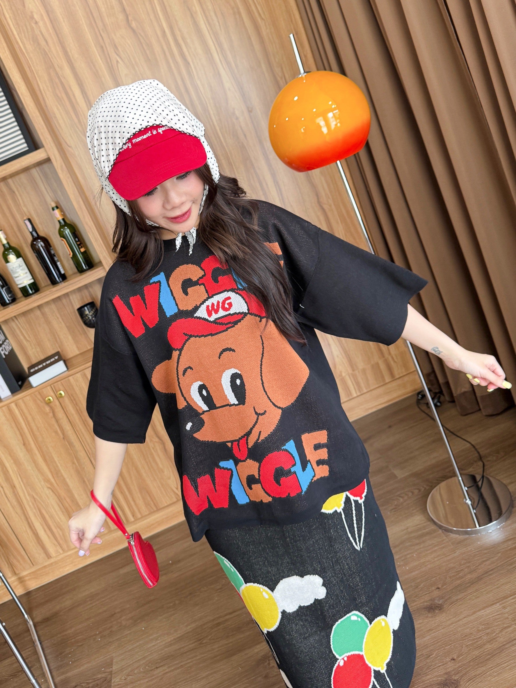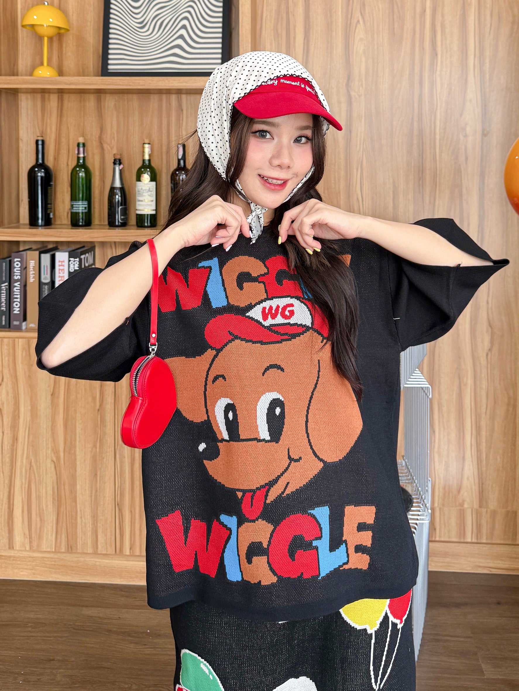 A cute and colorful set featuring an oversized top with a vibrant "WIGGLE" print — super adorable and fun to wear!