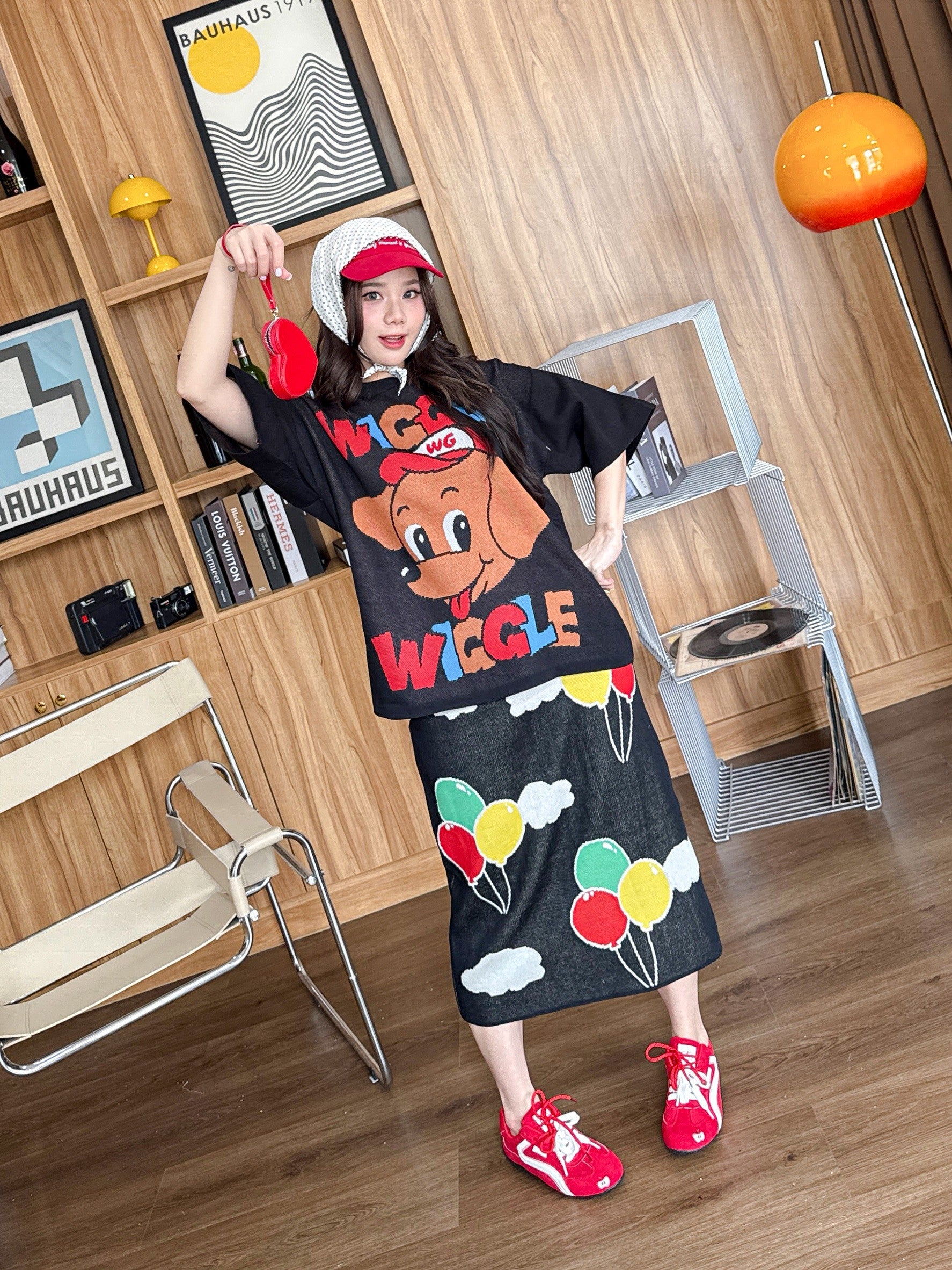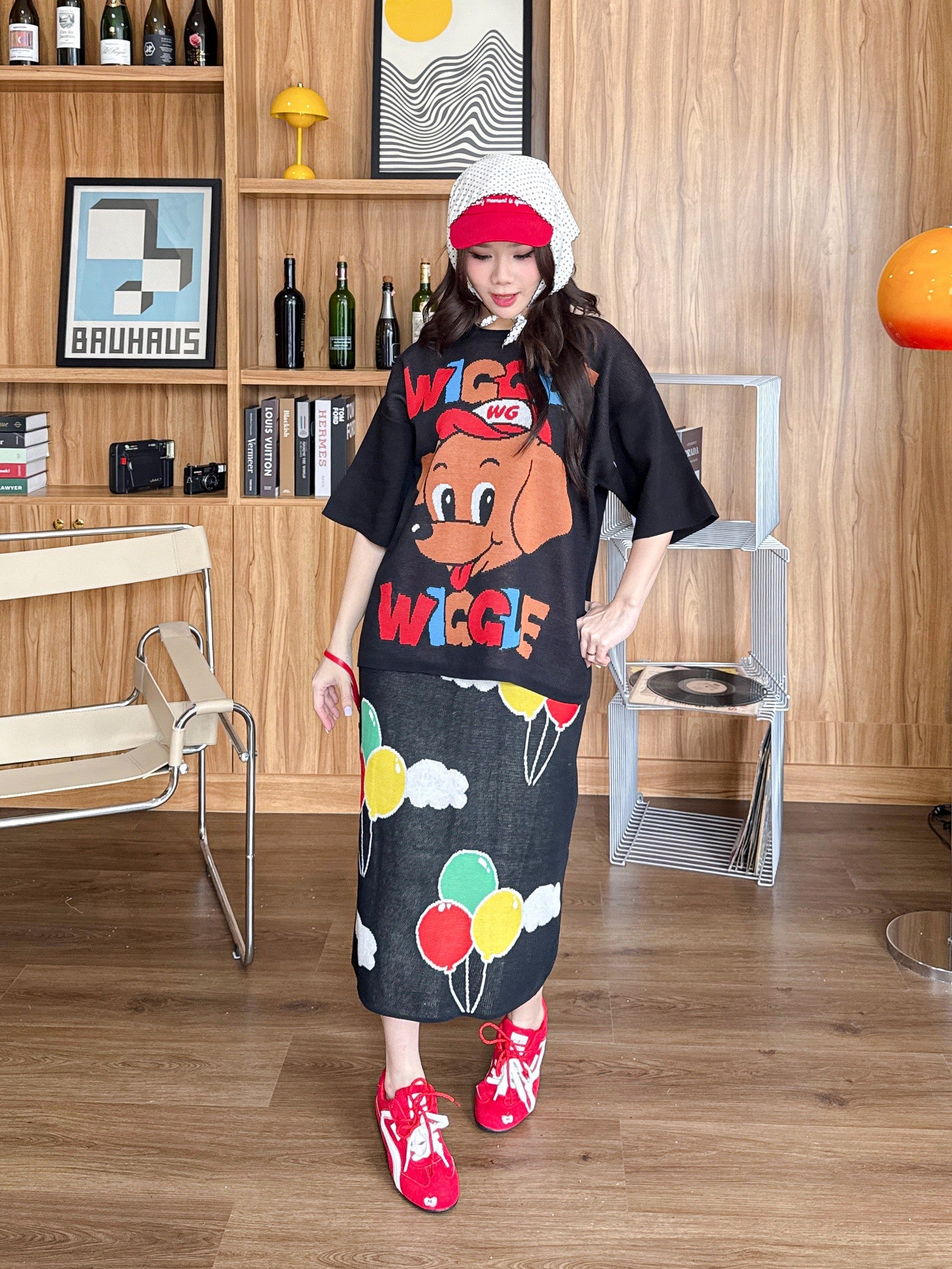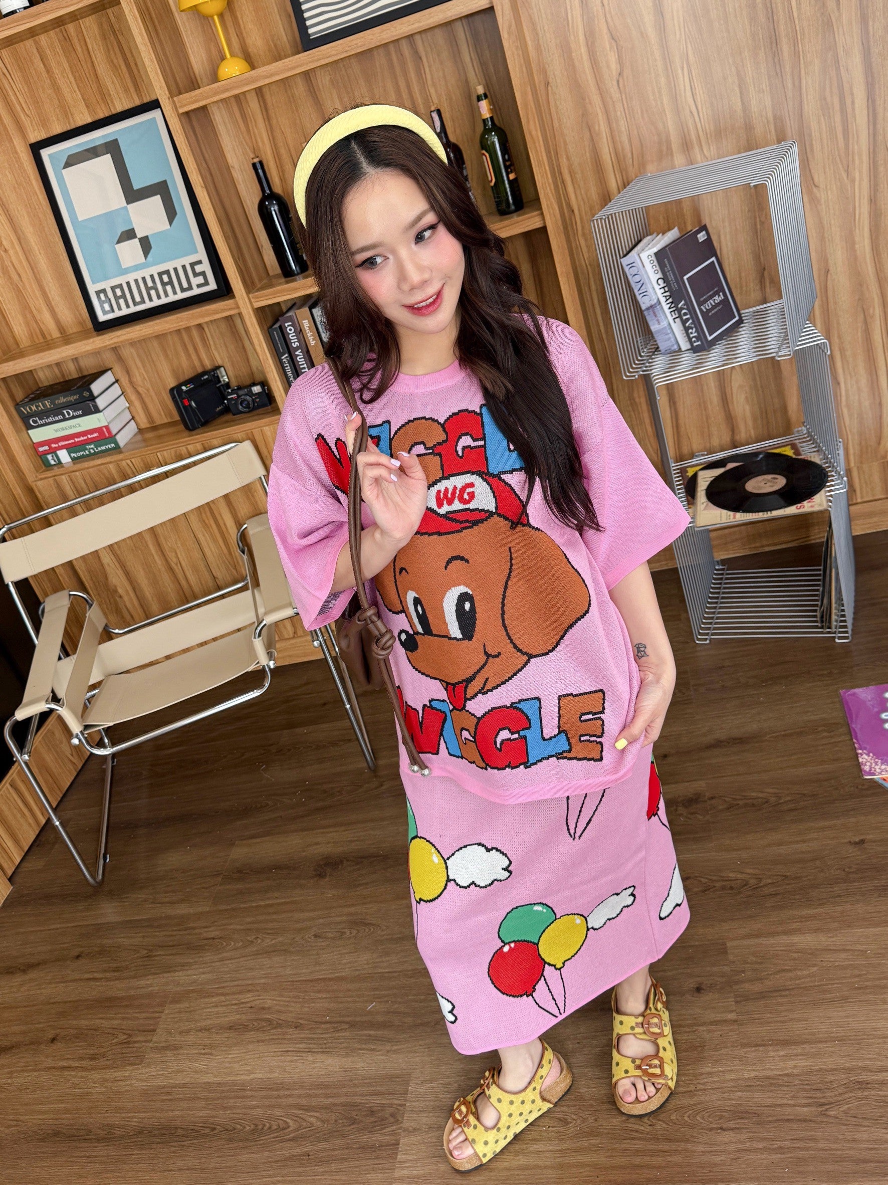 A cute and colorful set featuring an oversized top with a vibrant "WIGGLE" print — super adorable and fun to wear!