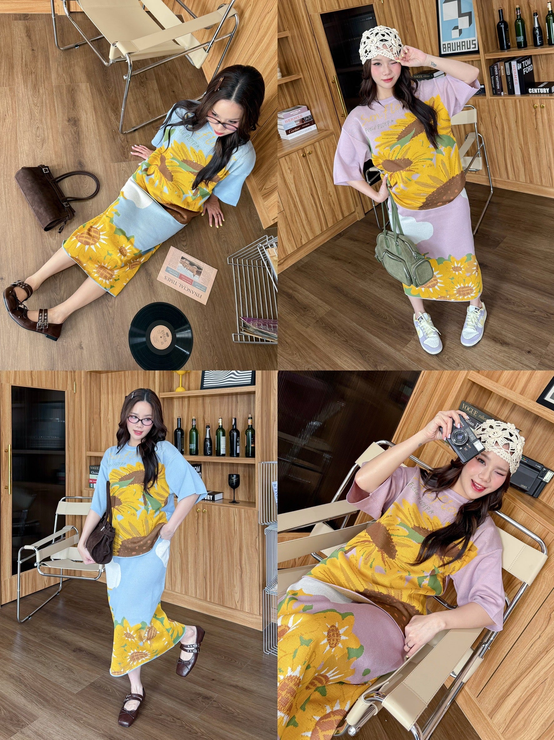 The oversized top features a bold sunflower print, paired with a matching pencil skirt showcasing sunflowers and fluffy clouds.