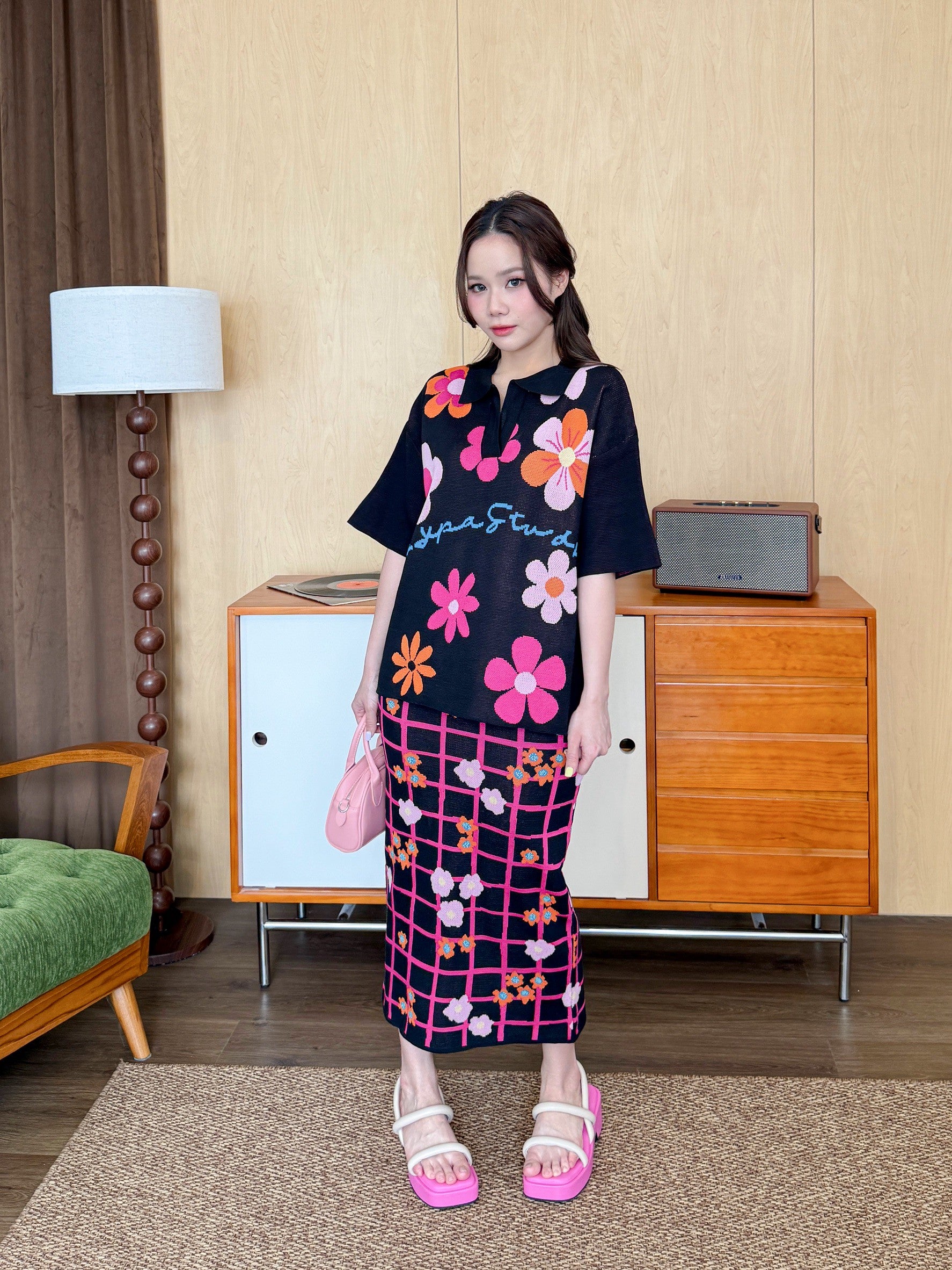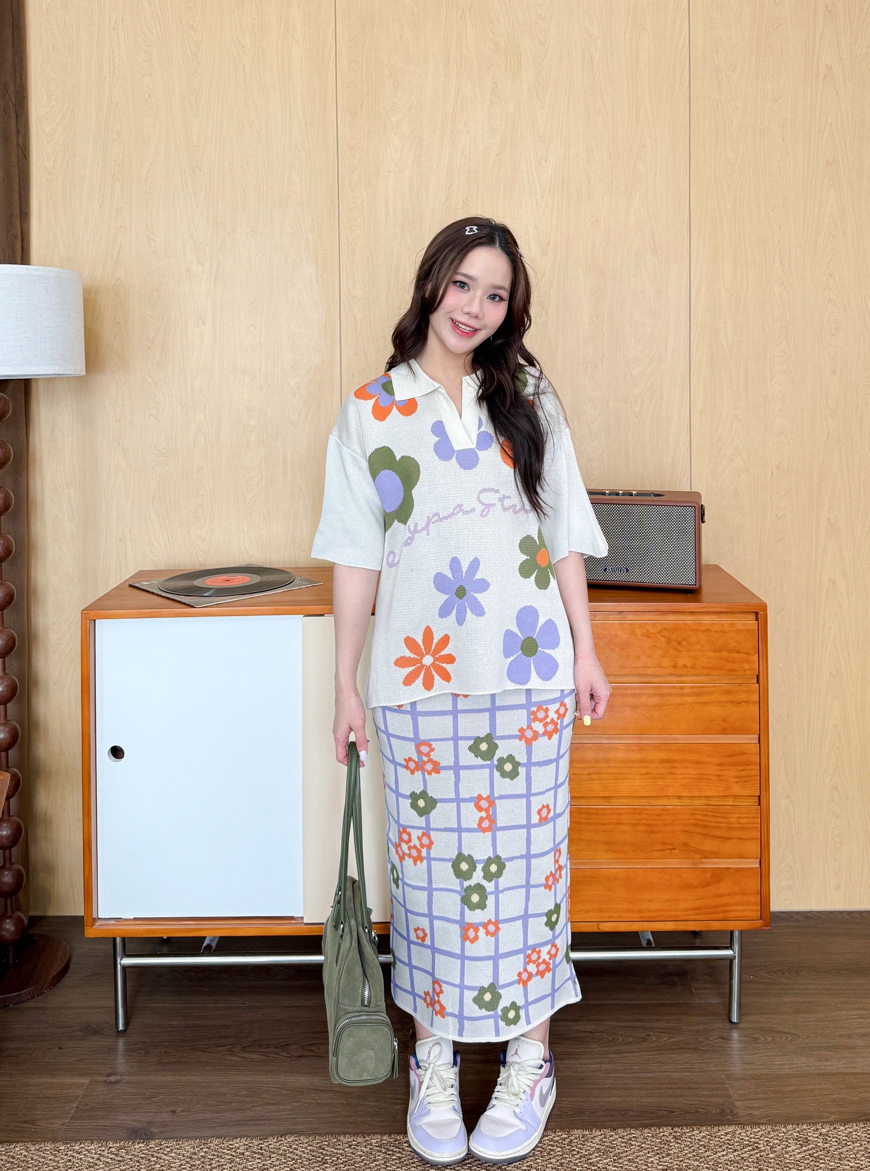 It’s paired with a floral check pencil skirt that beautifully contrasts with the top.