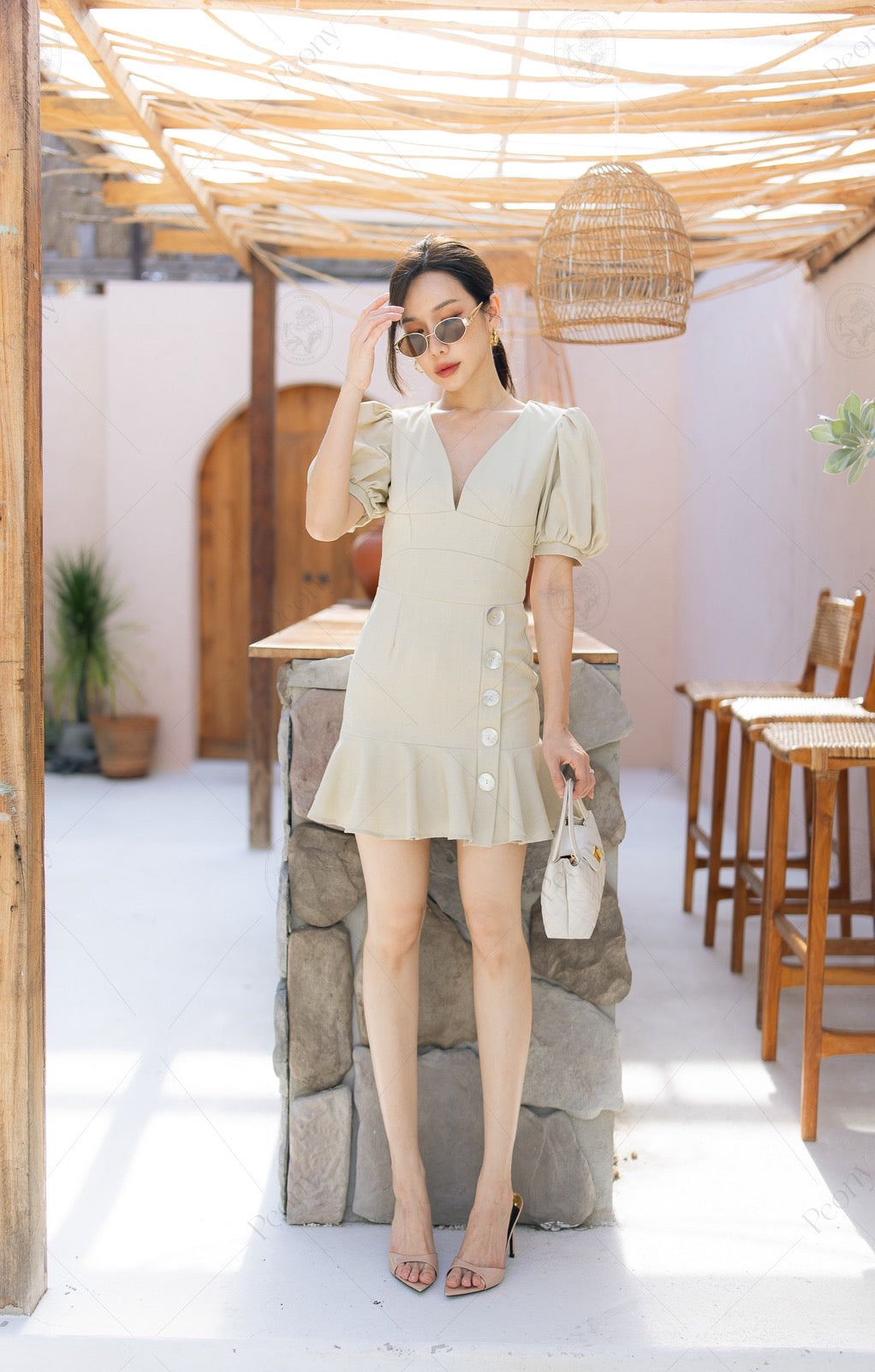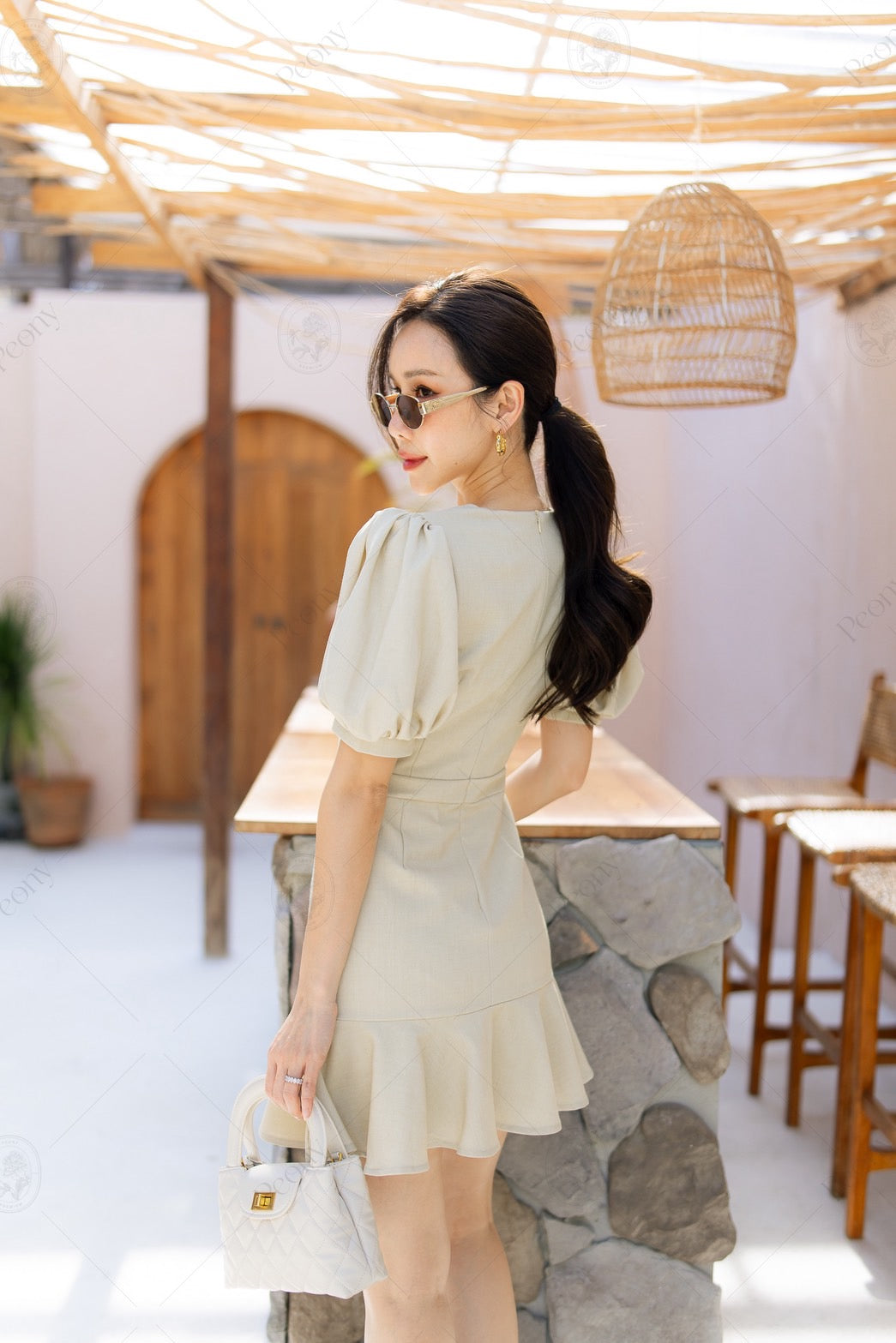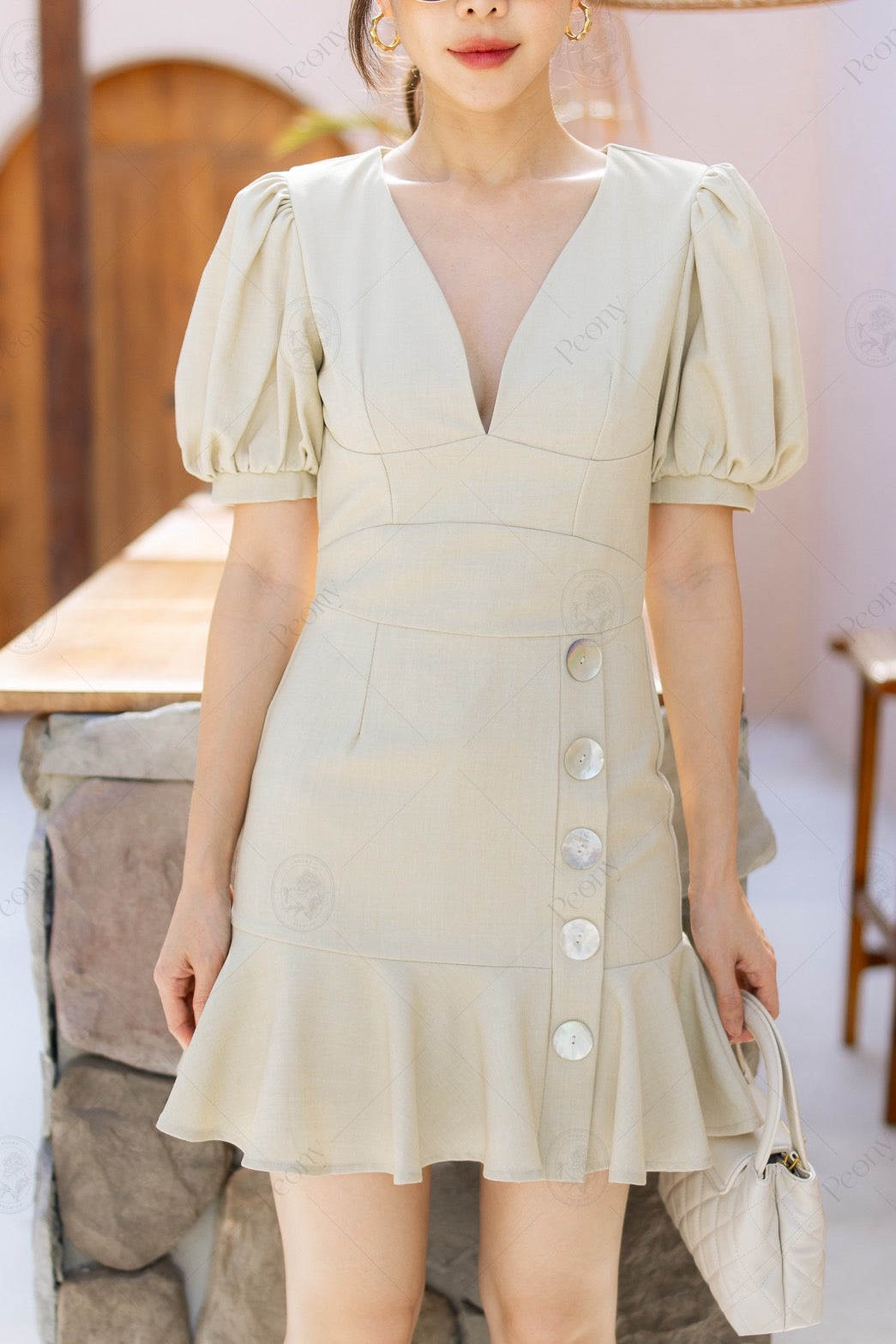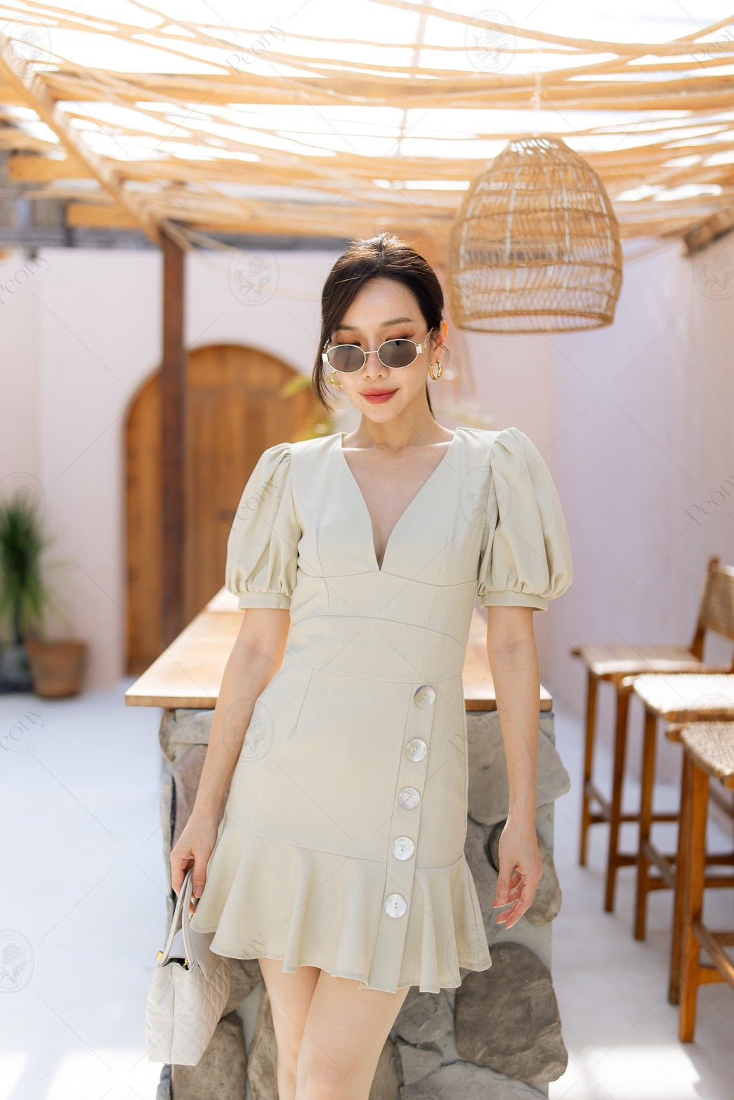 đ¤ A charming mini dress crafted from a woven blended fabric with delicate in-thread patterns. Features a flattering V-neckline, puffed sleeves, and shell button details. The ruffled hem adds a soft, feminine touch â perfect for any occasion. â¨