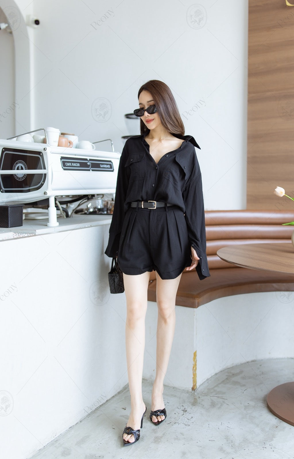 The relaxed-fit shirt features a chest pocket for a casual touch, paired with matching tailored shorts and a coordinating belt.