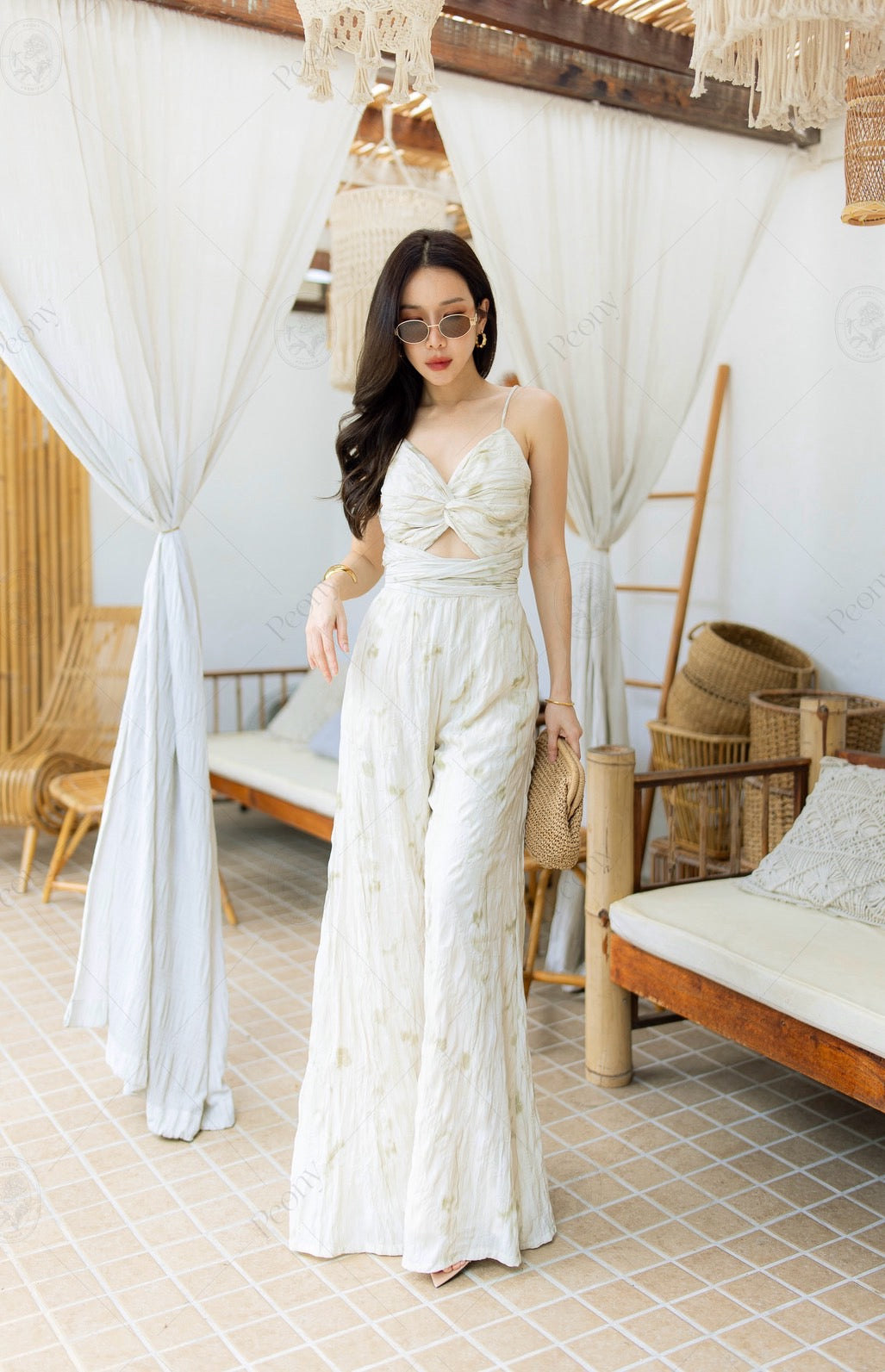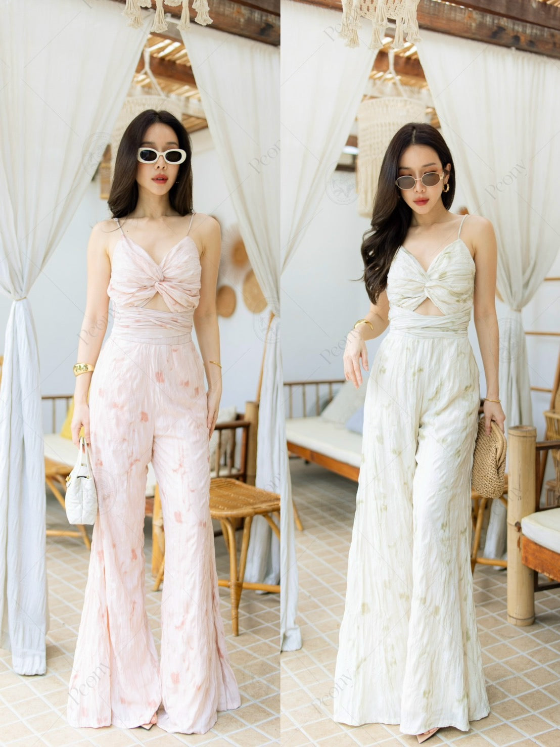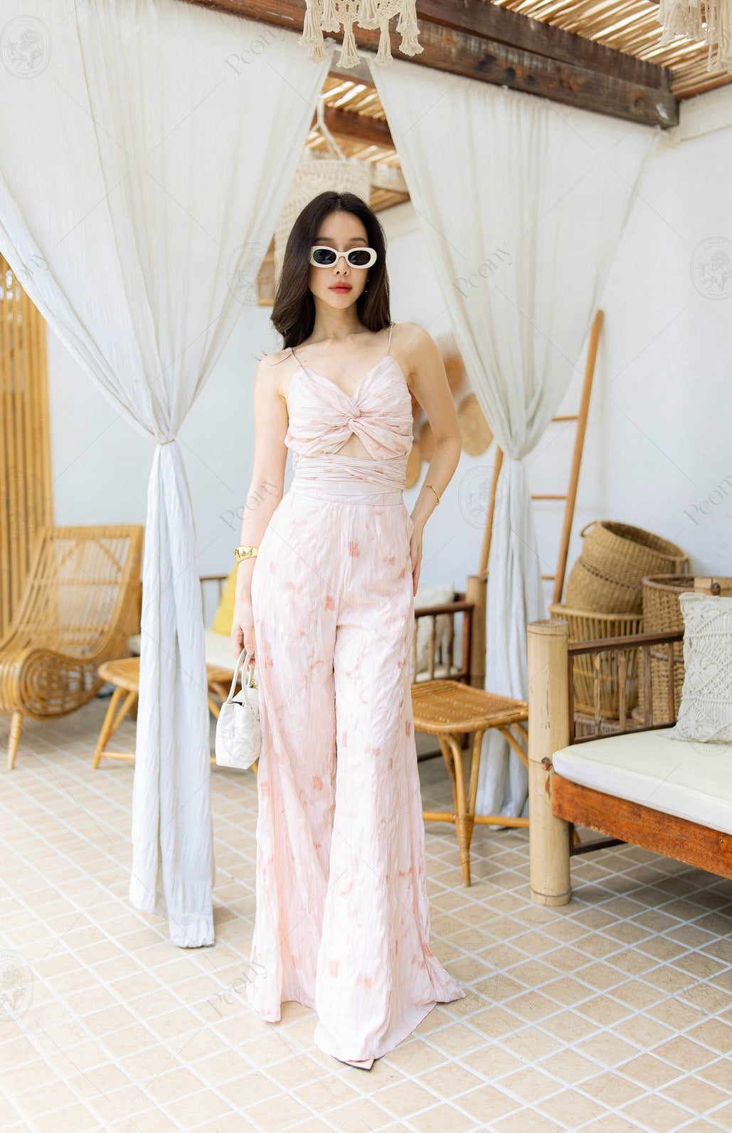 Made from premium crinkled fabric with a soft watercolor print, this set is breezy, lightweight, and ultra-comfortable. The cami top features adjustable straps, front ruching, and a wrap-around bow tie at the back for a flattering fit. Paired with high-waisted wide-leg white pants—fully lined for a smooth silhouette. A complete look that's sexy, elegant, and effortlessly chic.