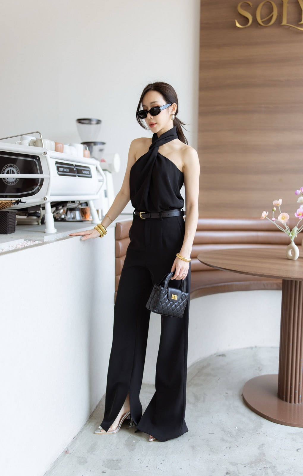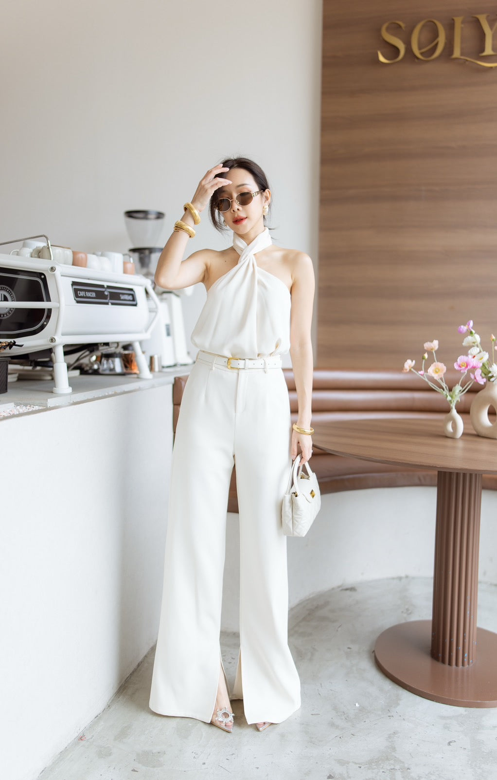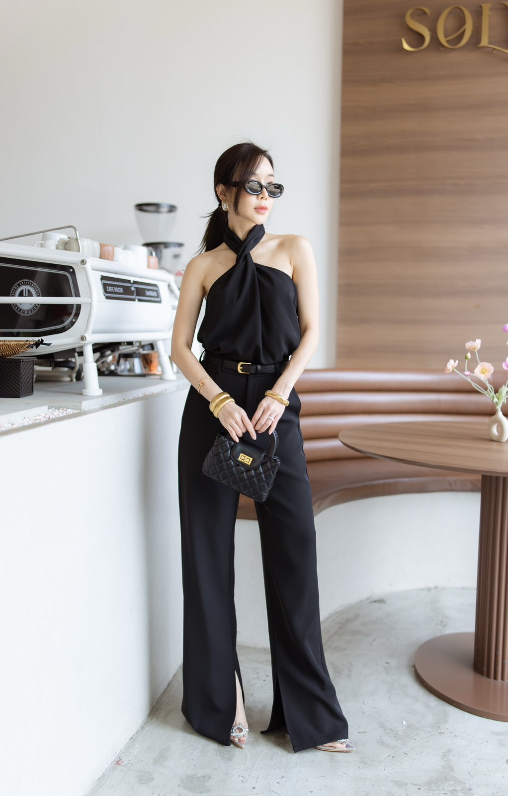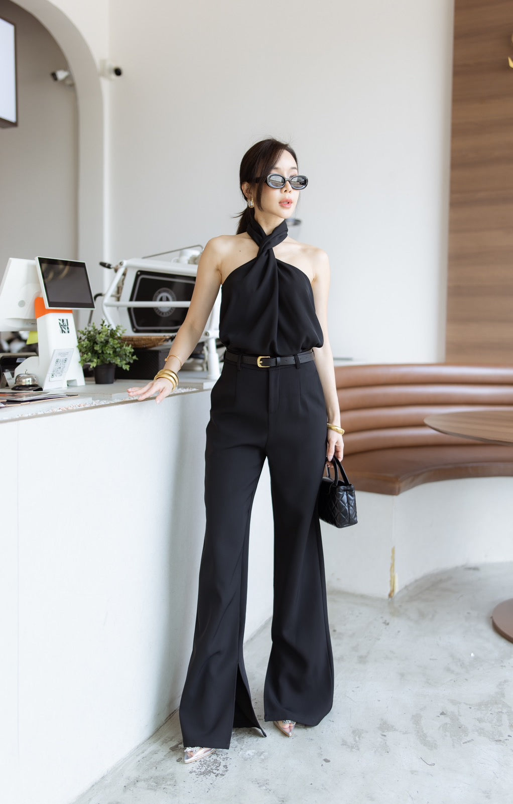 A chic two-piece set featuring a crossover neckline top made from lightweight, flowy fabric for ultimate comfort. Paired with matching pants detailed with side slits at the hem, complete with a gold buckle belt for a polished, elegant look.