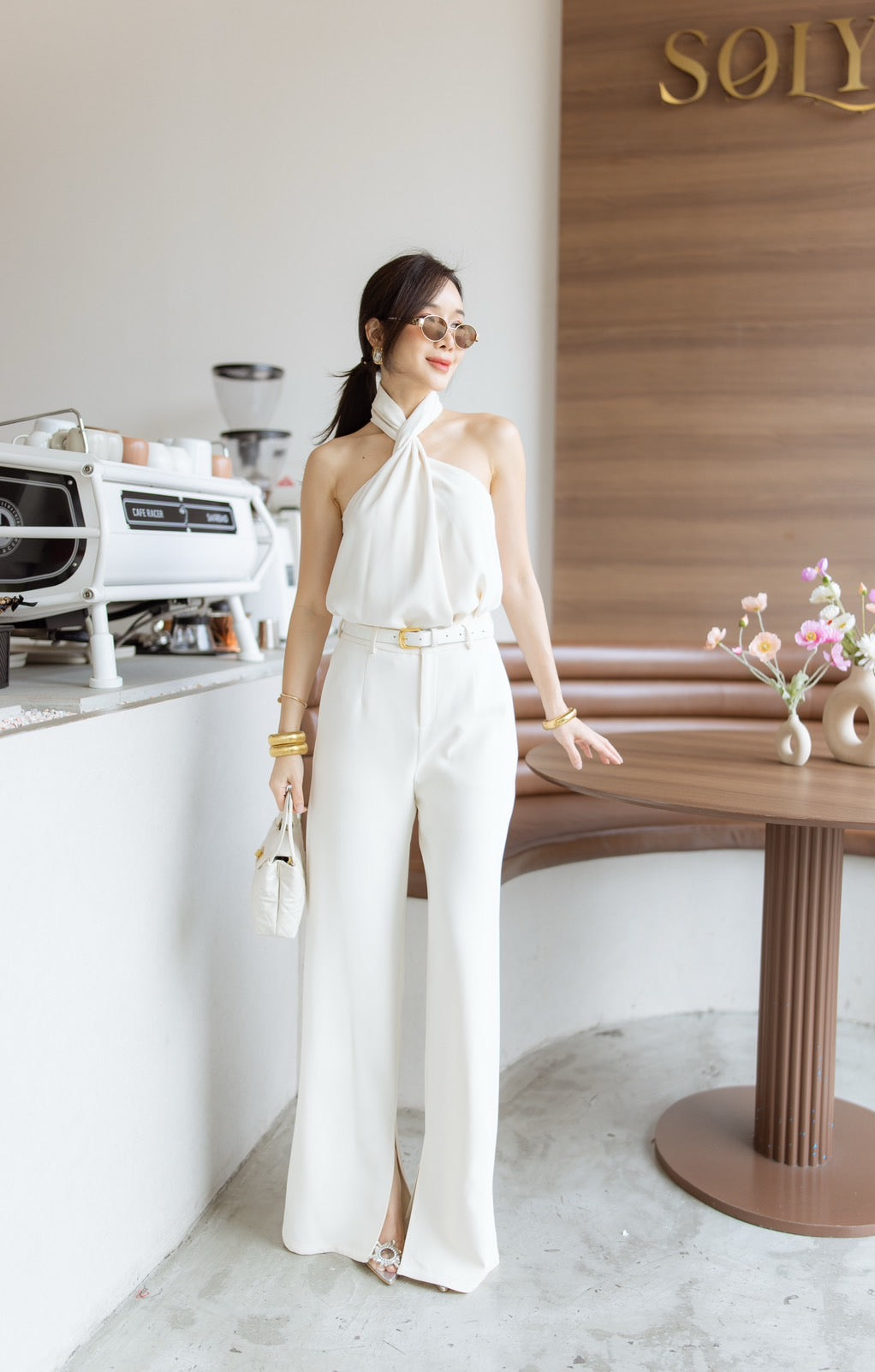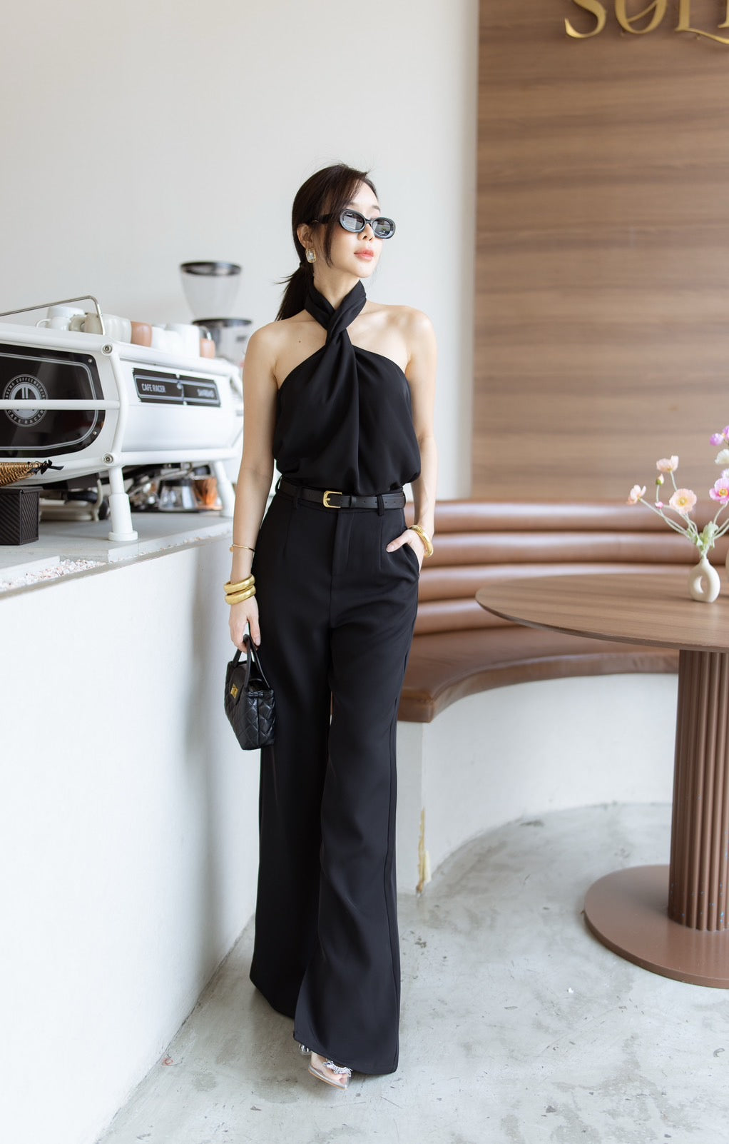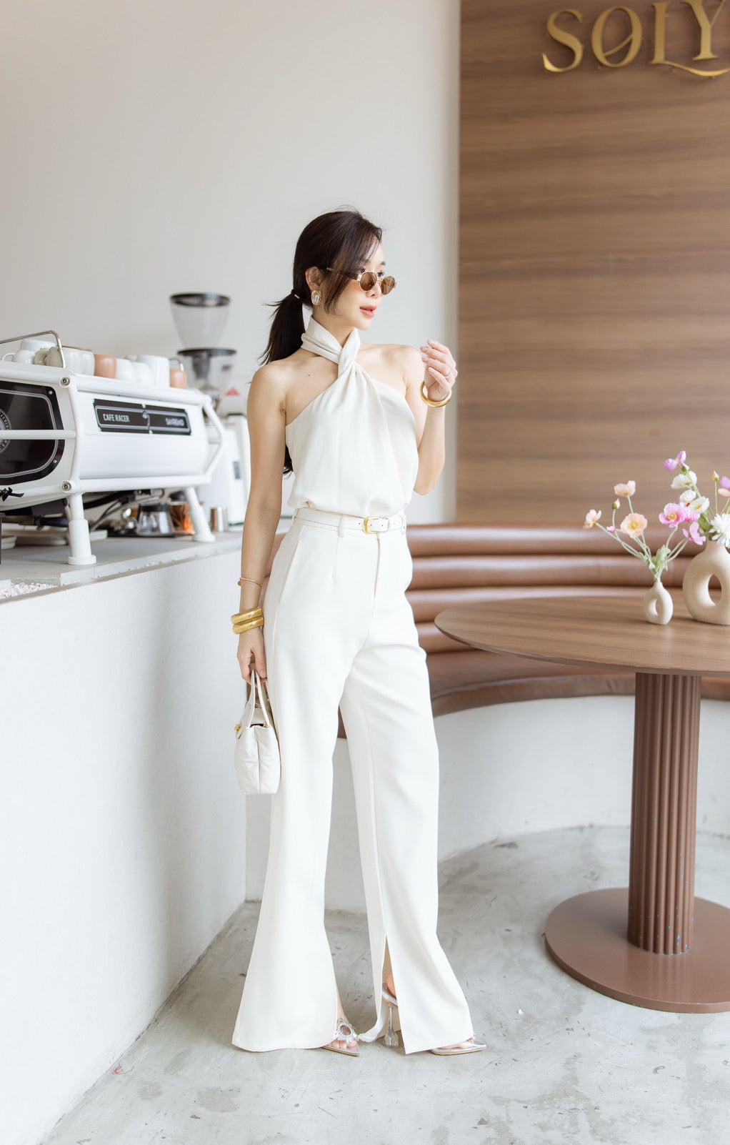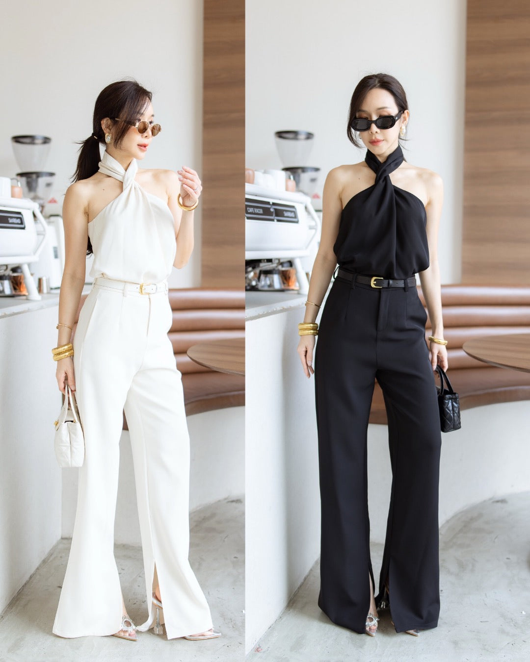 A chic two-piece set featuring a crossover neckline top made from lightweight, flowy fabric for ultimate comfort. Paired with matching pants detailed with side slits at the hem, complete with a gold buckle belt for a polished, elegant look.