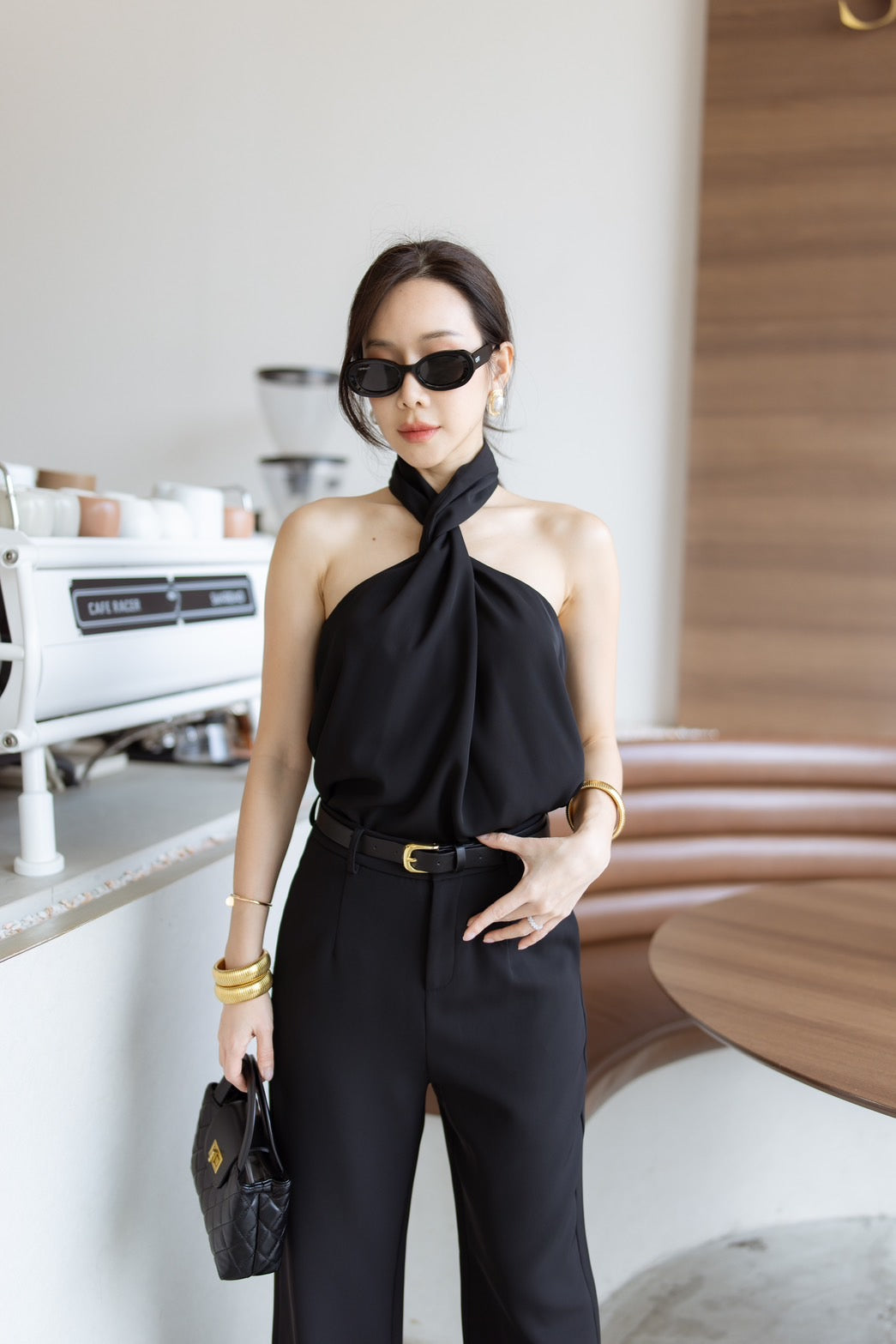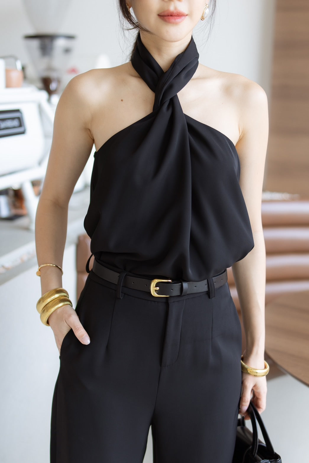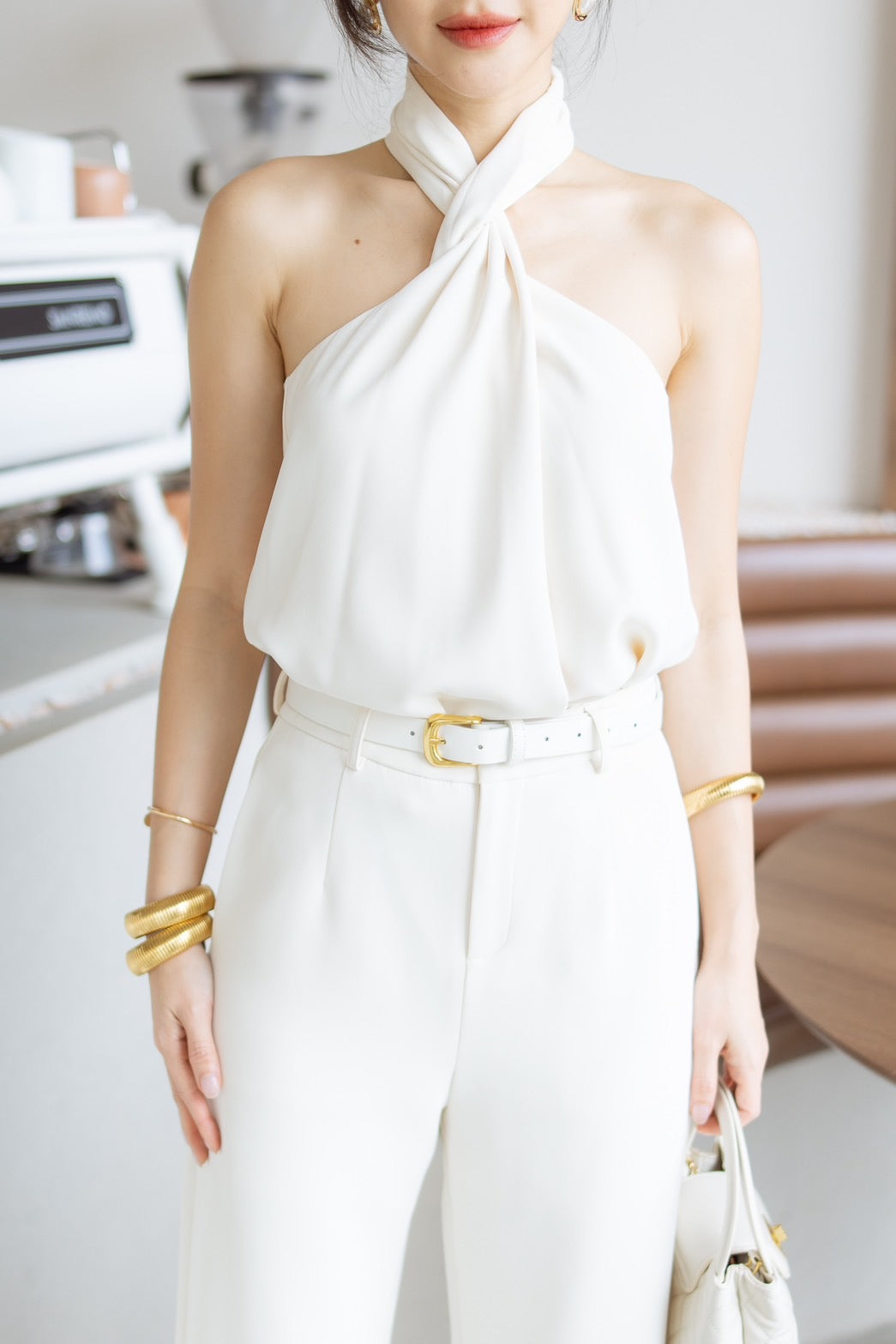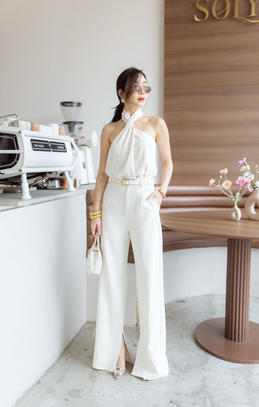 A chic two-piece set featuring a crossover neckline top made from lightweight, flowy fabric for ultimate comfort. Paired with matching pants detailed with side slits at the hem, complete with a gold buckle belt for a polished, elegant look.