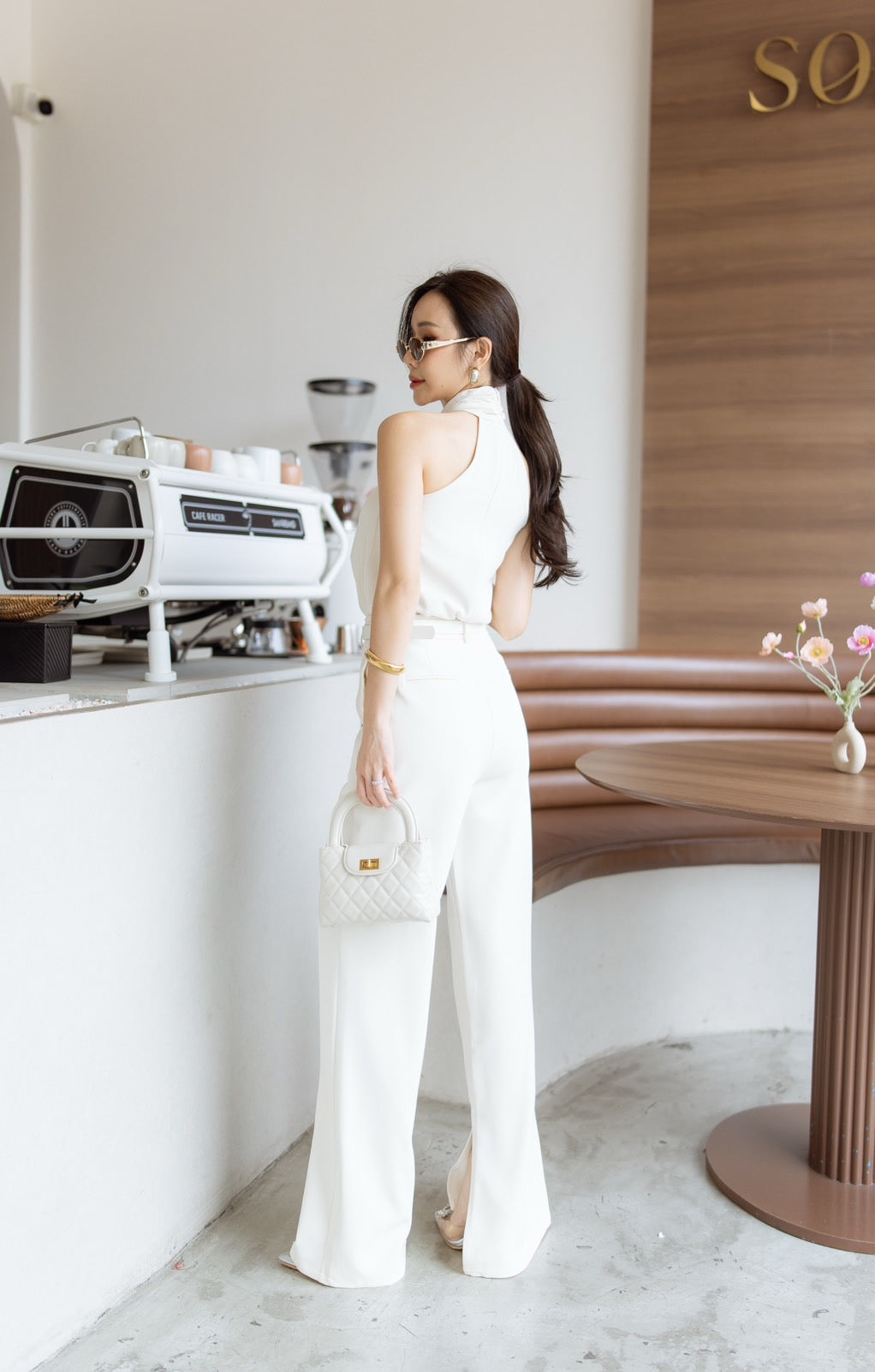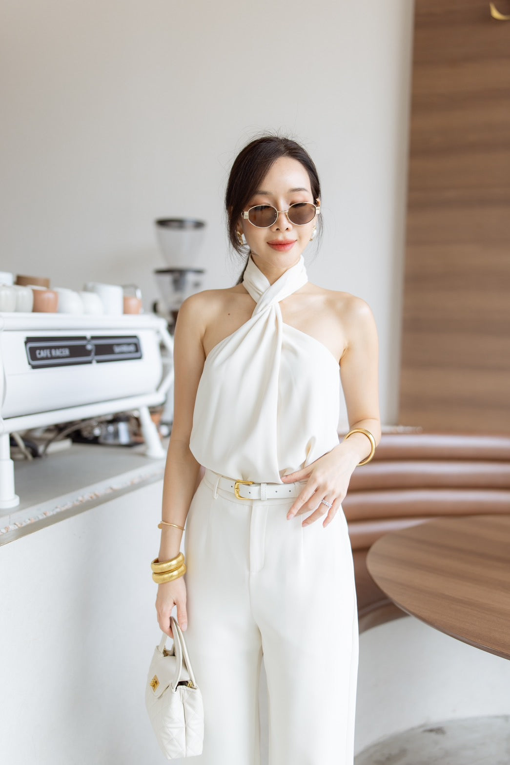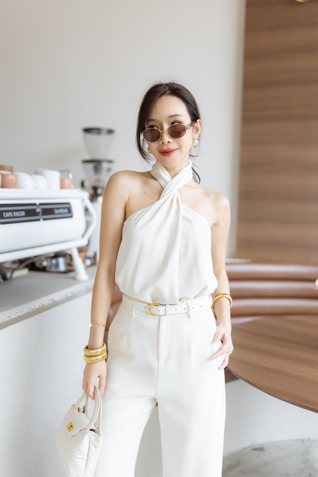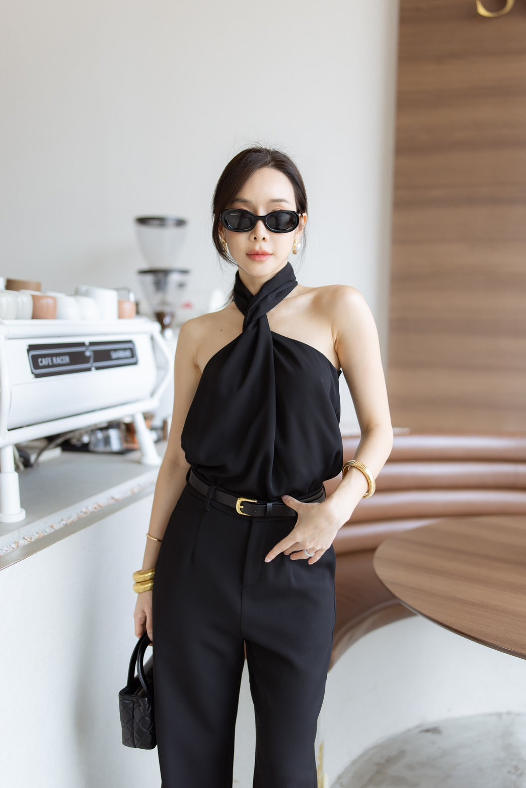 A chic two-piece set featuring a crossover neckline top made from lightweight, flowy fabric for ultimate comfort. Paired with matching pants detailed with side slits at the hem, complete with a gold buckle belt for a polished, elegant look.
