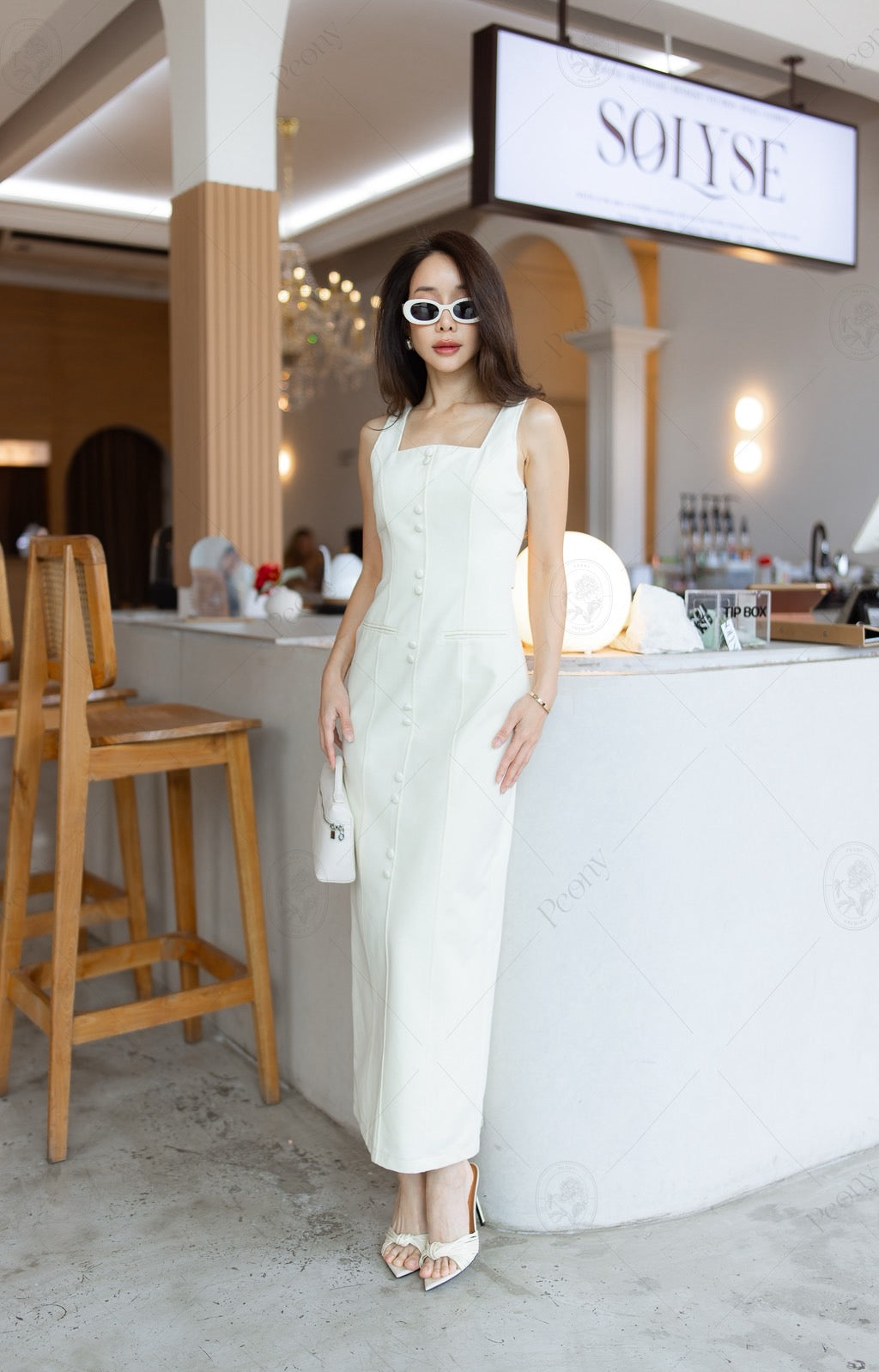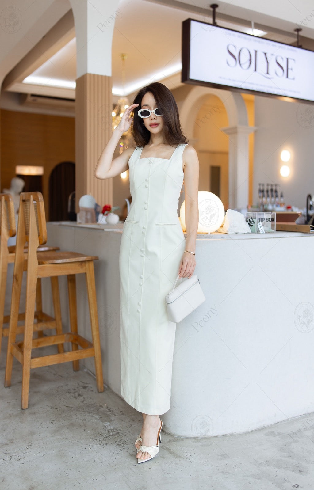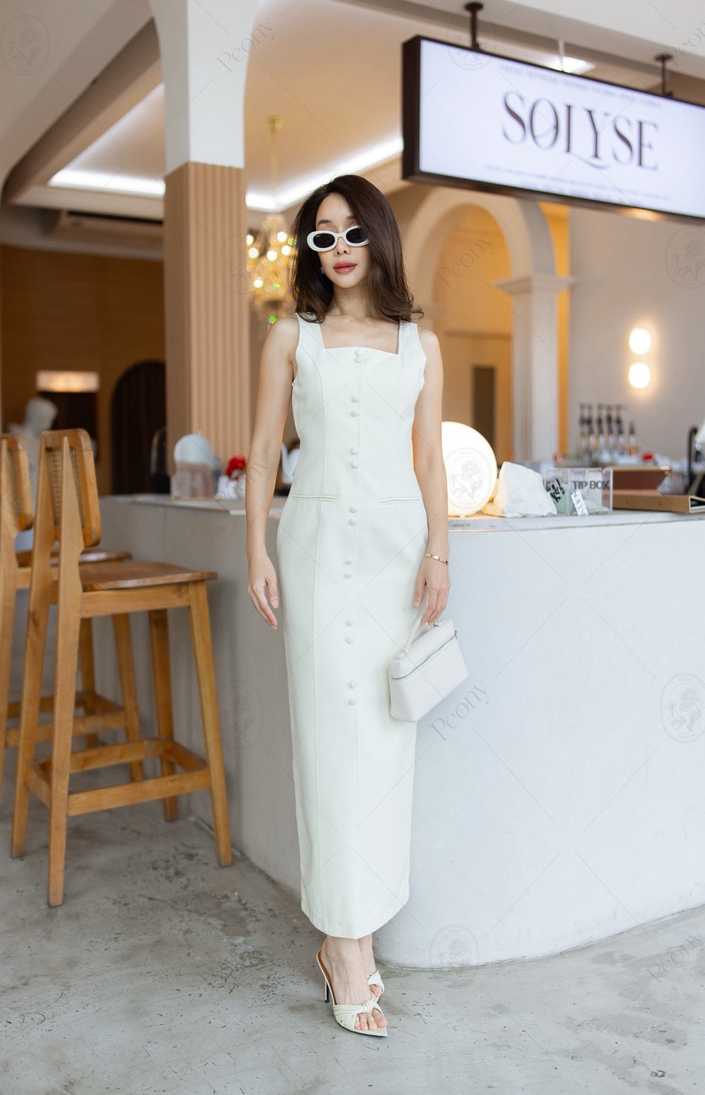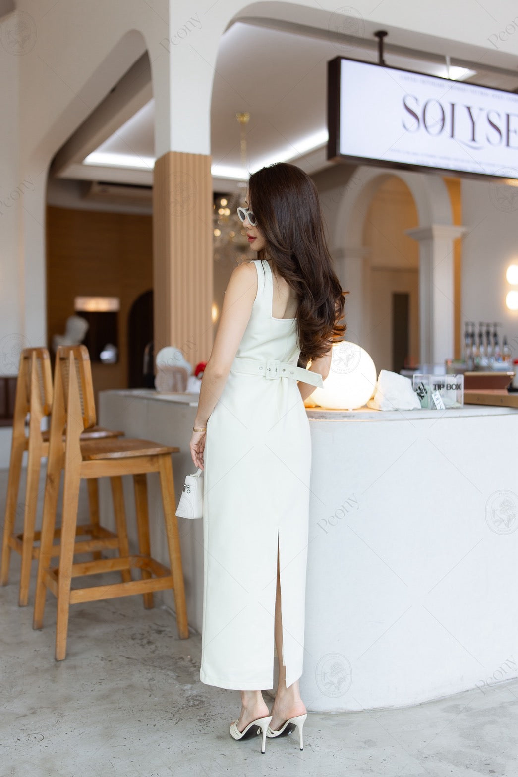Features a square neckline, front button detailing, hidden side zipper, and a back belt strap for a flattering silhouette.