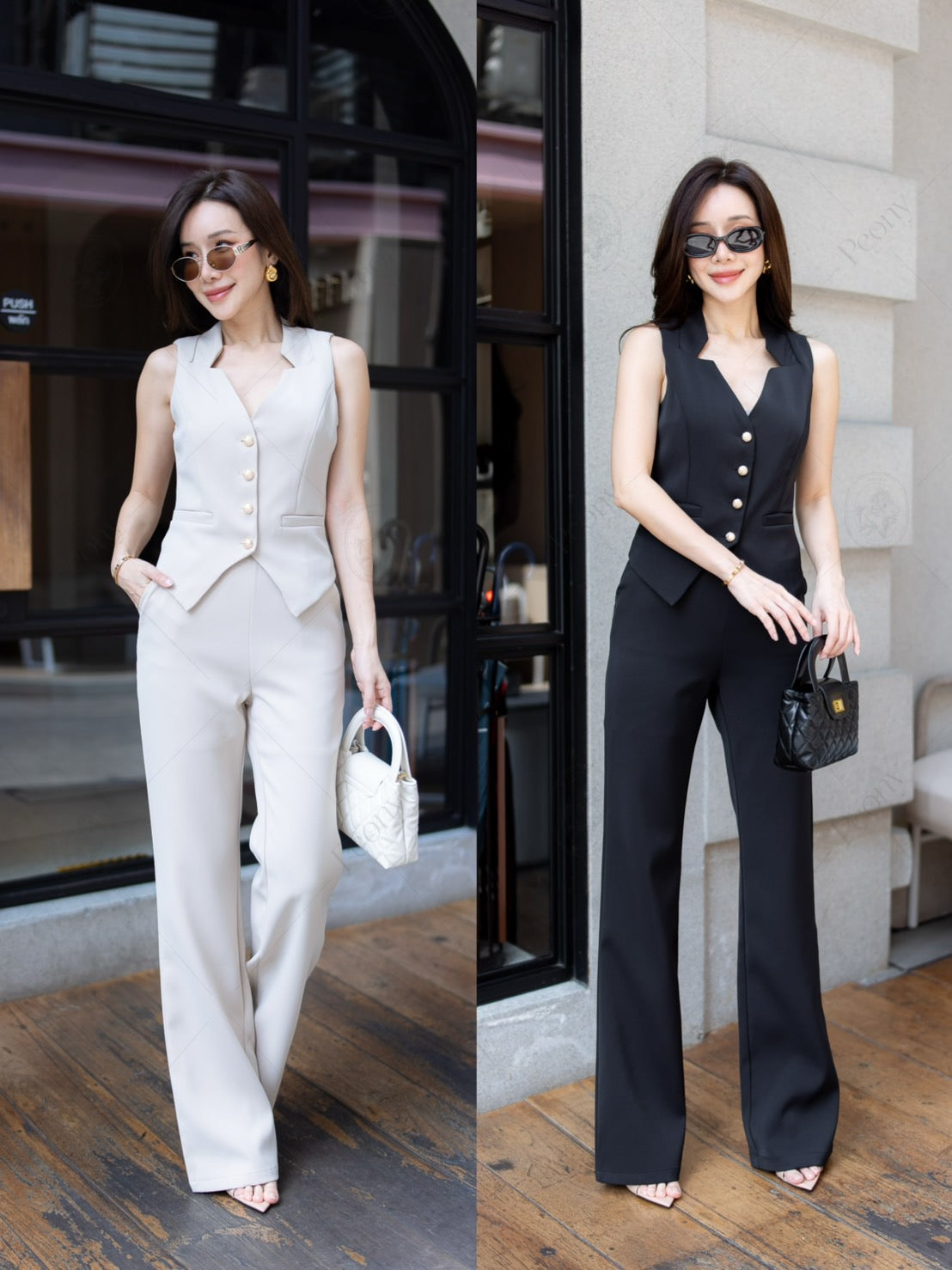 This chic set features a button-up top with a unique scalloped neckline and classy gold buttons. Paired with matching long pants for a complete, polished look. Perfect for any occasion—stylish, confident, and effortlessly put-together.