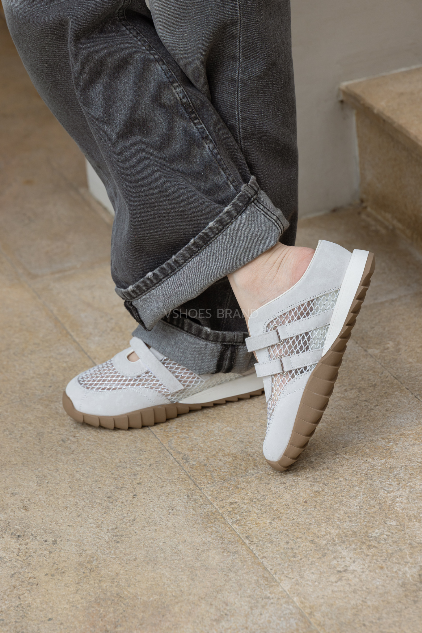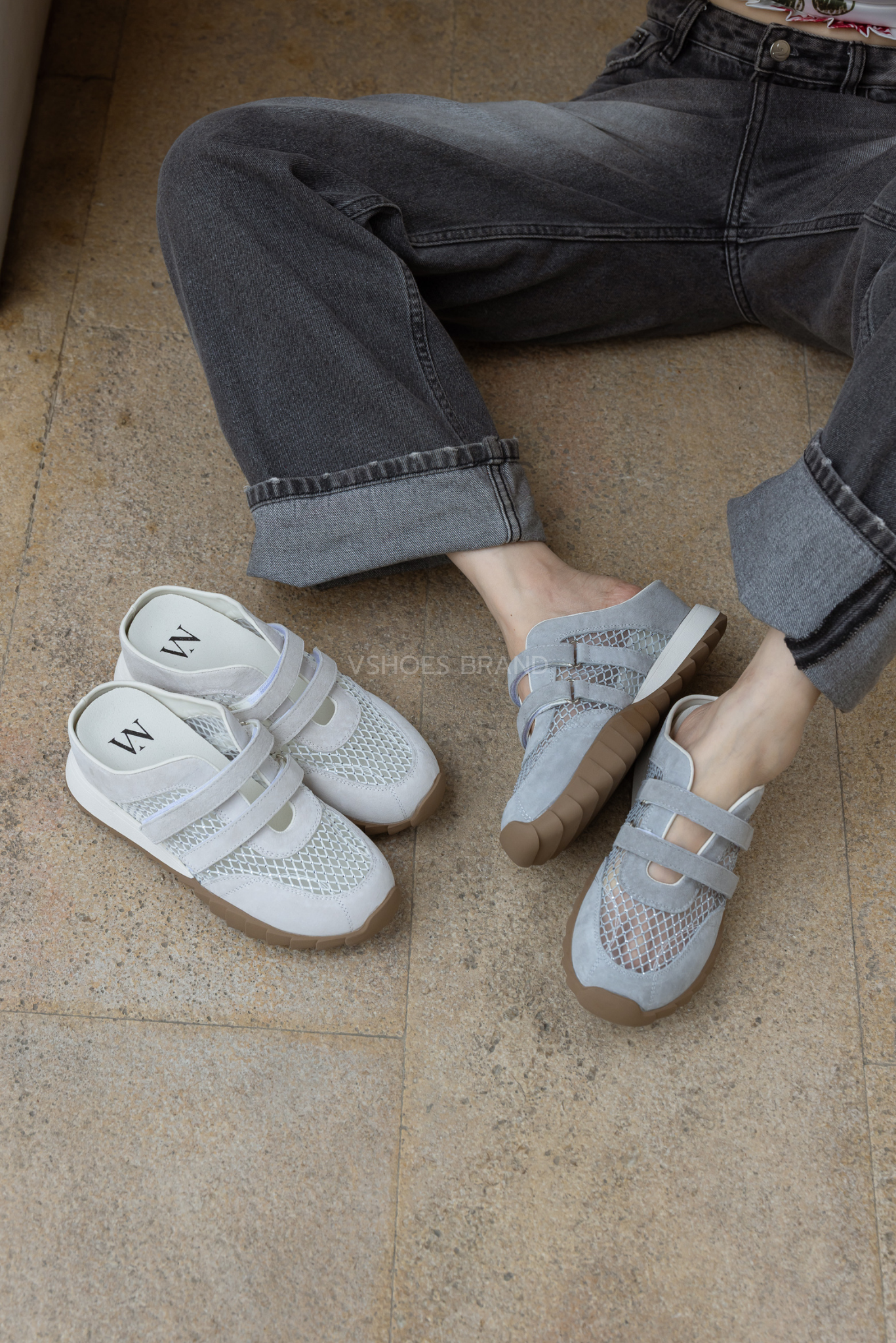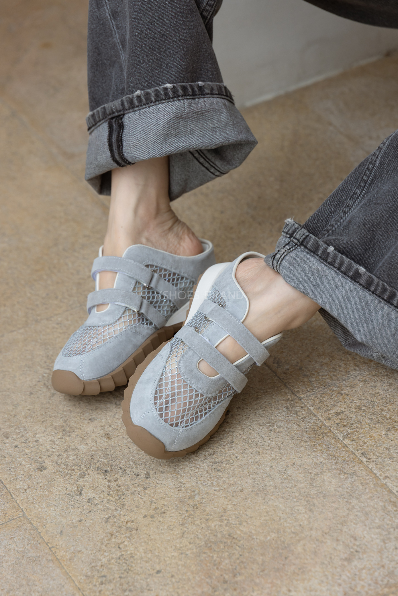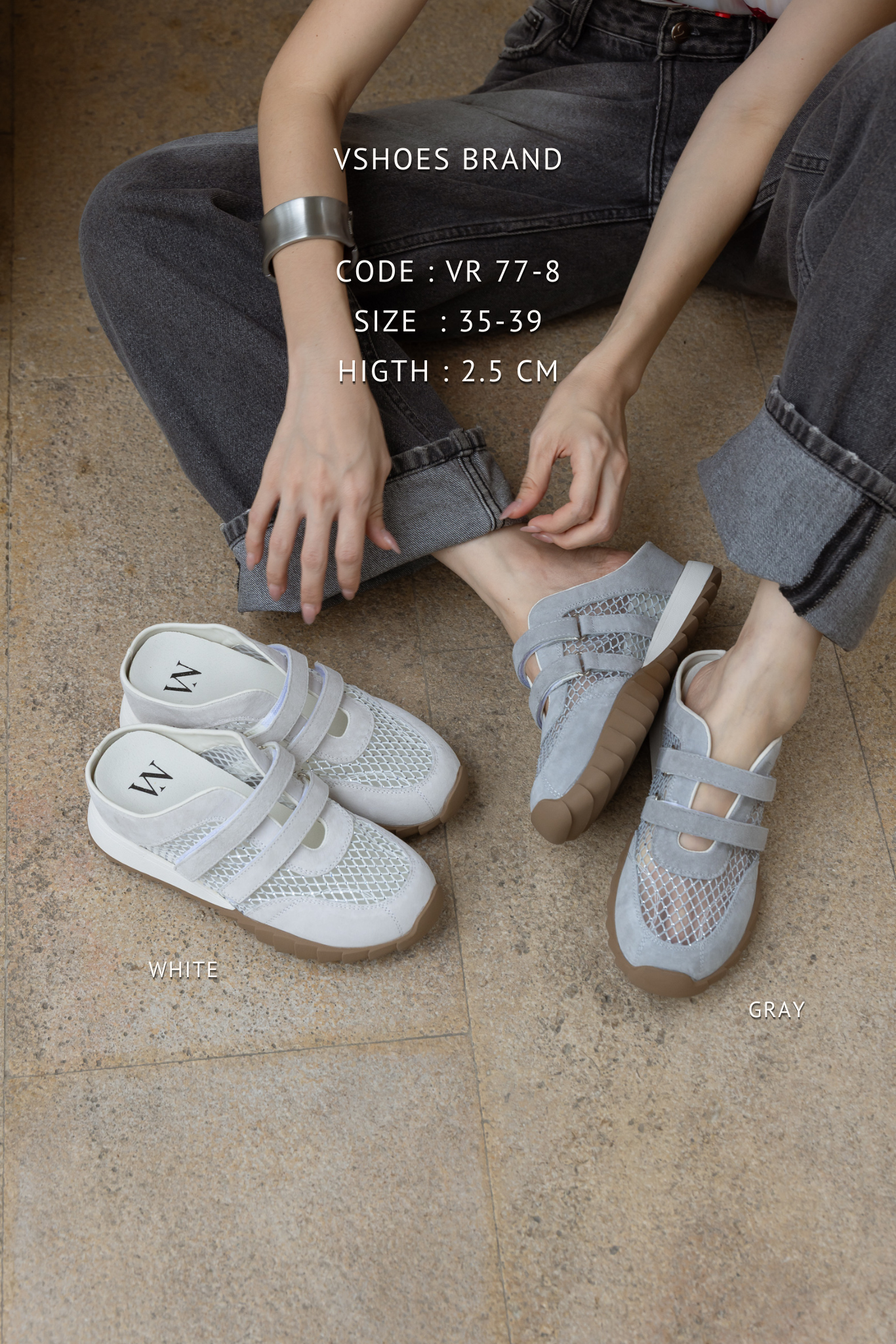 รองเท้าผ้าใบเปิดส้น หนังกลับ ตาข่าย แต่งเพชร สายคาด 2 เส้น