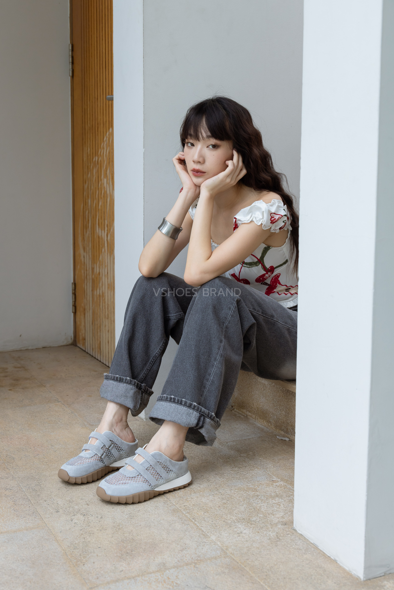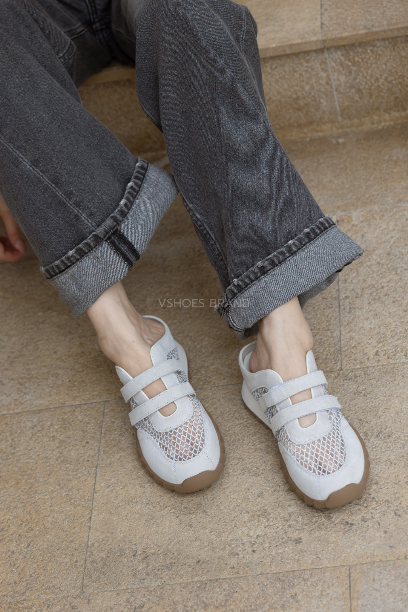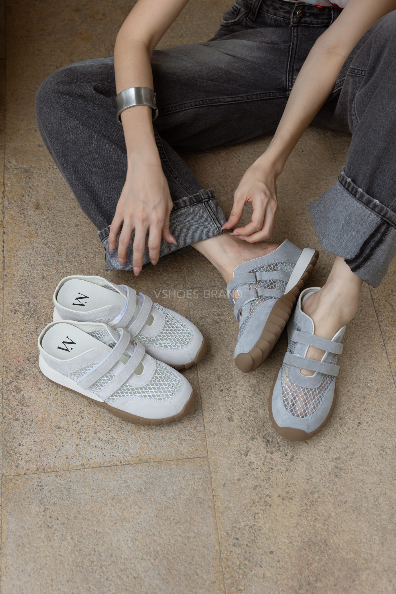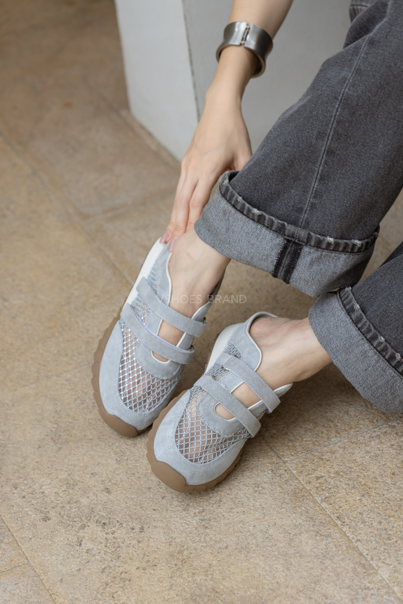 รองเท้าผ้าใบเปิดส้น หนังกลับ ตาข่าย แต่งเพชร สายคาด 2 เส้น