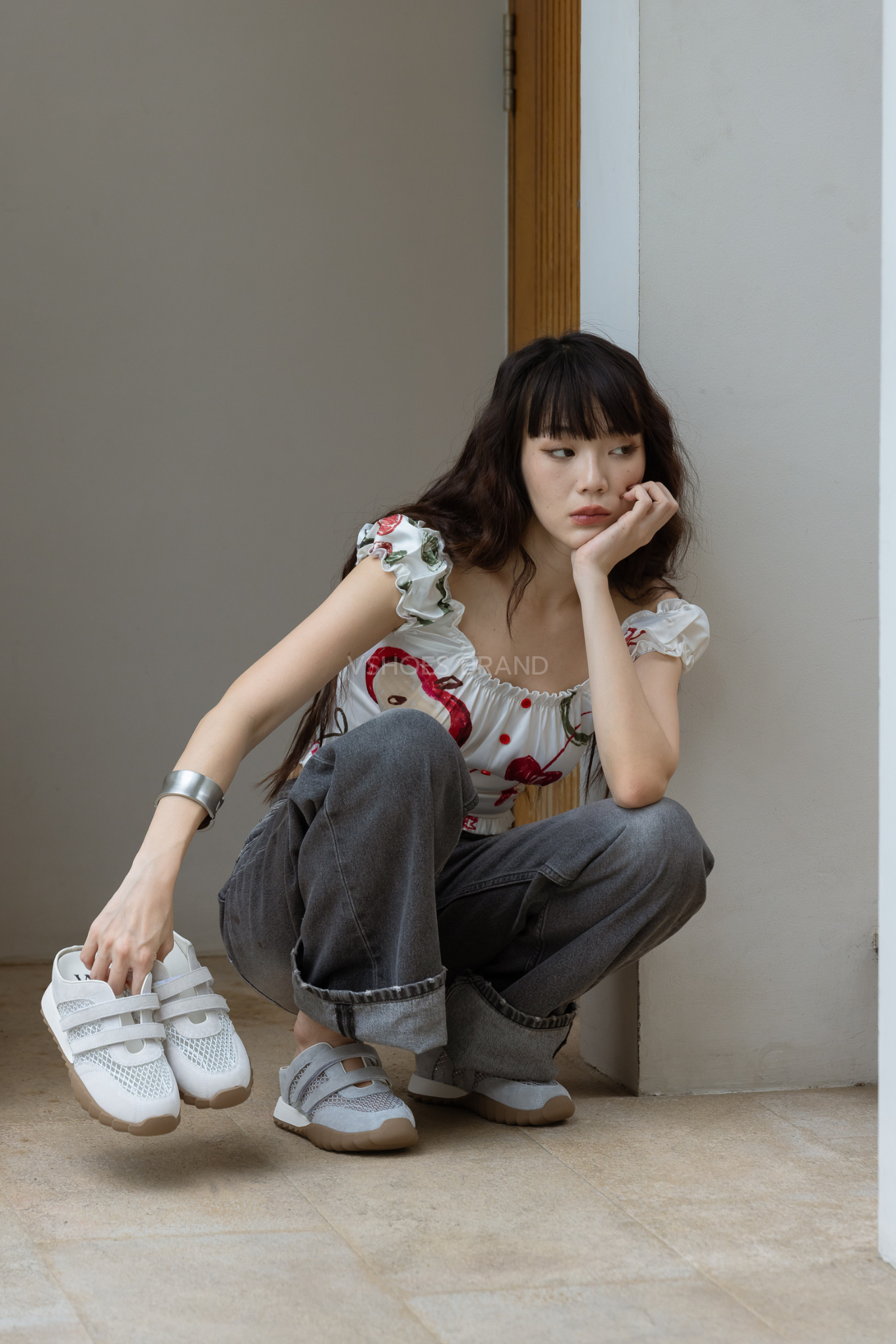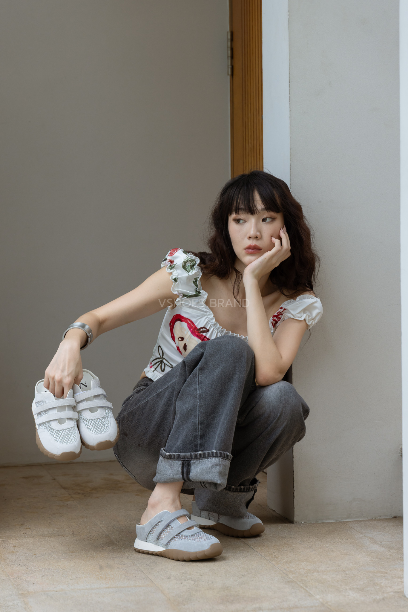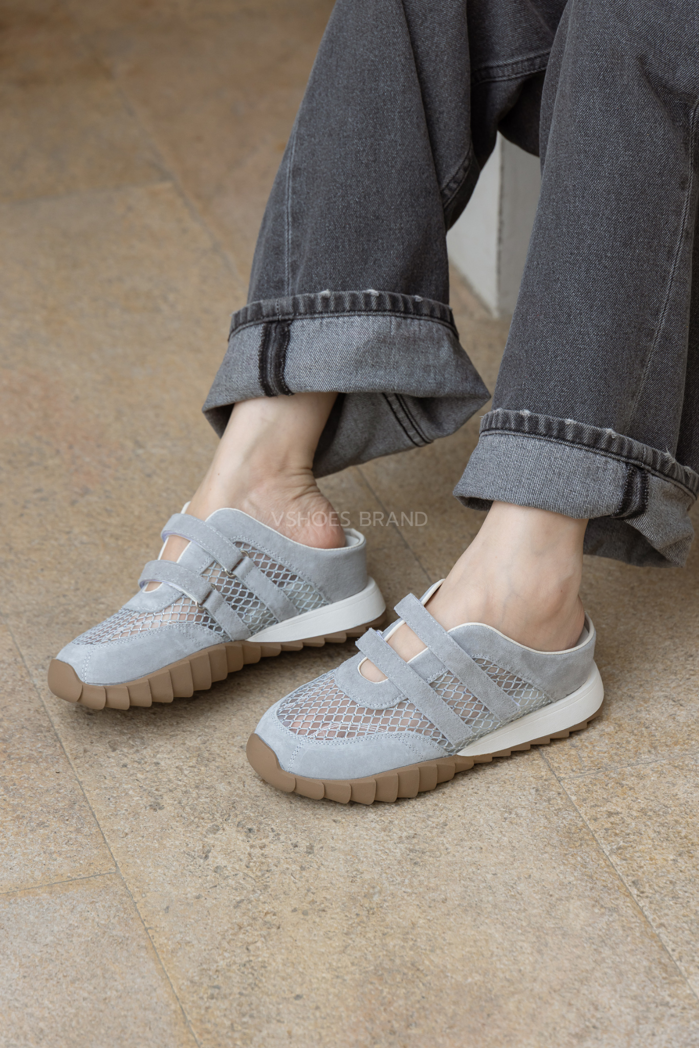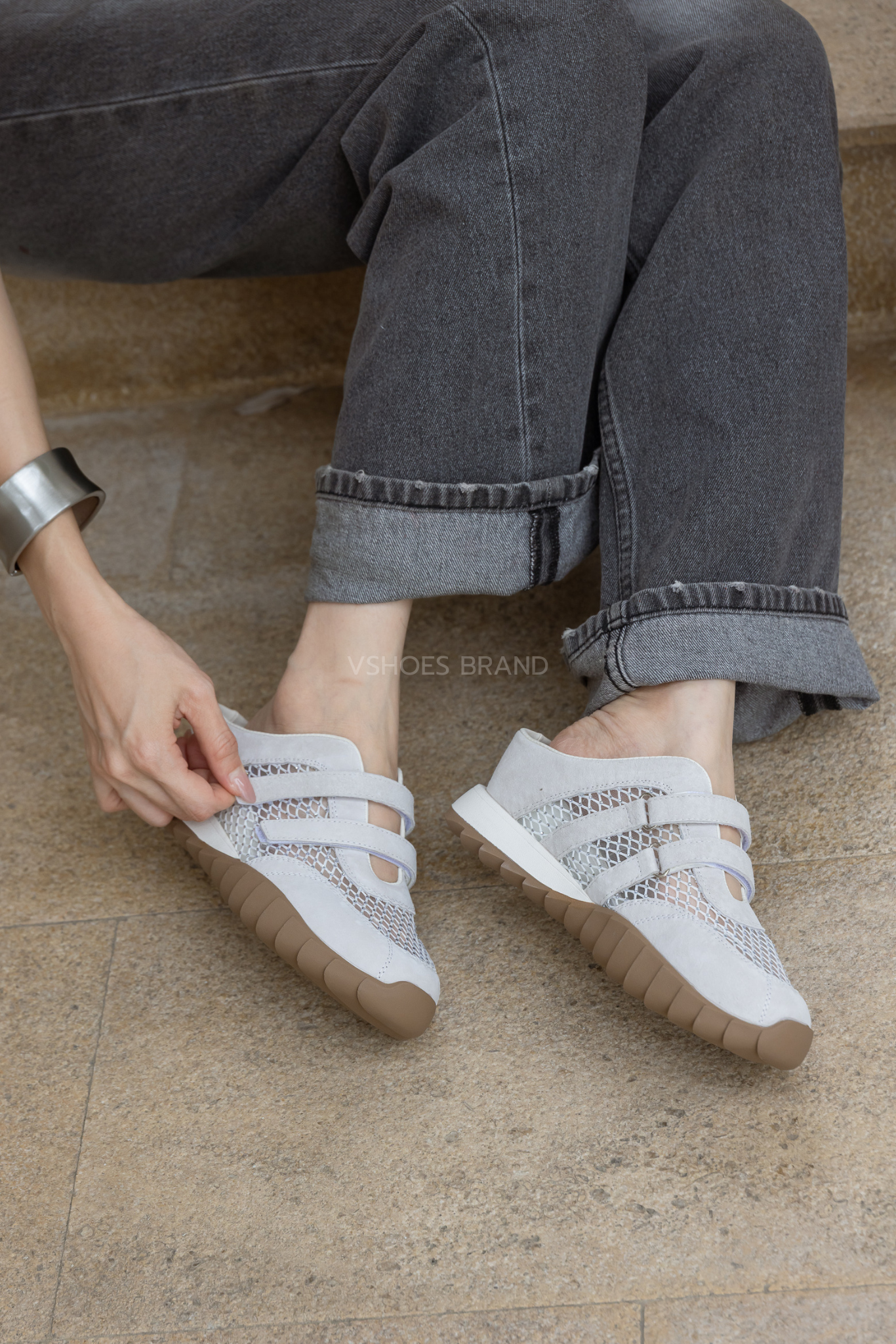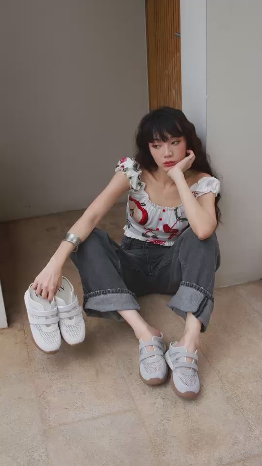 รองเท้าผ้าใบเปิดส้น หนังกลับ ตาข่าย แต่งเพชร สายคาด 2 เส้น