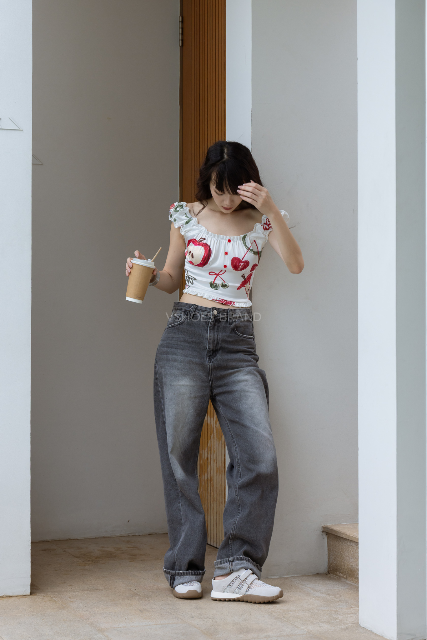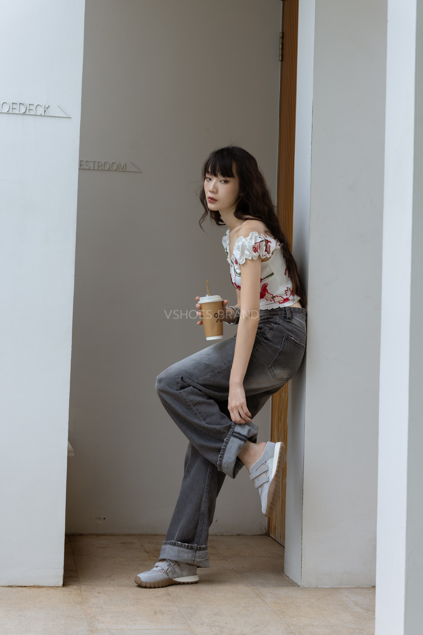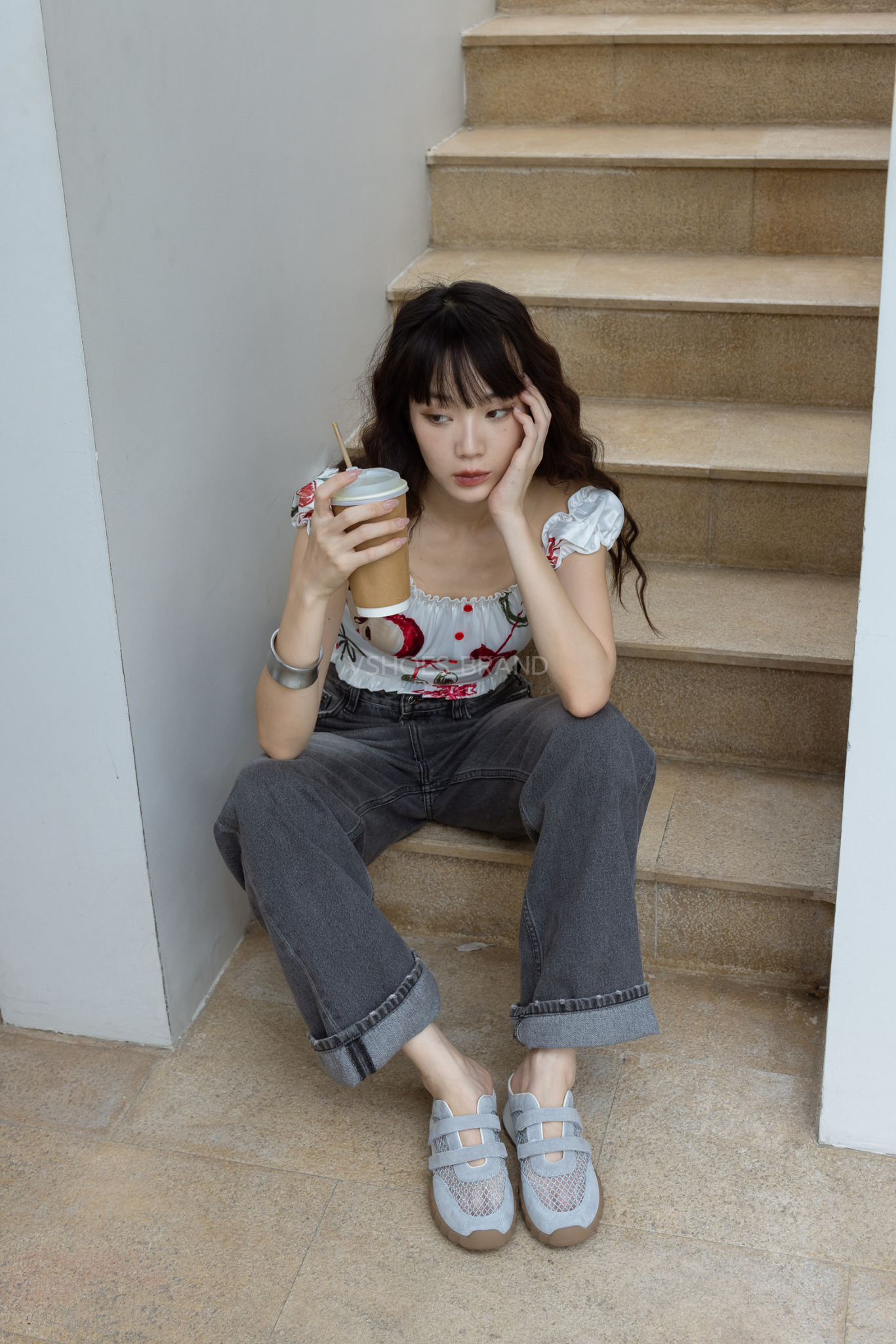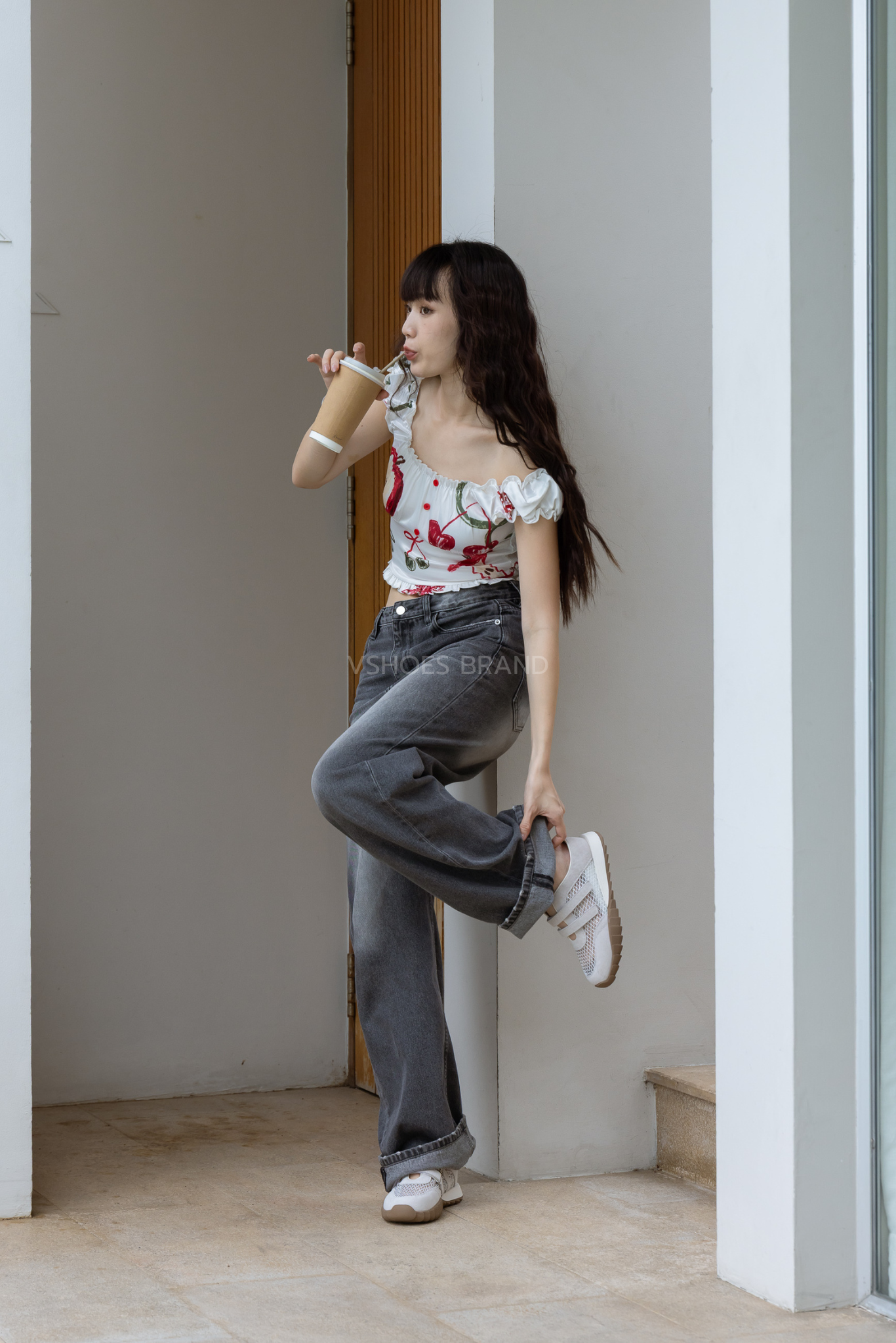 รองเท้าผ้าใบเปิดส้น หนังกลับ ตาข่าย แต่งเพชร สายคาด 2 เส้น