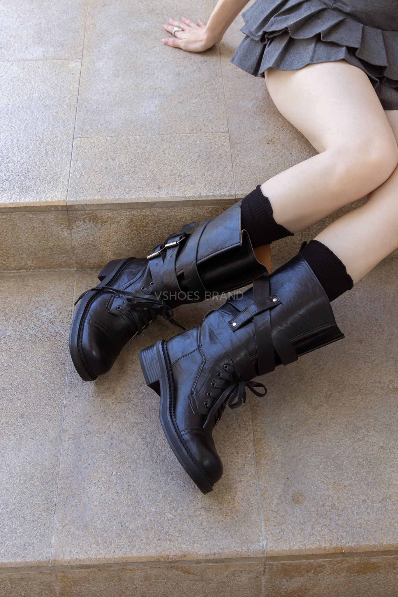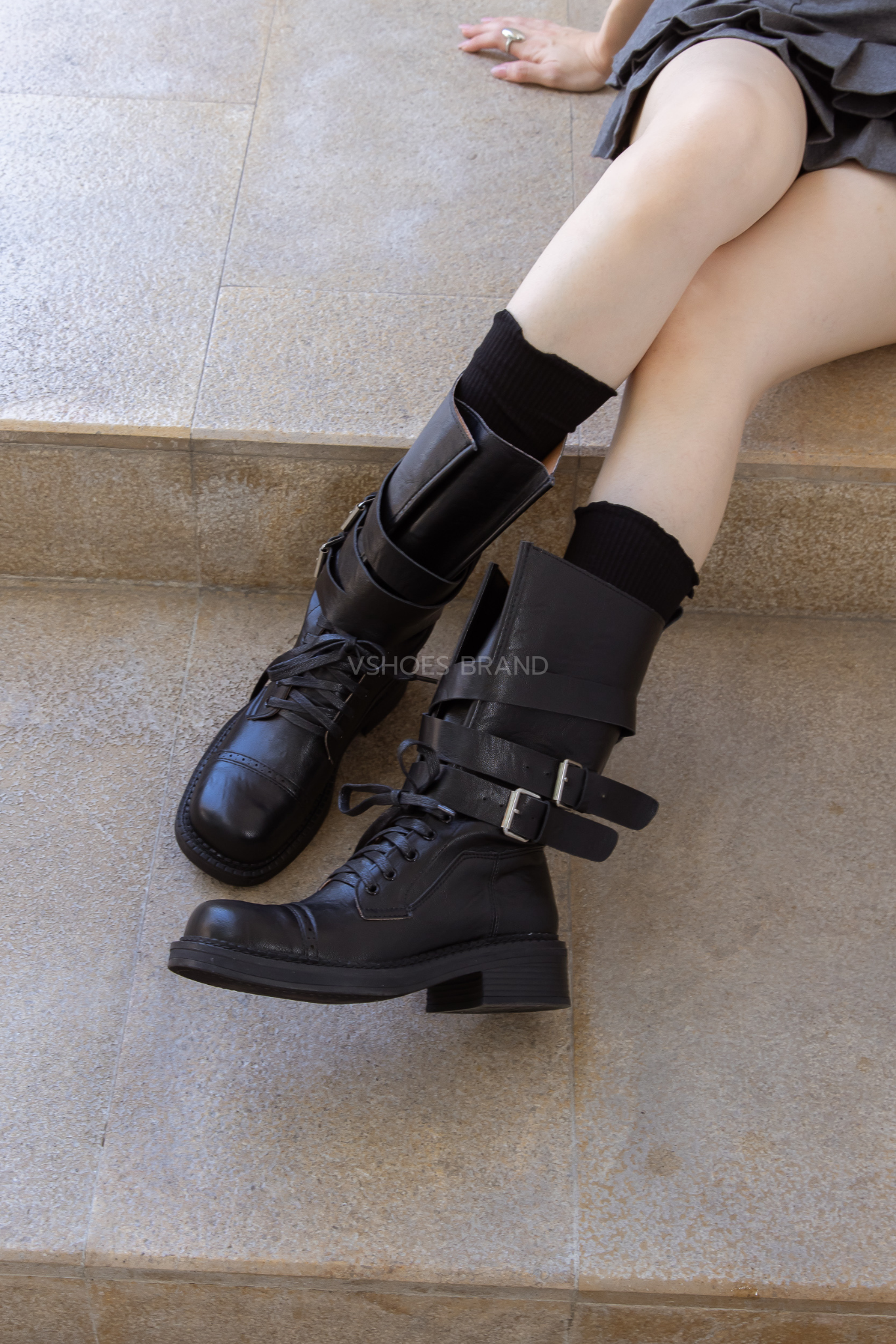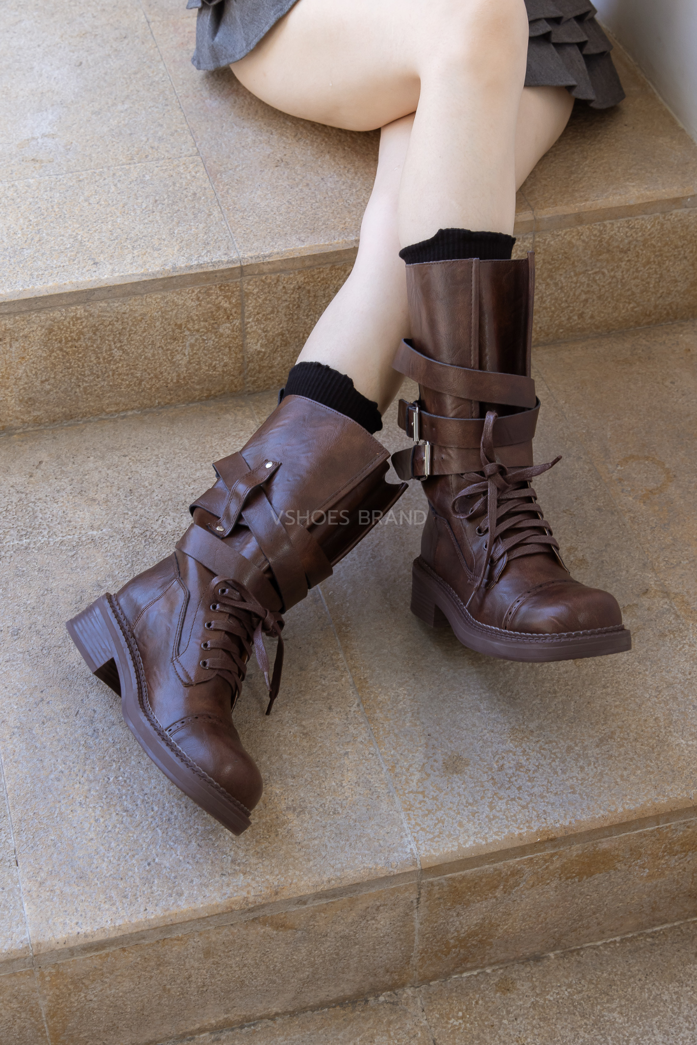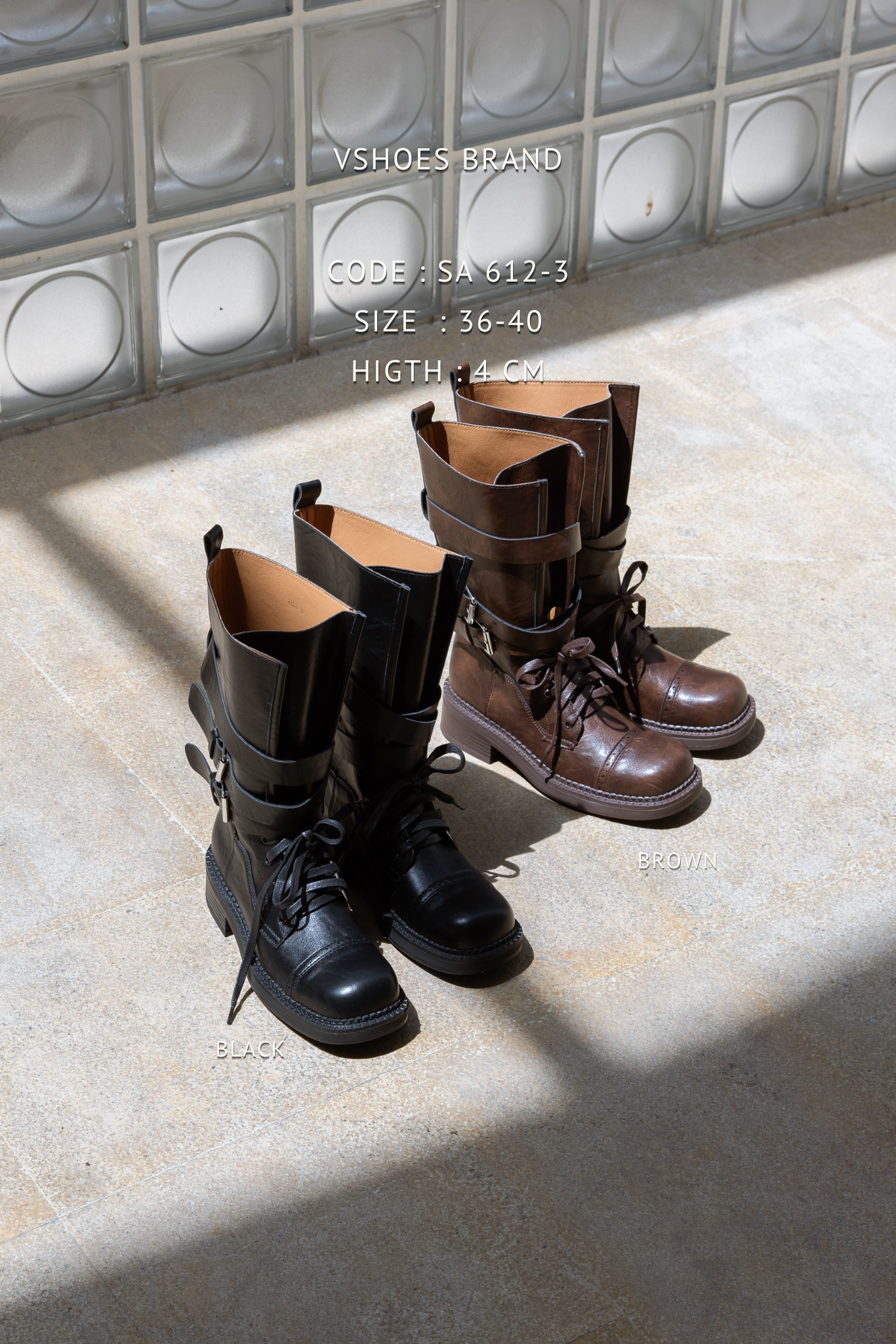 รองเท้าบูทหนัง ข้อสั้น แต่งเชือก + เข็มขัดด้านข้าง