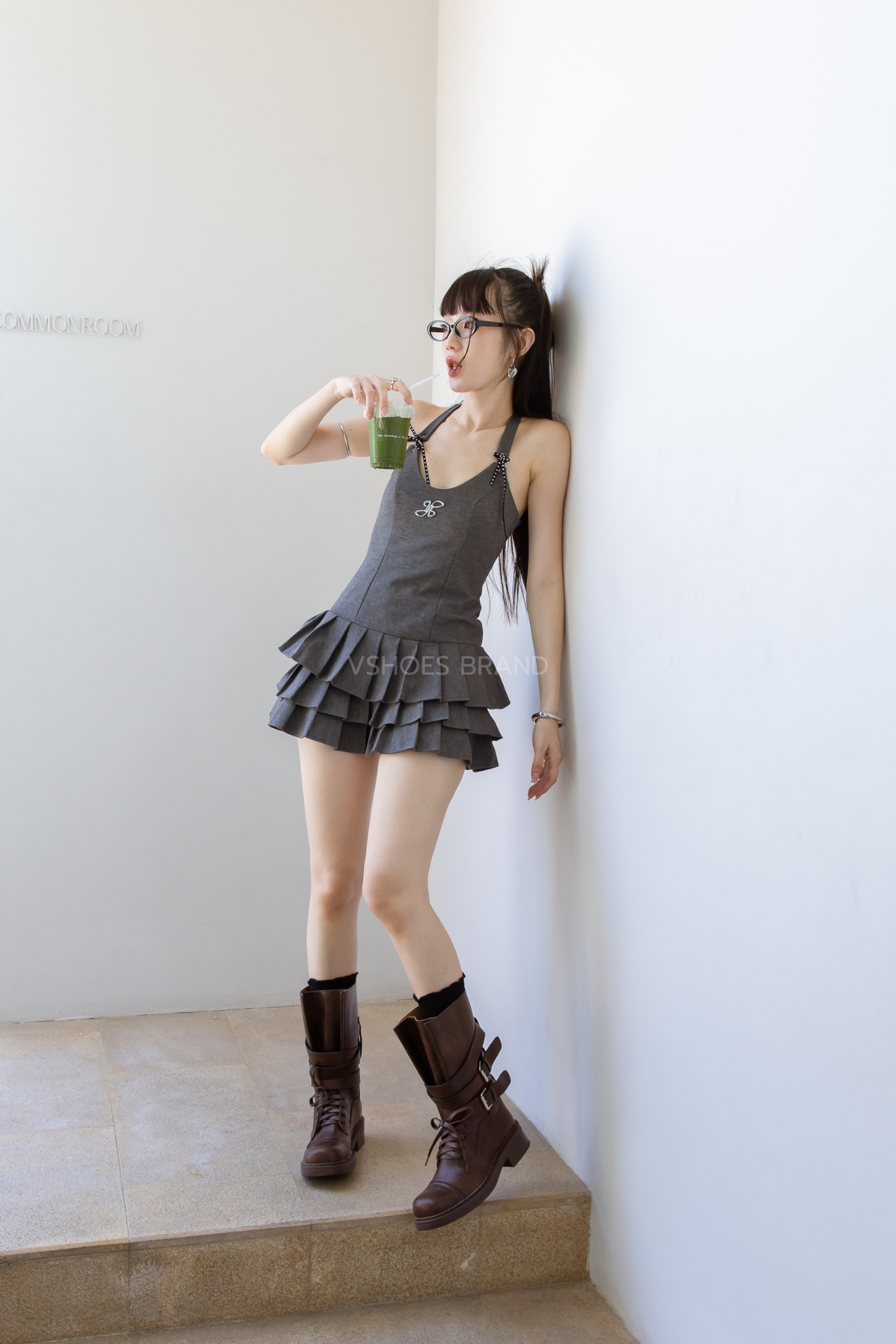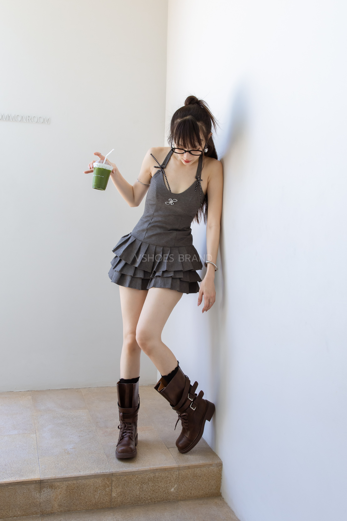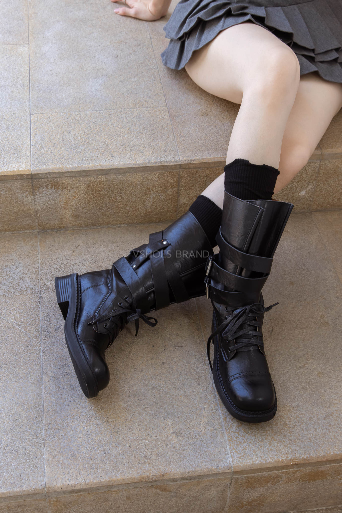 รองเท้าบูทหนัง ข้อสั้น แต่งเชือก + เข็มขัดด้านข้าง