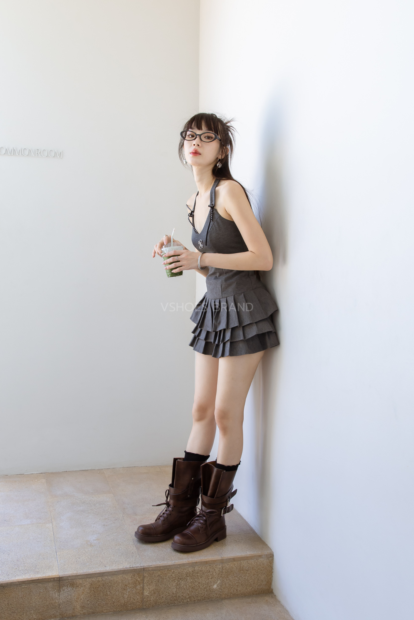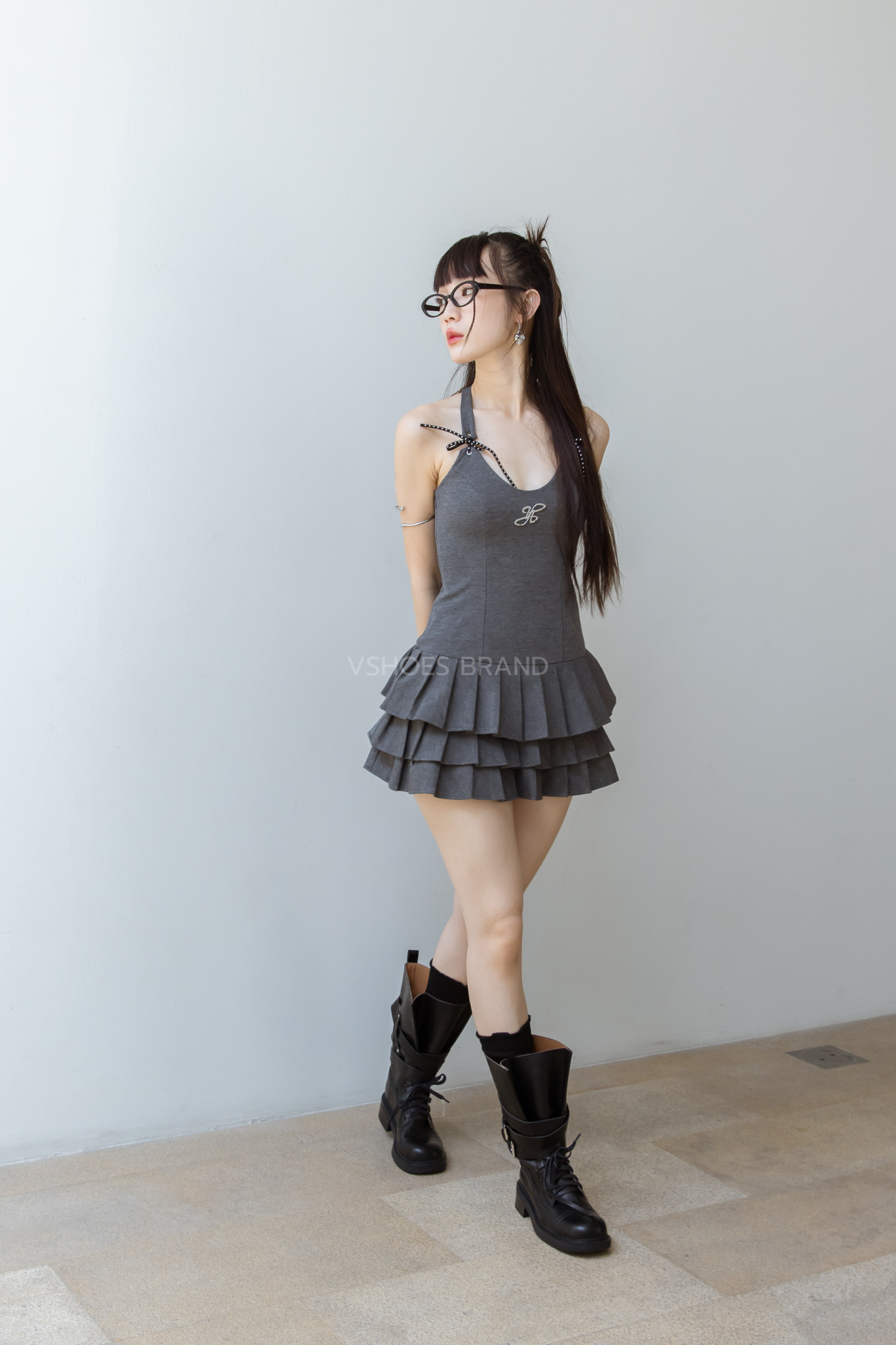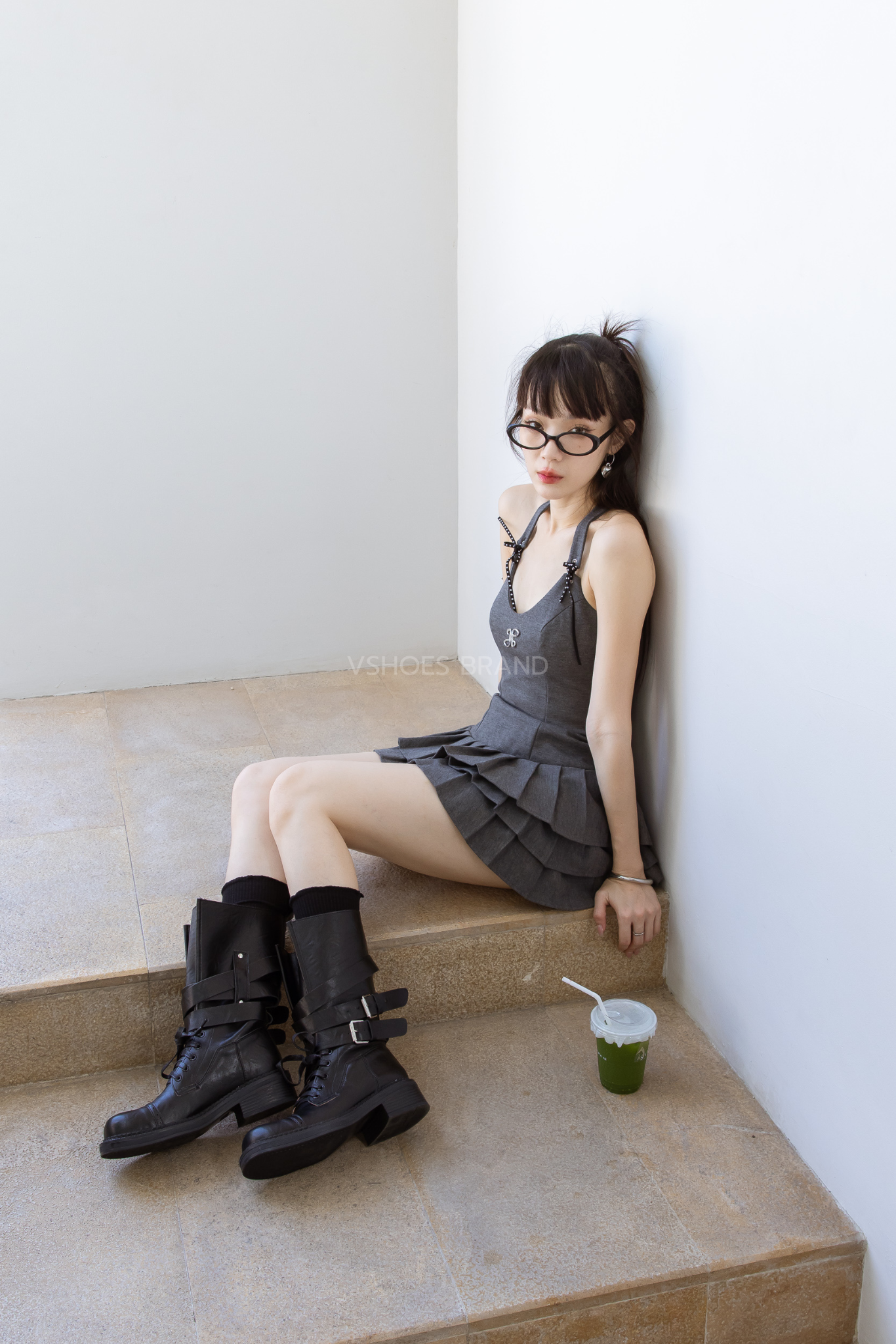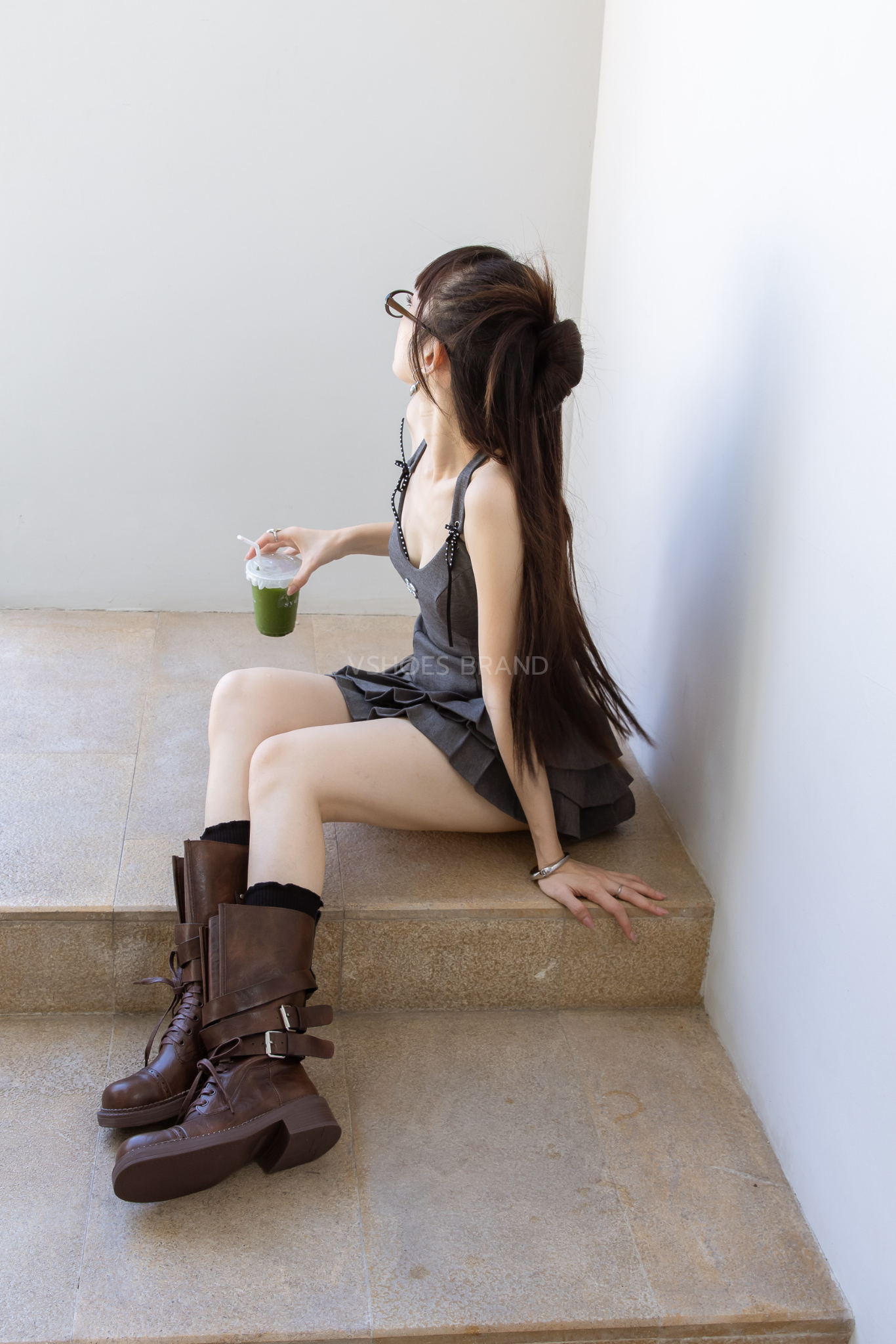 รองเท้าบูทหนัง ข้อสั้น แต่งเชือก + เข็มขัดด้านข้าง