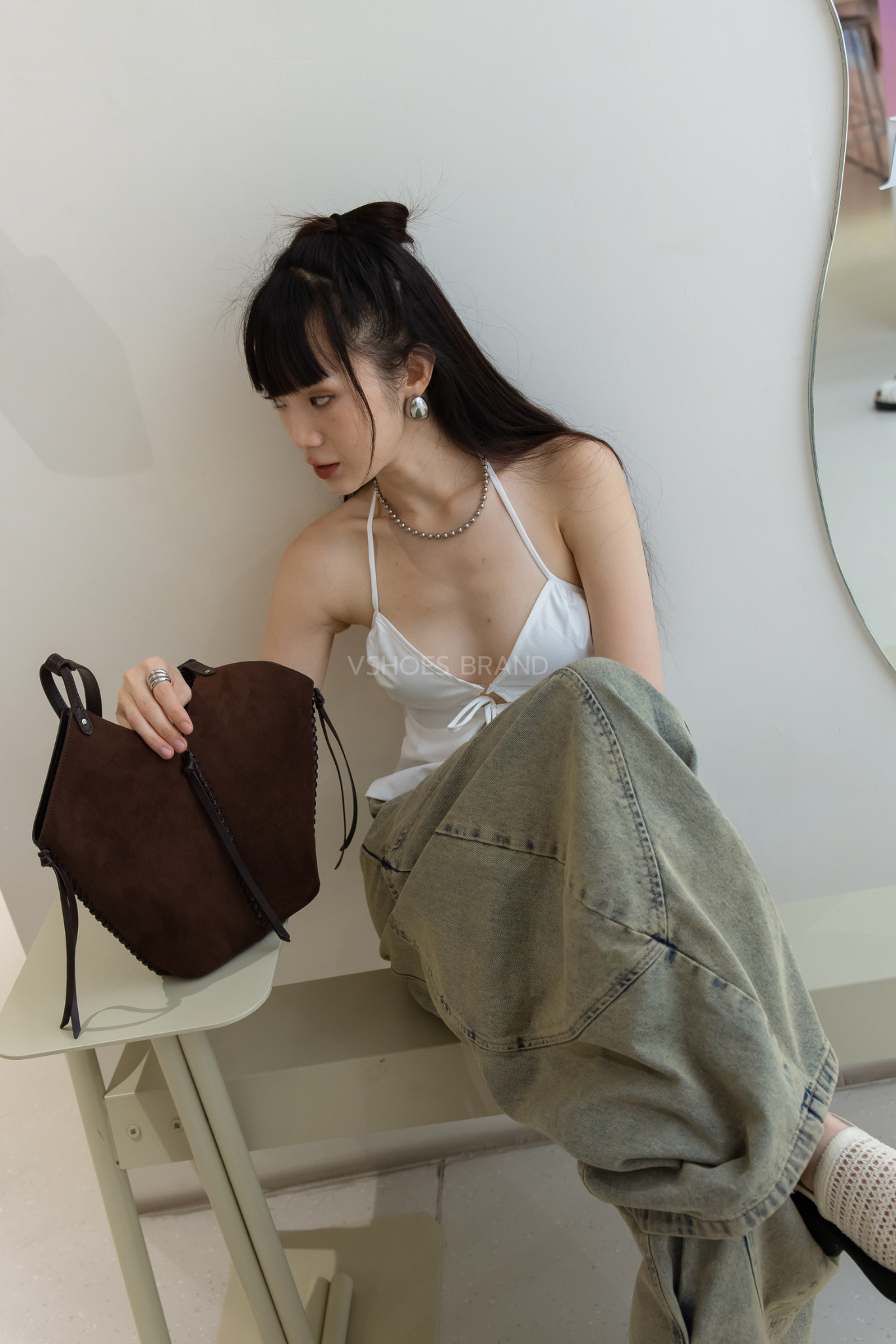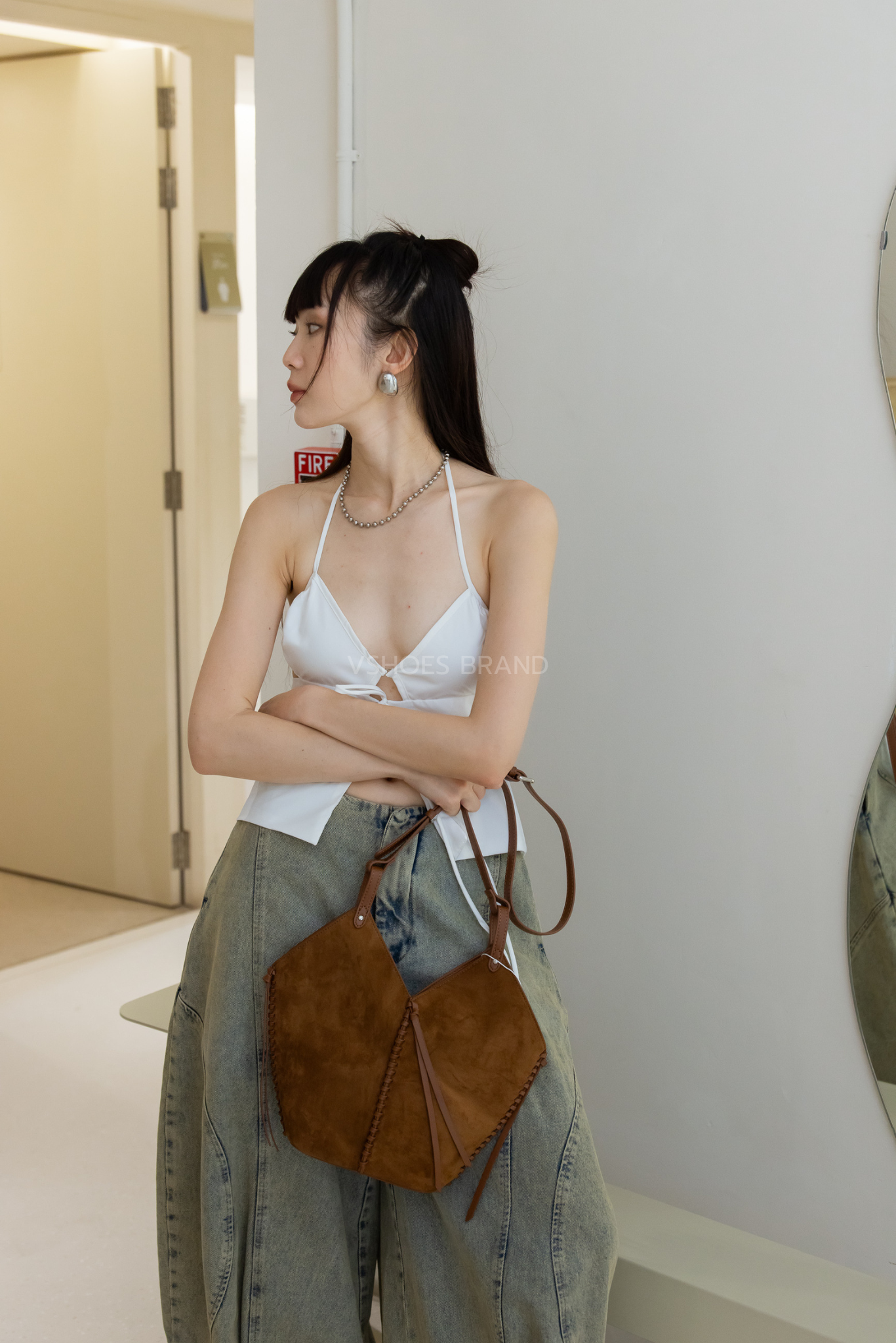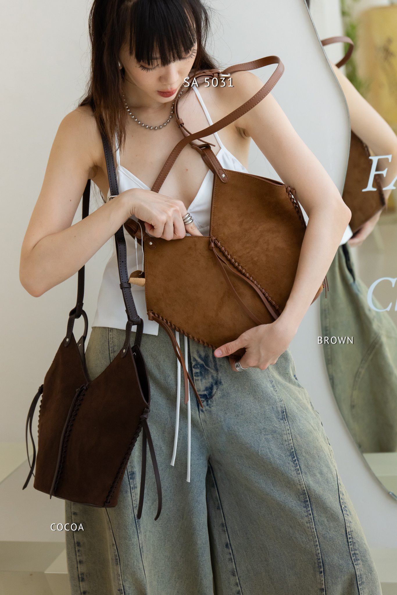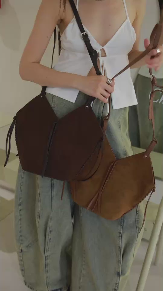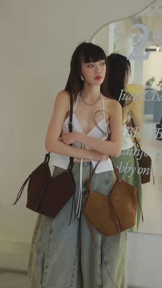 Bucket shaped shoulder bag in suede with braided leather rope trim.
