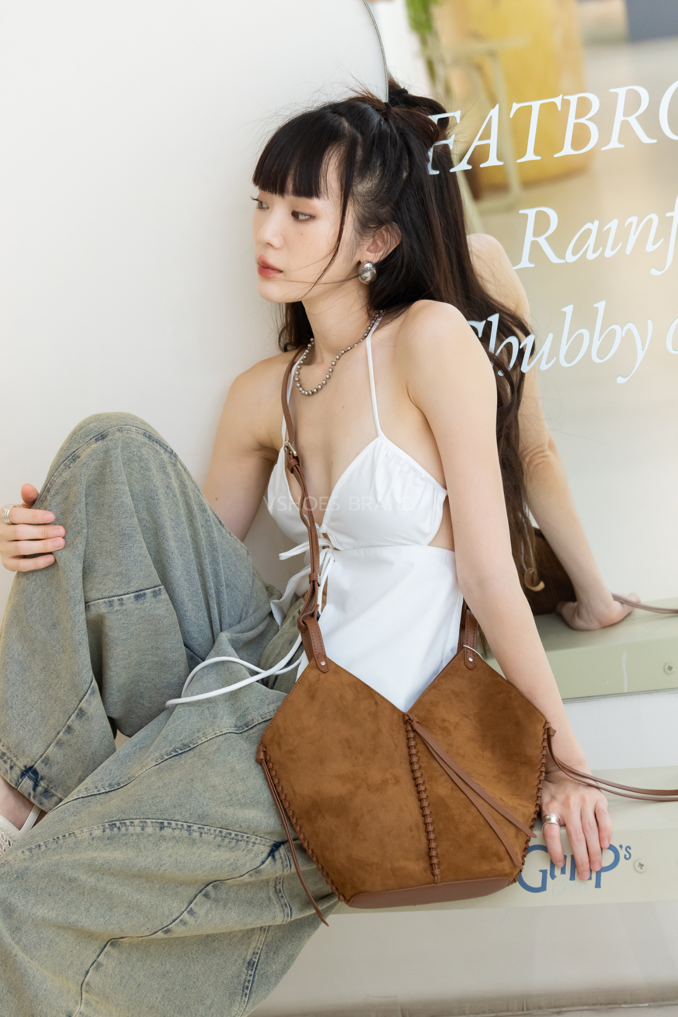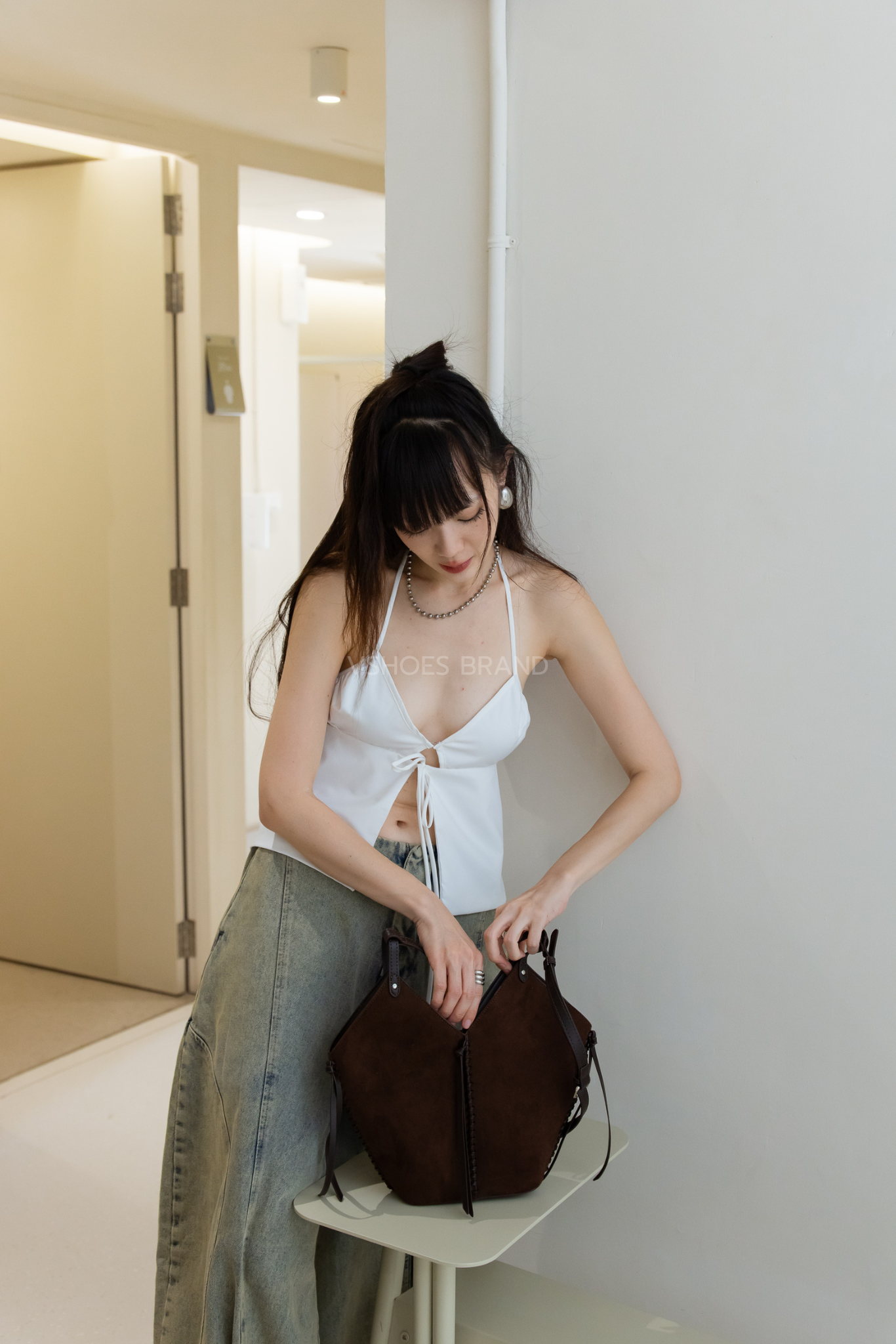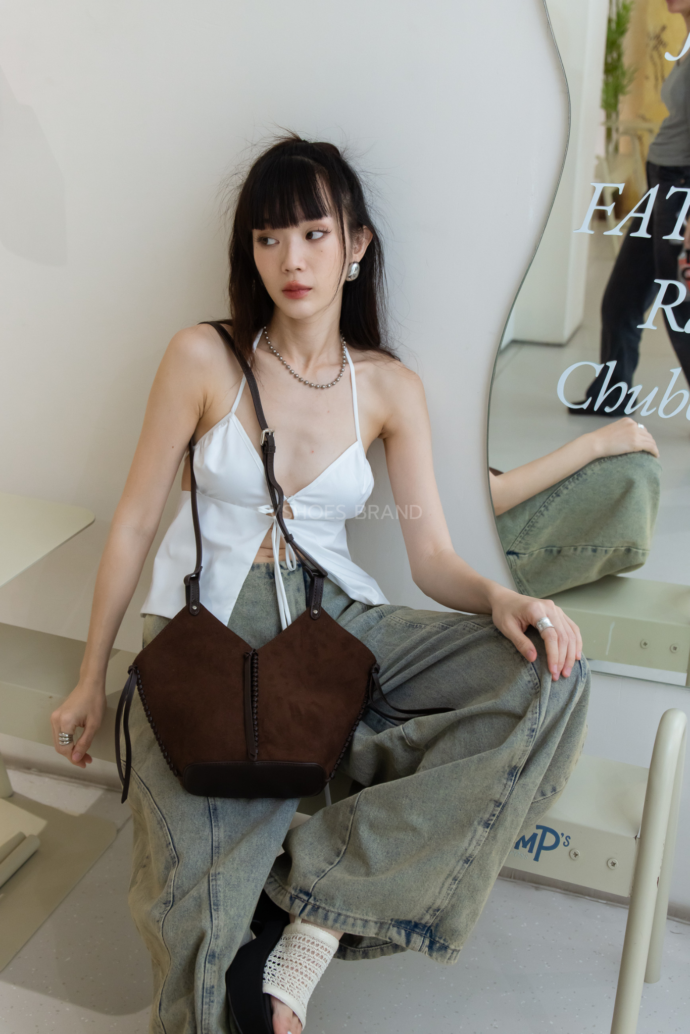 กระเป๋าสะพายไหล่ ทรงถัง หนังกลับ แต่งเชือกหนังถัก