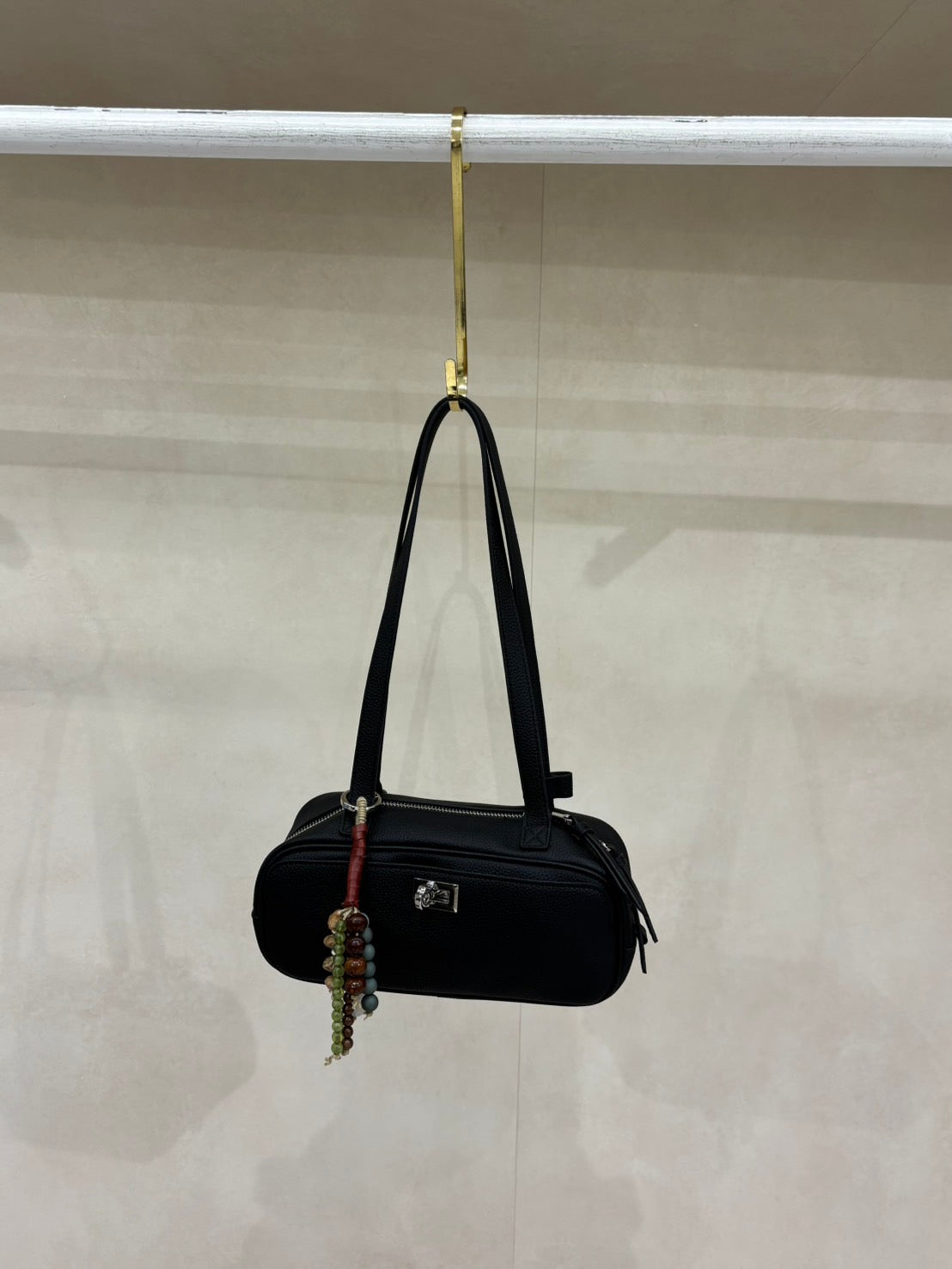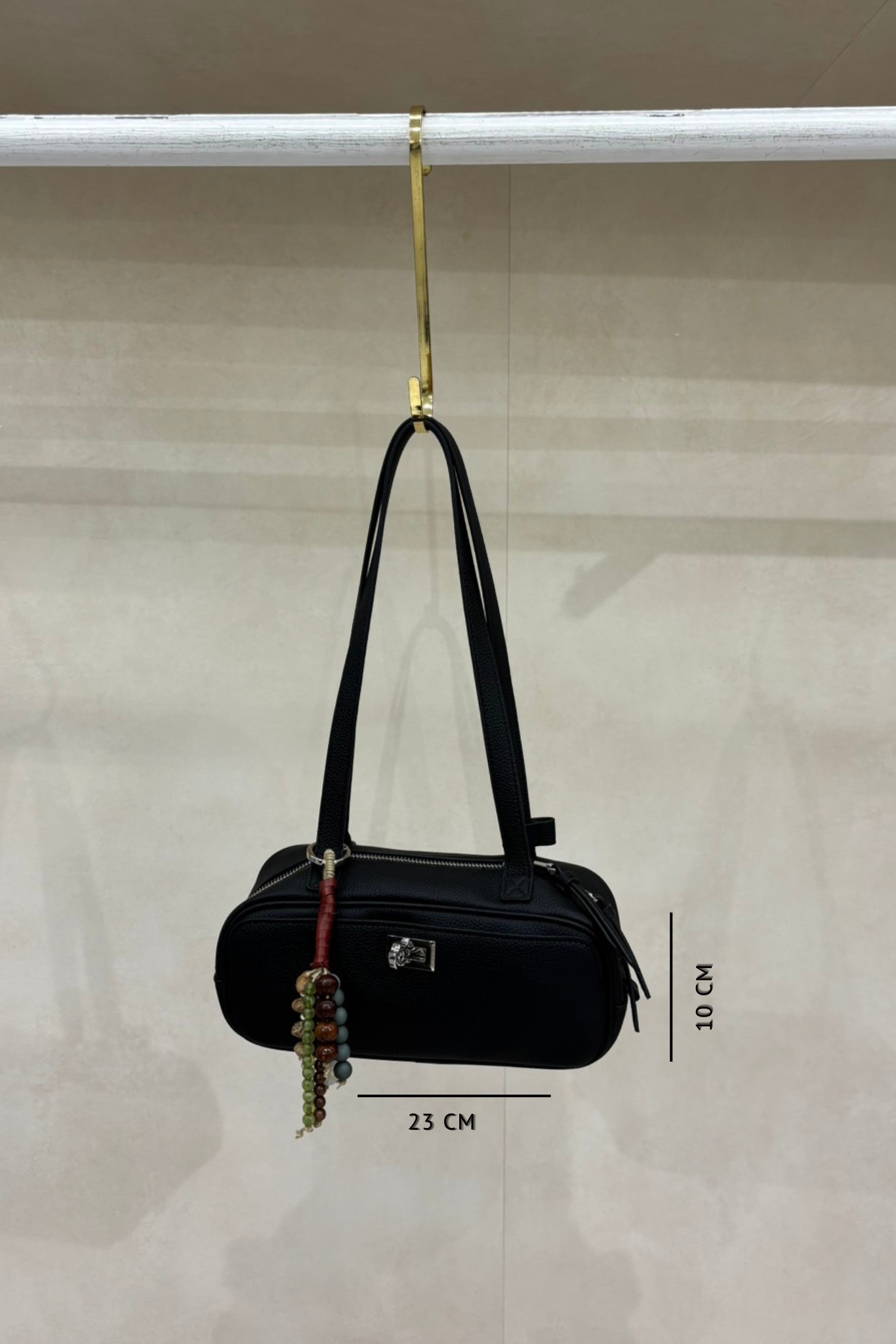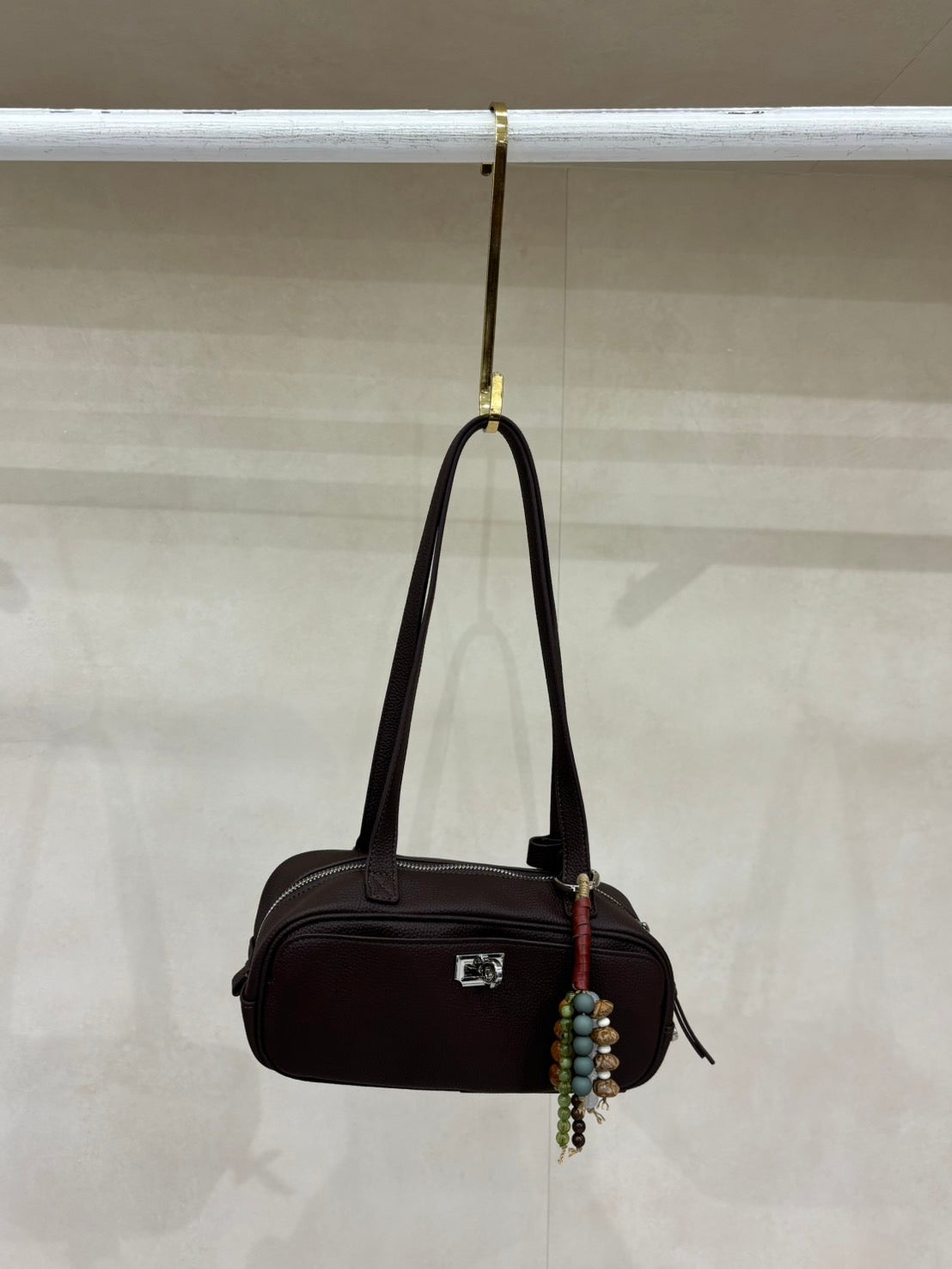 Micro leather shoulder bag, pillow shape, decorated with silver lock accessories, comes with a keychain.