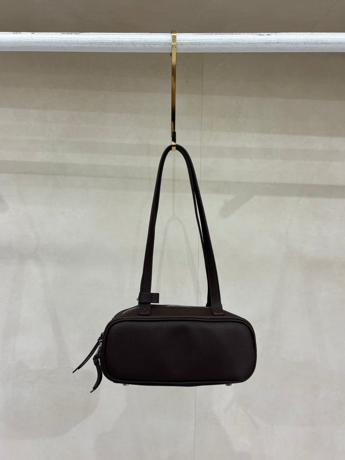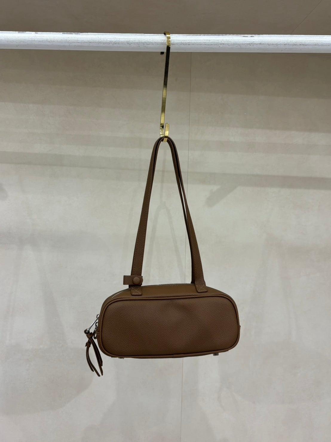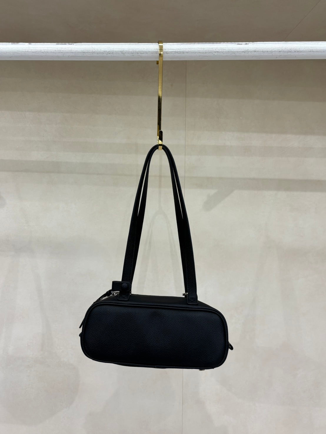 Micro leather shoulder bag, pillow shape, decorated with silver lock accessories, comes with a keychain.
