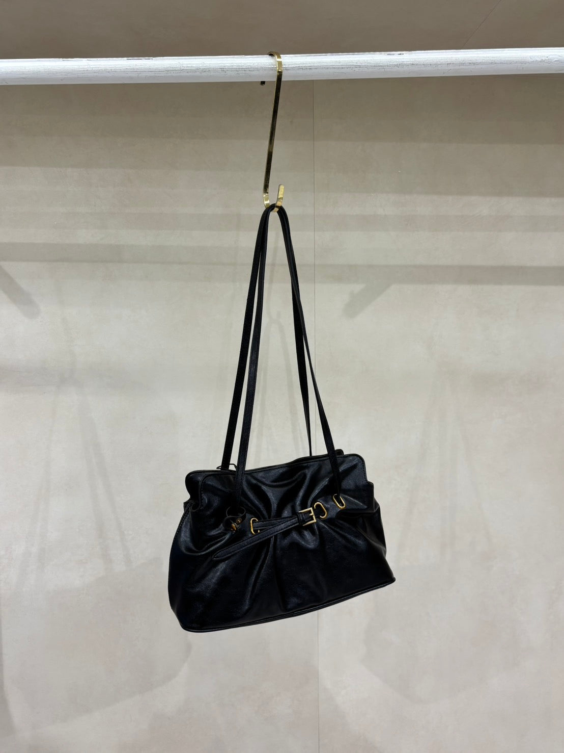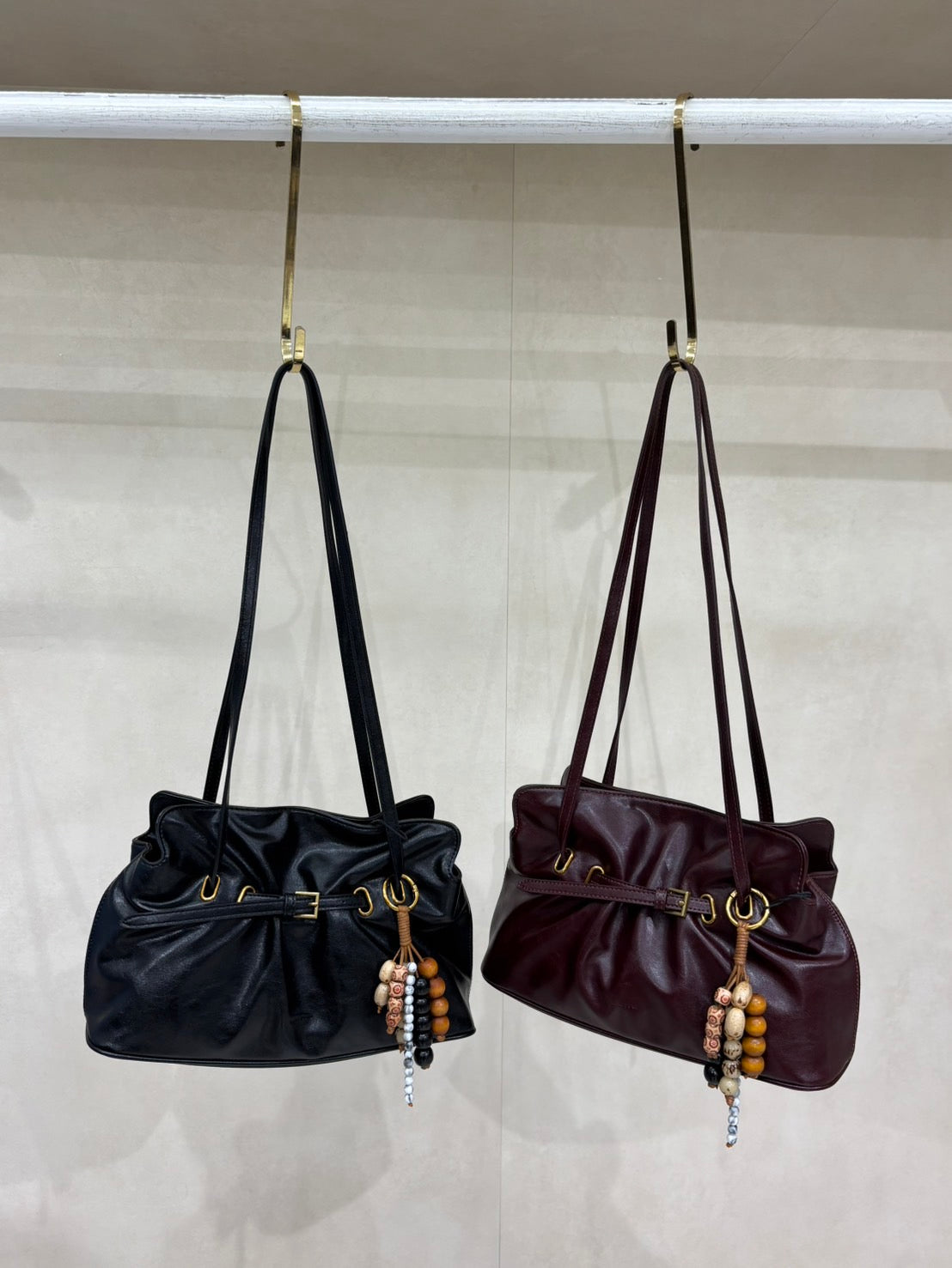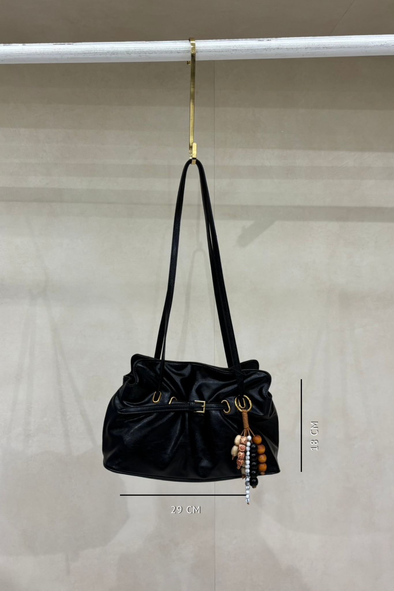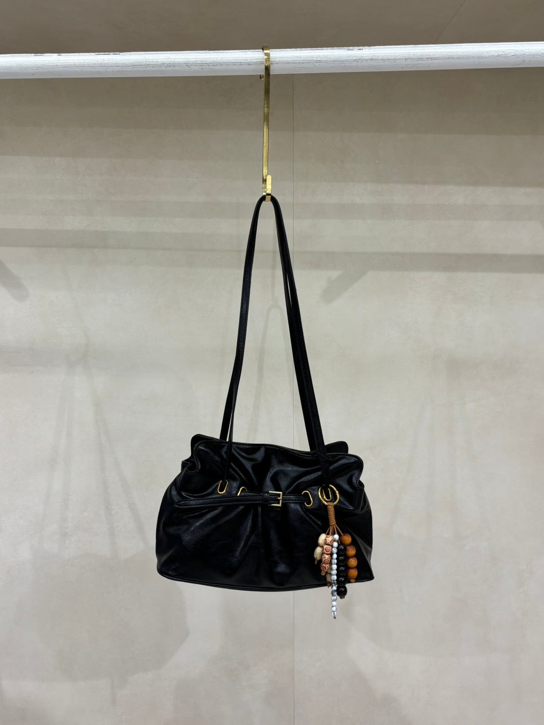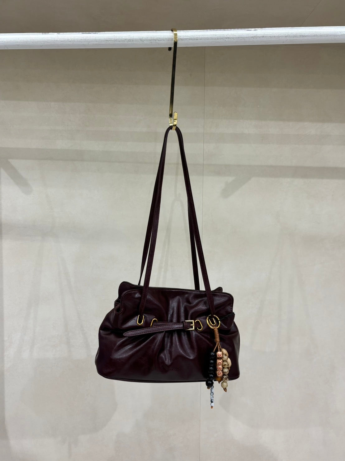 Dumpling shaped shoulder bag with belt and key chain.
