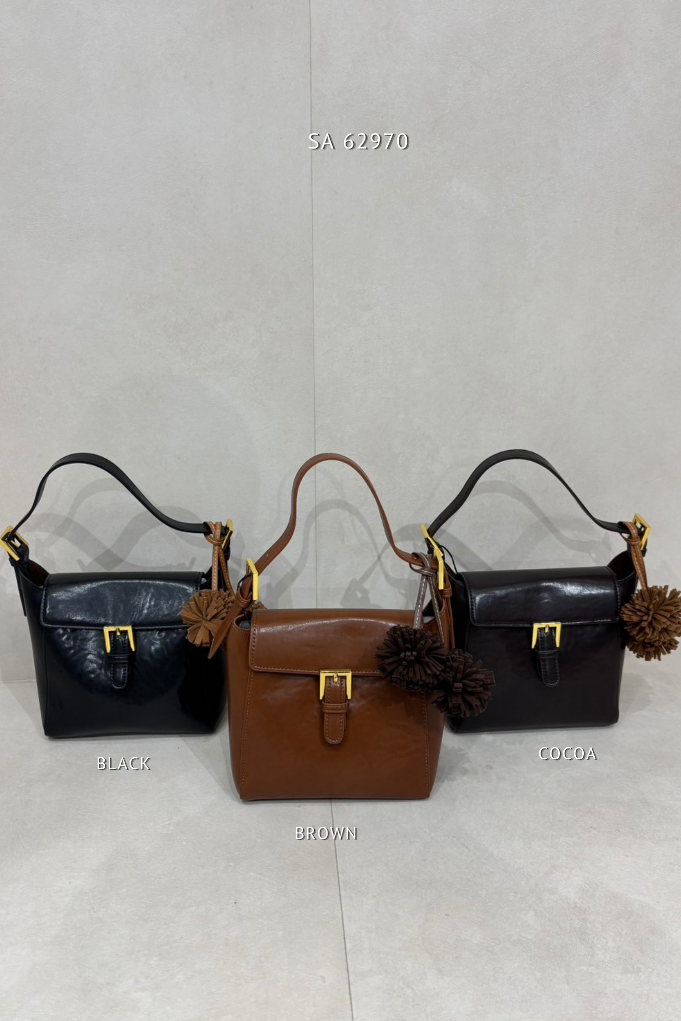 กระเป๋าถือ สะพายไหล่ ทรงถัง แต่งหัวเข็มขัดสีทอง
